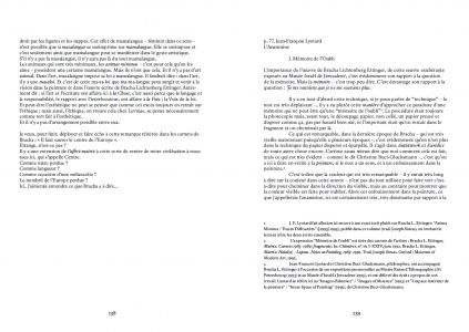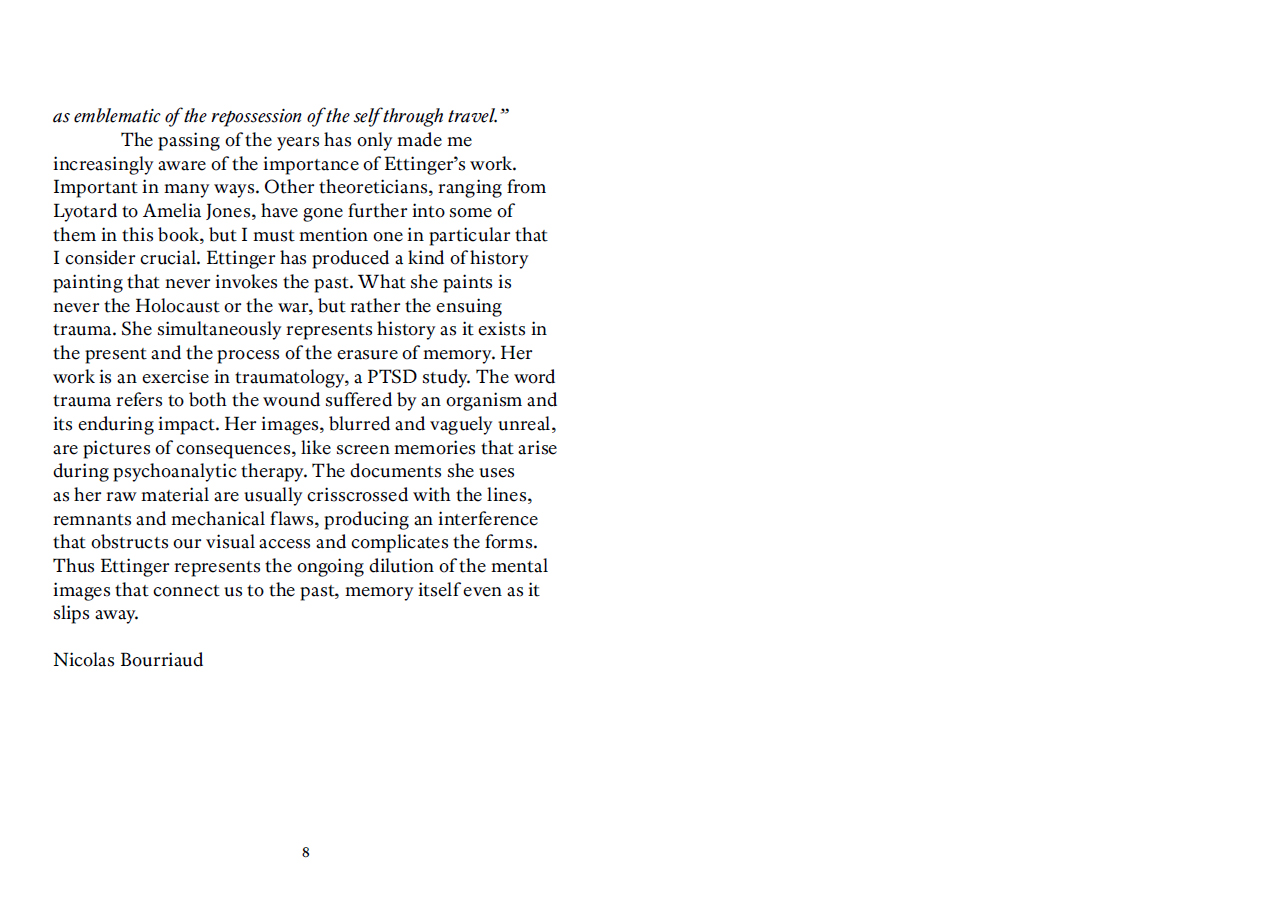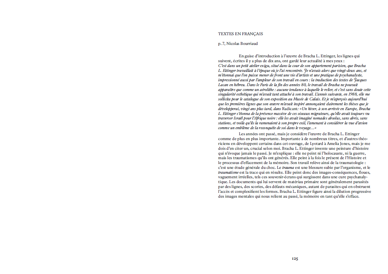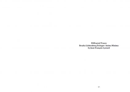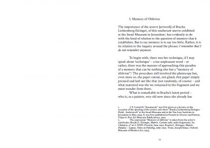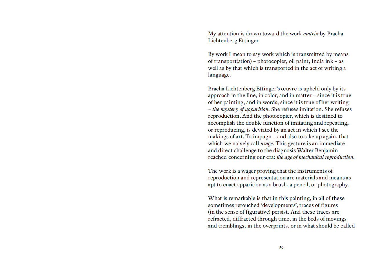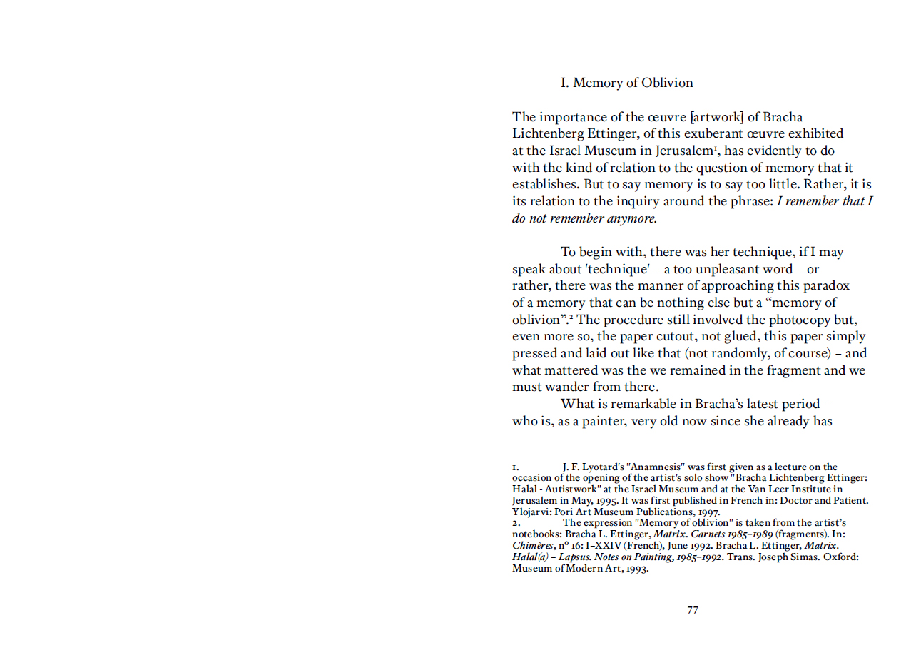 « L'œuvre de Bracha Lichtenberg Ettinger est un travail d'anamnèse, guidé par la présence de la Shoah. Cette présence, comme de la Chose, ne demande rien, elle se fait oublier : déjà par le code secret dont la forclôt l'administration SS de la Endlösung, mais encore sous le nom bénin d'Holocauste, sous les pardons cérémonieux des chefs d'État et d'Église, et encore sous les mémoriaux – autant de modes de l'oubli. »