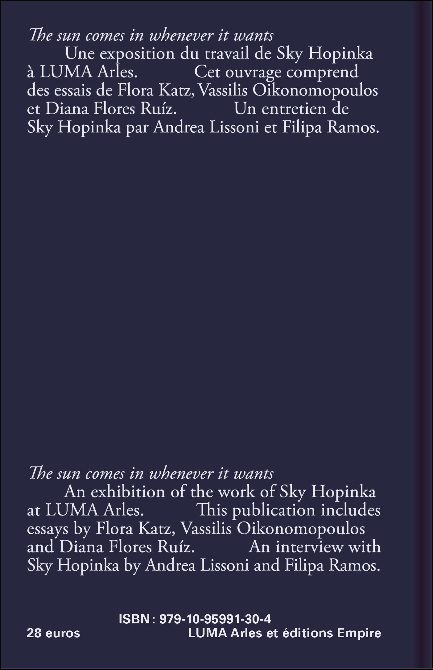 Les vidéos, photos et textes de Sky Hopinka s'articulent autour de positions personnelles sur la patrie et le paysage indigènes, de conceptions de la langue en tant que conteneurs de la culture, exprimées à travers des formes personnelles, documentaires et non fictionnelles de médias. Cette monographie, publiée à l'occasion de sa première exposition majeure en France à LUMA Arles, qui comprend des œuvres vidéo et photographiques anciennes et récentes, comprend des essais de Flora Katz,Vassilis Oikonomopoulos et Diana Flores Ruíz, ainsi qu'un entretien avec Sky Hopinka par Andrea Lissoni et Filipa Ramos.
