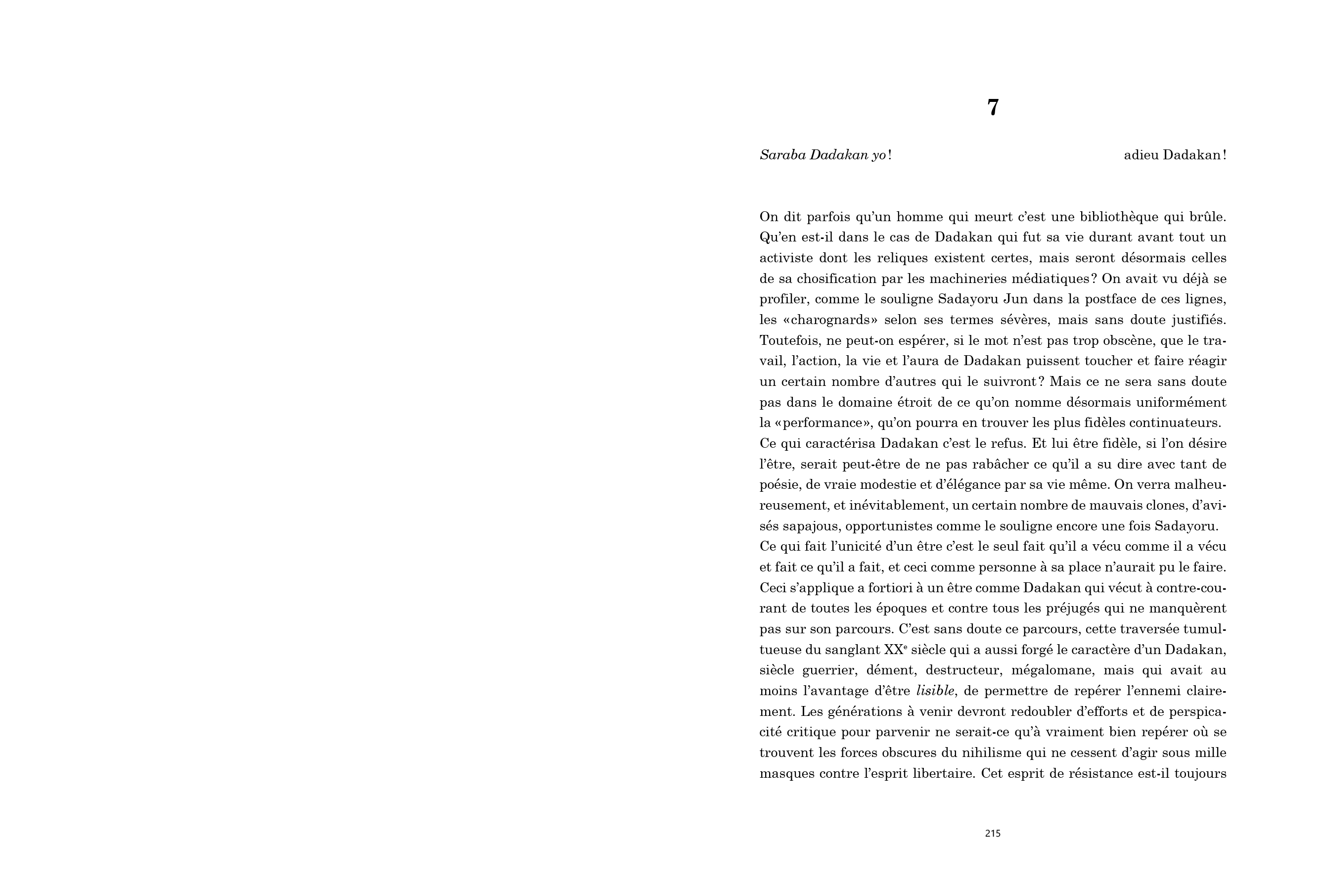 Pierre Klossowski aurait sans doute nommé une anomalie négatrice de la monstruosité industrielle intégrale. A fortiori dans un Japon de l'après-guerre, en plein cœur d'une occidentalisation à outrance, où se bousculent des avant-gardes déjà sur la voie d'une canonisation par les instances nationales et internationales de l'art majuscule. Dadakan fit incontestablement partie des parias de l'art, proche en cela de ses amis du collectif actionniste