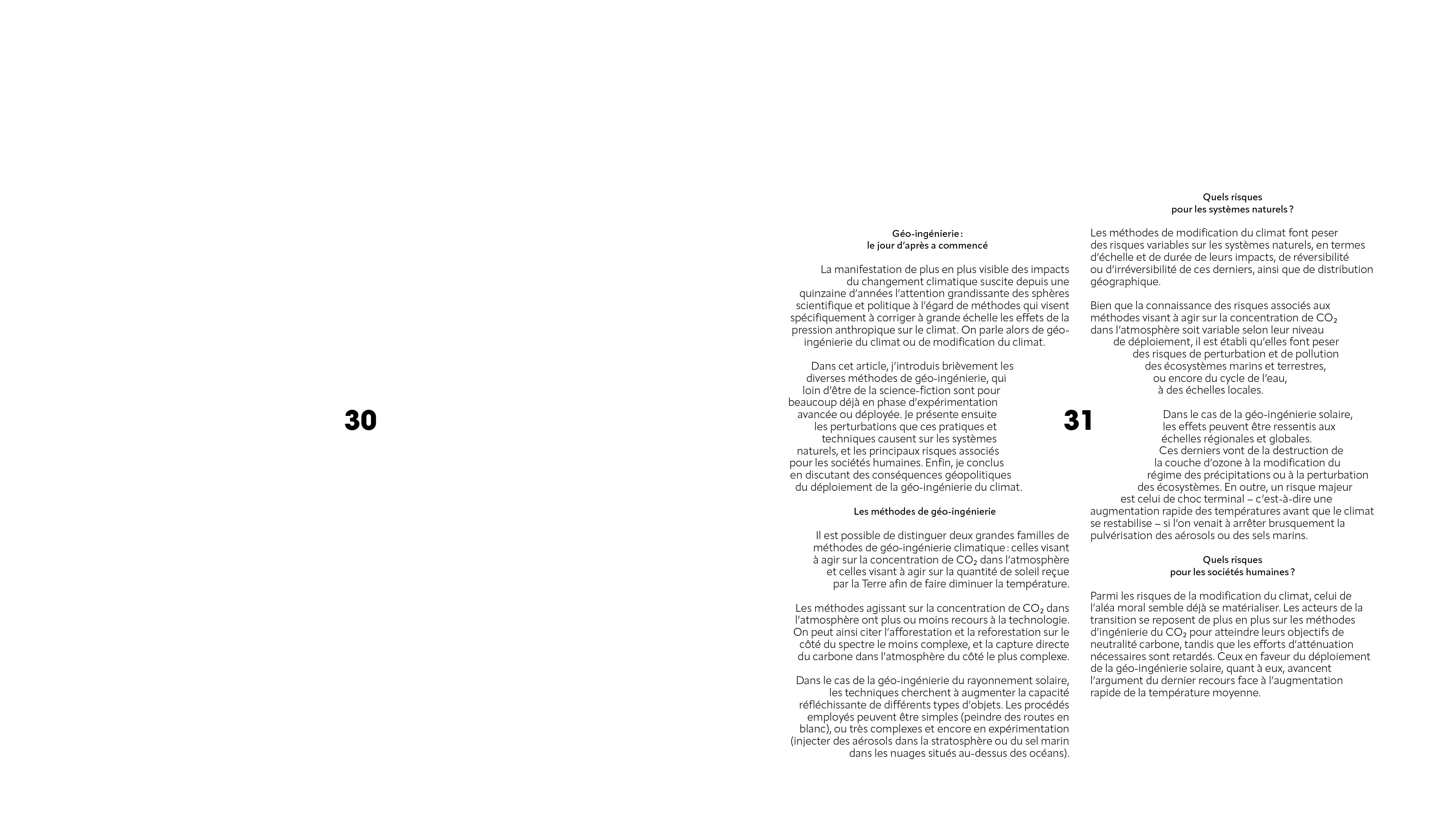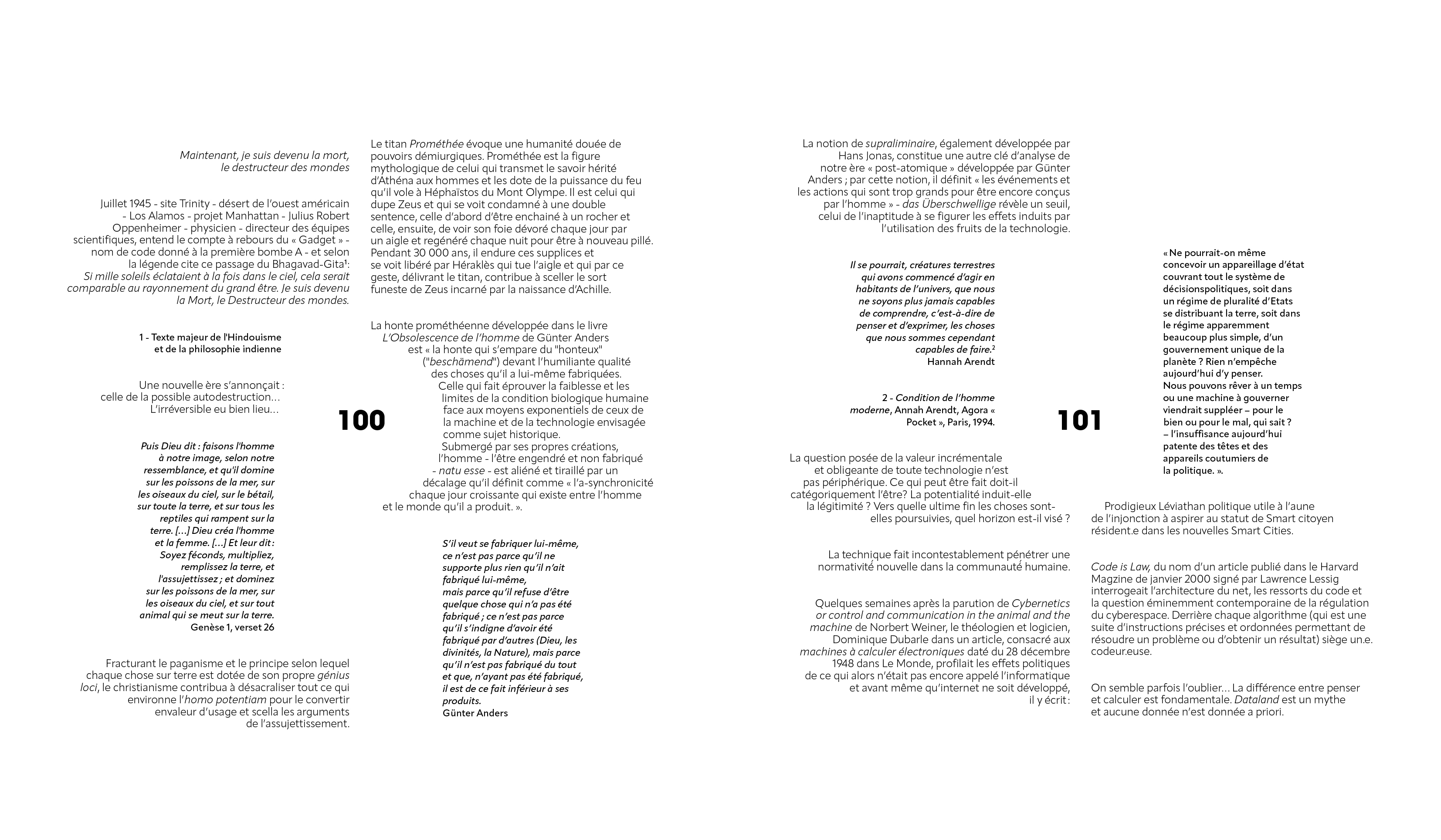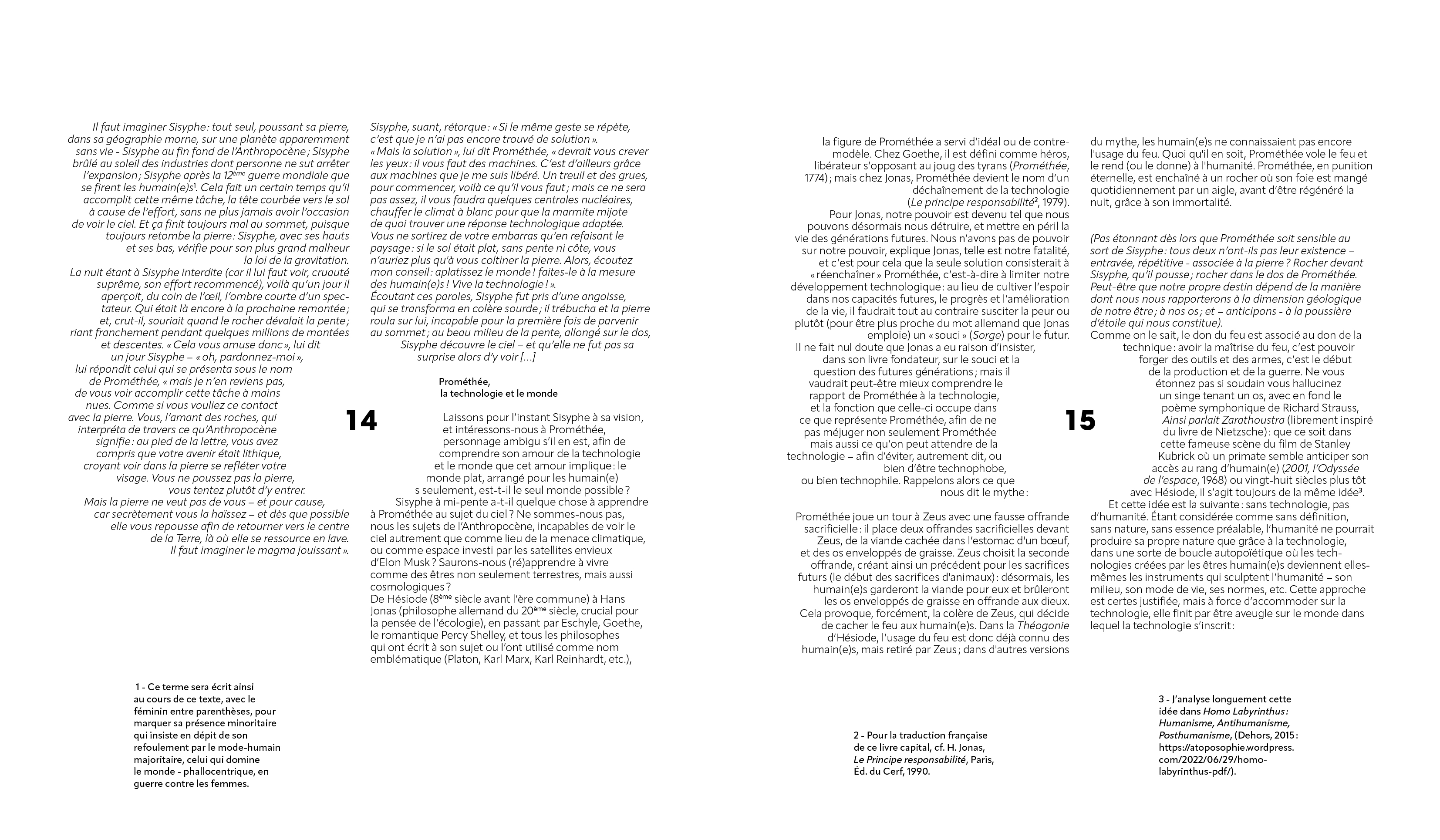 Cet ouvrage convoque ici un ensemble de contributions autour de la figure de Prométhée, pensée et mise en perspective par Stéphanie Pécourt, Directrice du Centre Wallonie Bruxelles à Paris. De cette parole, viennent ensuite s'articuler un ensemble de réflexions, celles de Nathalie Grandjean, Docteure en philosophie, Maîtresse de conférences autour de questions sur le corps, la technologie et la philosophie féministe qu'elle met notamment en regard de la pensée de Donna Haraway. Sofia Kabbej, chercheuse au sein du Pôle Climat partage quant à elle ses travaux actuels sur les impacts des changements climatiques et la géo-ingénierie du climat.