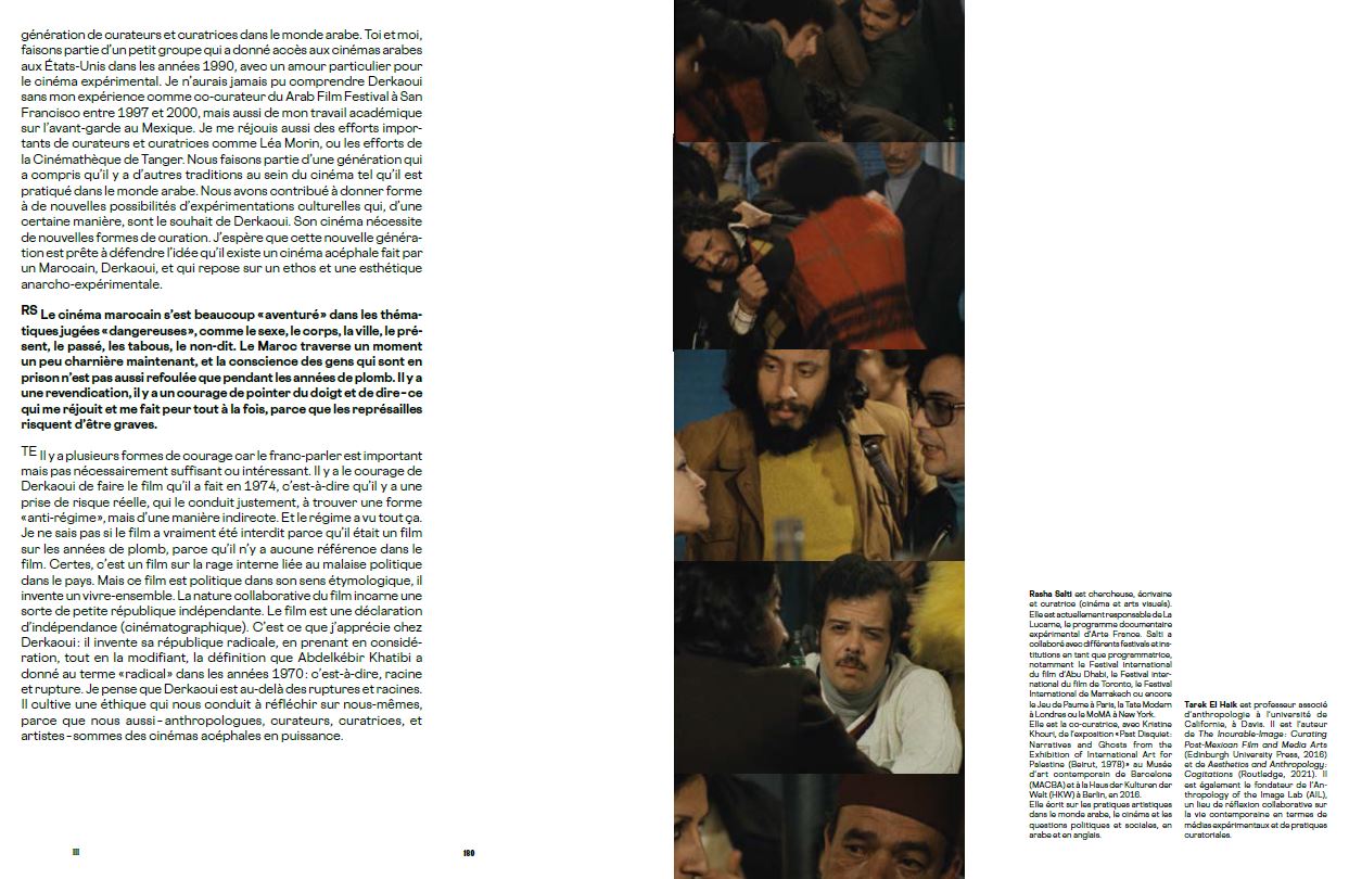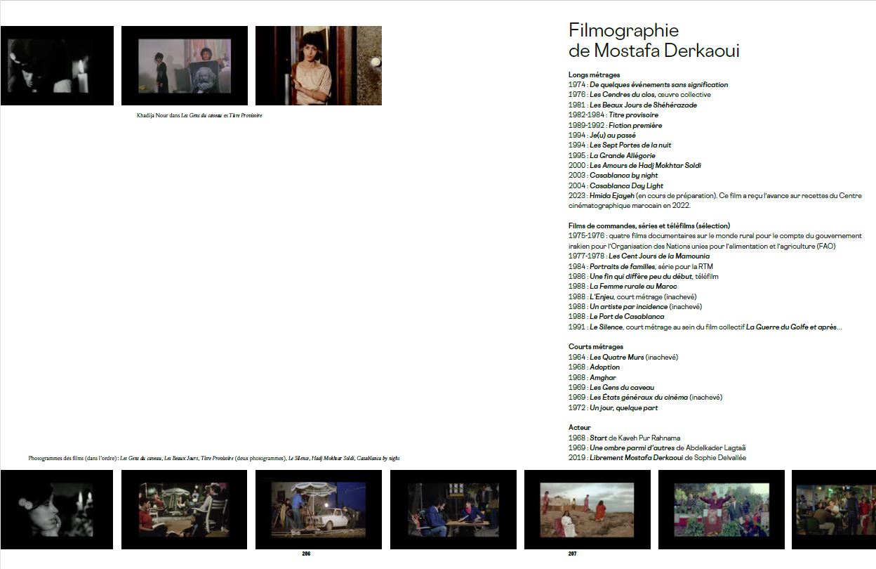 Textes de Ahmed Boughaba, Nadir Bouhmouch, Tarek Elhaik, Ali Essafi, Filmoteca de Catalunya (Rosa Cardona, Mariona Bruzzo et Esteve Riambau), Mohamed Jibril, Toni Maraini, Léa Morin, Mostafa Nissabouri, Marie Pierre-Bouthier, Noureddine Saïl, Rasha Salti et Monika Talarczyk.