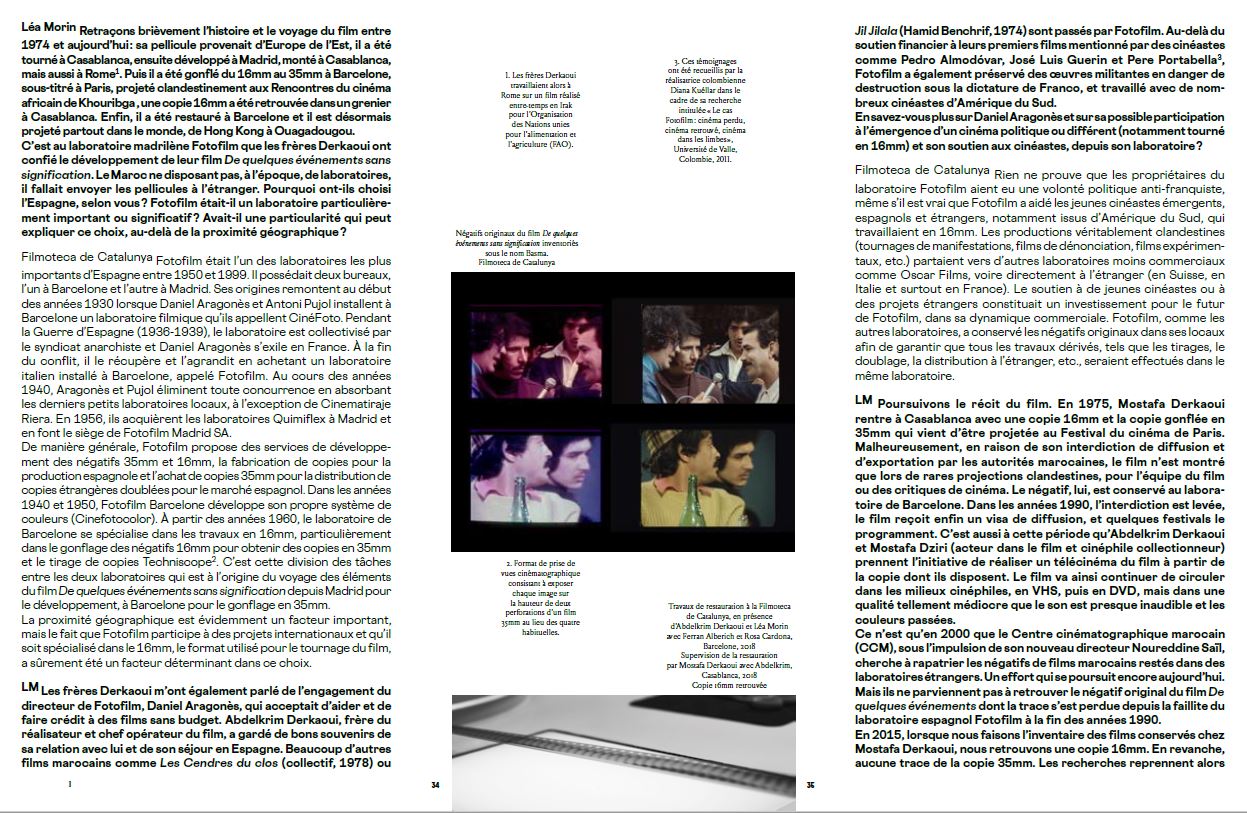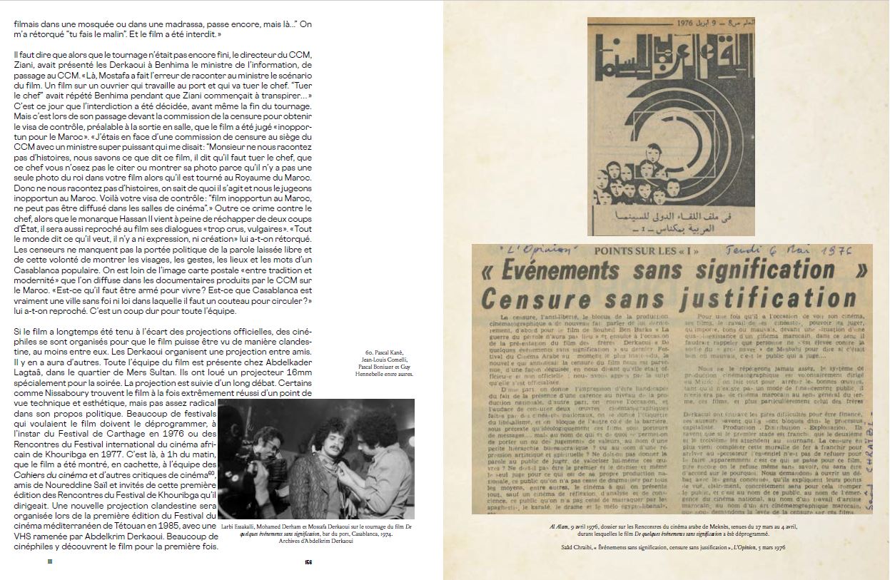 Cet ouvrage présente la recherche de Léa Morin autour du premier film, longtemps invisible, du cinéaste marocain Mostafa Derkaoui De quelques évènements sans signification (1974), qui a conduit à sa récente restauration et diffusion internationale. Loin de se cantonner à une histoire cinématographique, ce « livre-archive, livre-enquête, livre-action » esquisse à partir des pistes multiples ouvertes par le film, une constellation de micro-histoires qui sont autant de réflexions et propositions de récits à faire émerger sur le Maroc culturel, artistique et politique des années 1970.