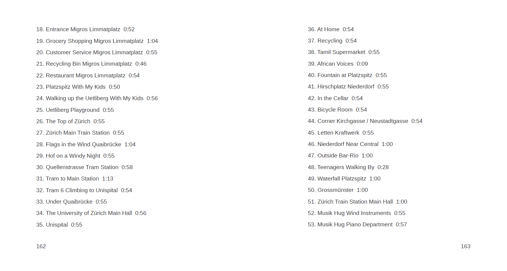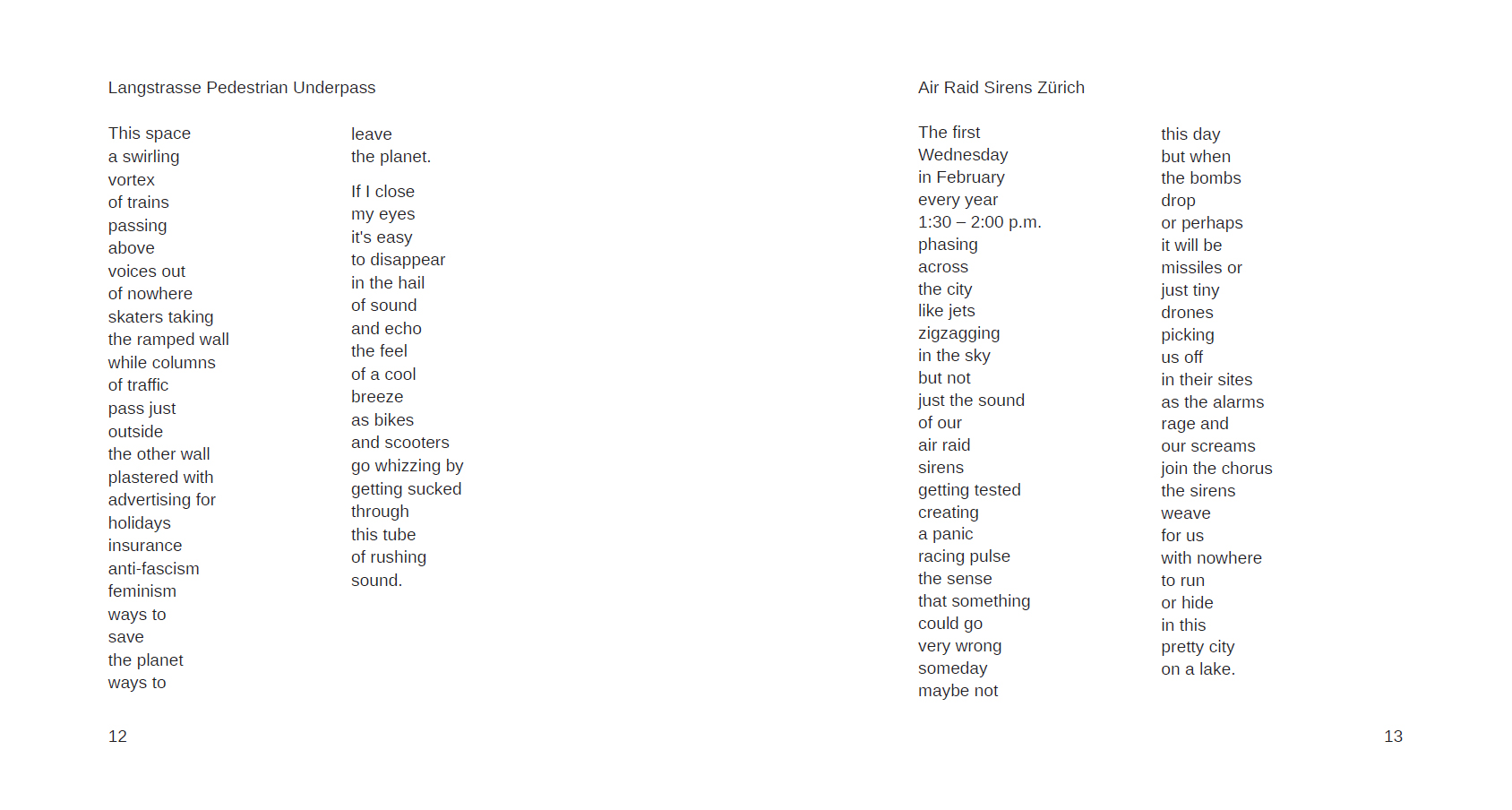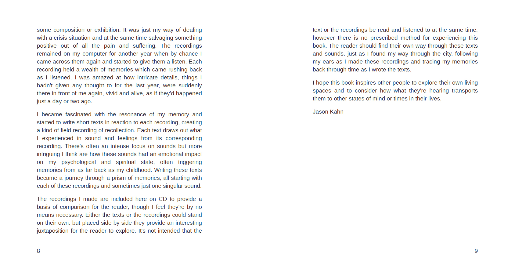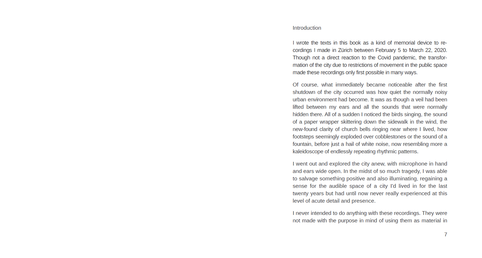 Un recueil de 77 textes de Jason Kahn, chaque texte ayant été écrit en réponse à un enregistrement de terrain réalisé par l'artiste sonore à Zurich en février-mars 2020 (CD audio contenant les 77 enregistrements inclus) : une cartographie poétique et sonore qui rend compte de la constitution du lieu par la manière dont il « sonne ».