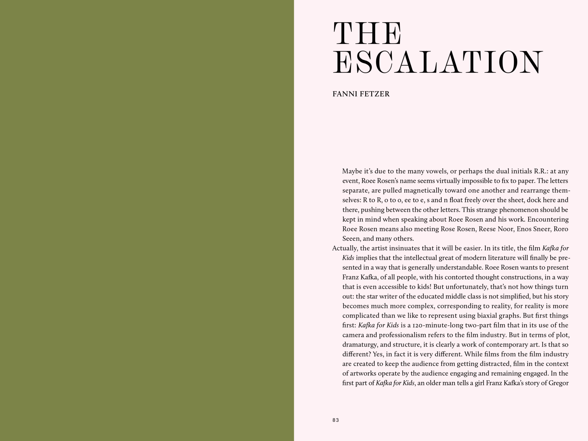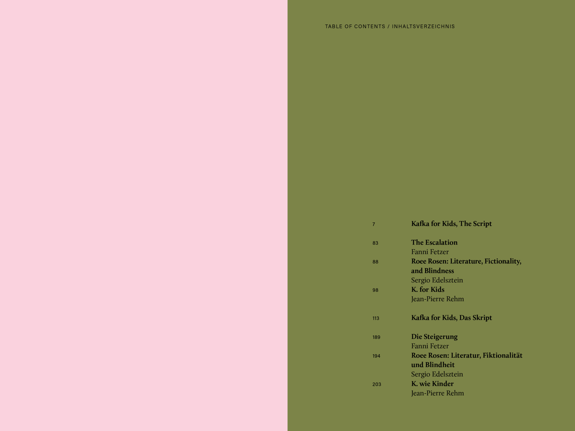 Ouvrage basé sur le film Kafka For Kids de Roee Rosen, à la croisée des genres, mélangeant fiction, documentaire et comédie musicale. Le droit en tant que thème central dans l'œuvre de Kafka, et le fait que le film est censé s'adresser à des enfants, permettent de révéler les façons complexes et troublantes dont la loi militaire israélienne définit juridiquement l'enfance dans les territoires palestiniens occupés.