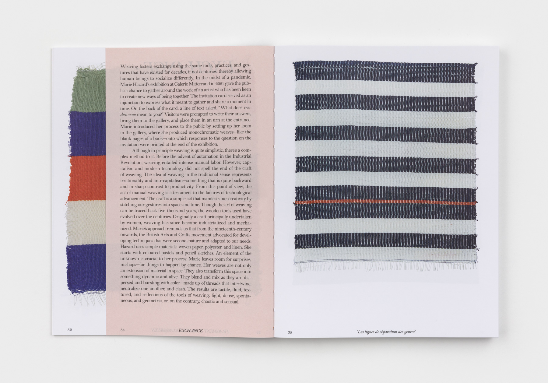 pratique artisanale. Entre peinture, sculpture et installation, les œuvres tissées de Marie Hazard font appel à une grande méticulosité qui n'enlève en rien à la spontanéité de son travail. Elle s'inspire librement de la sociologie culturelle et en particulier de la mode dont elle suit le développement historique, les usages et les techniques. En imprimant par exemple des maillots de basket sur ses tissages, elle incite le spectateur à se les réapproprier en évoquant leur fonction utilitaire et leur plaisir tactile.