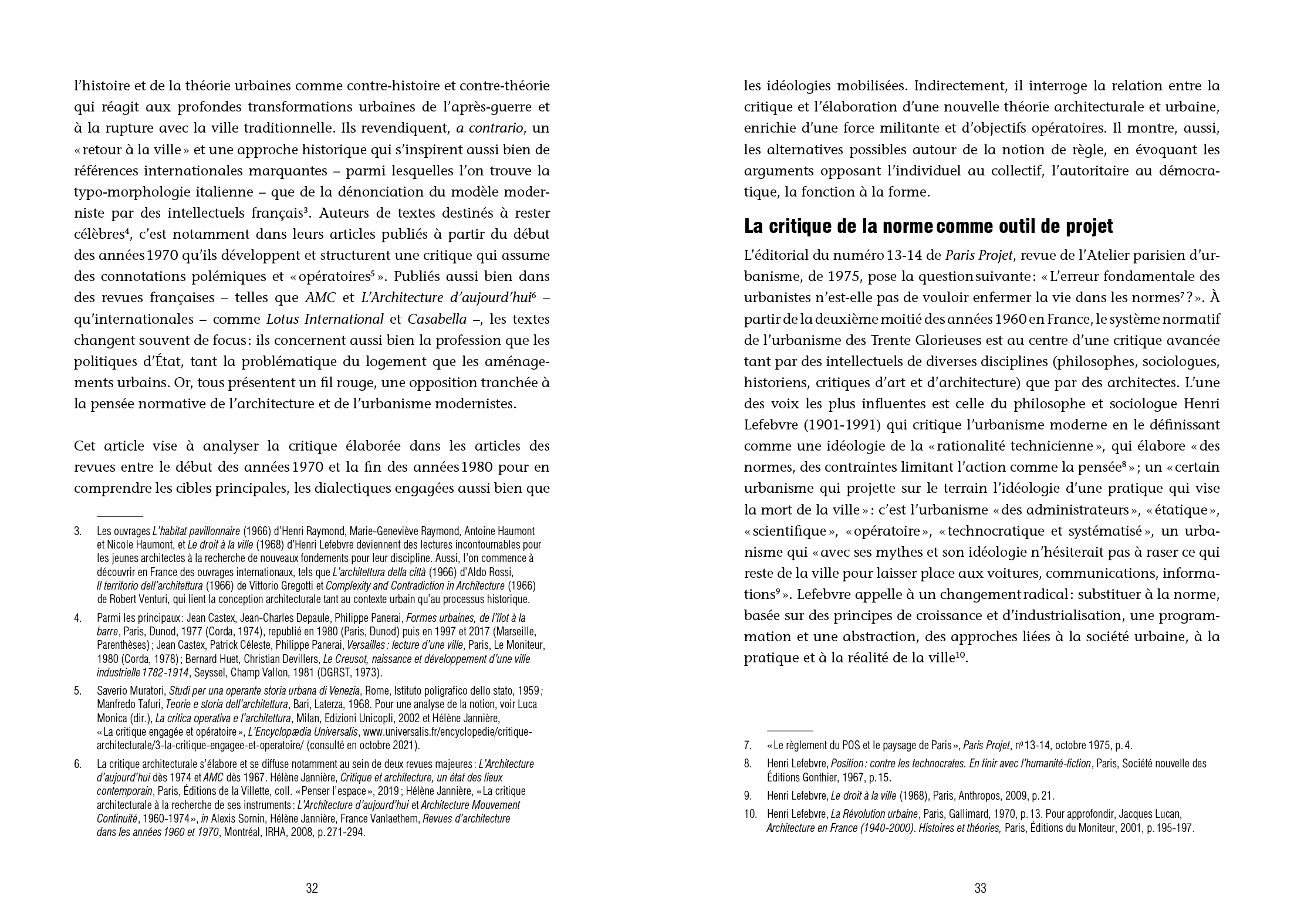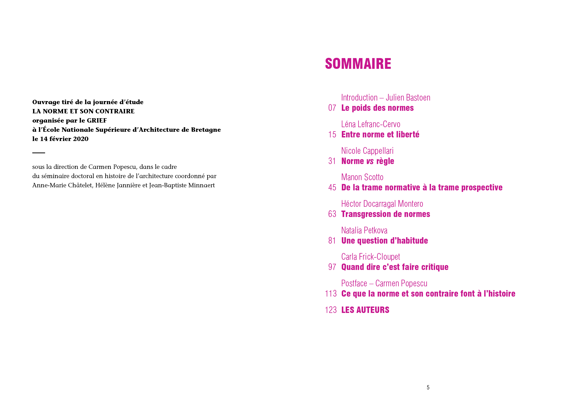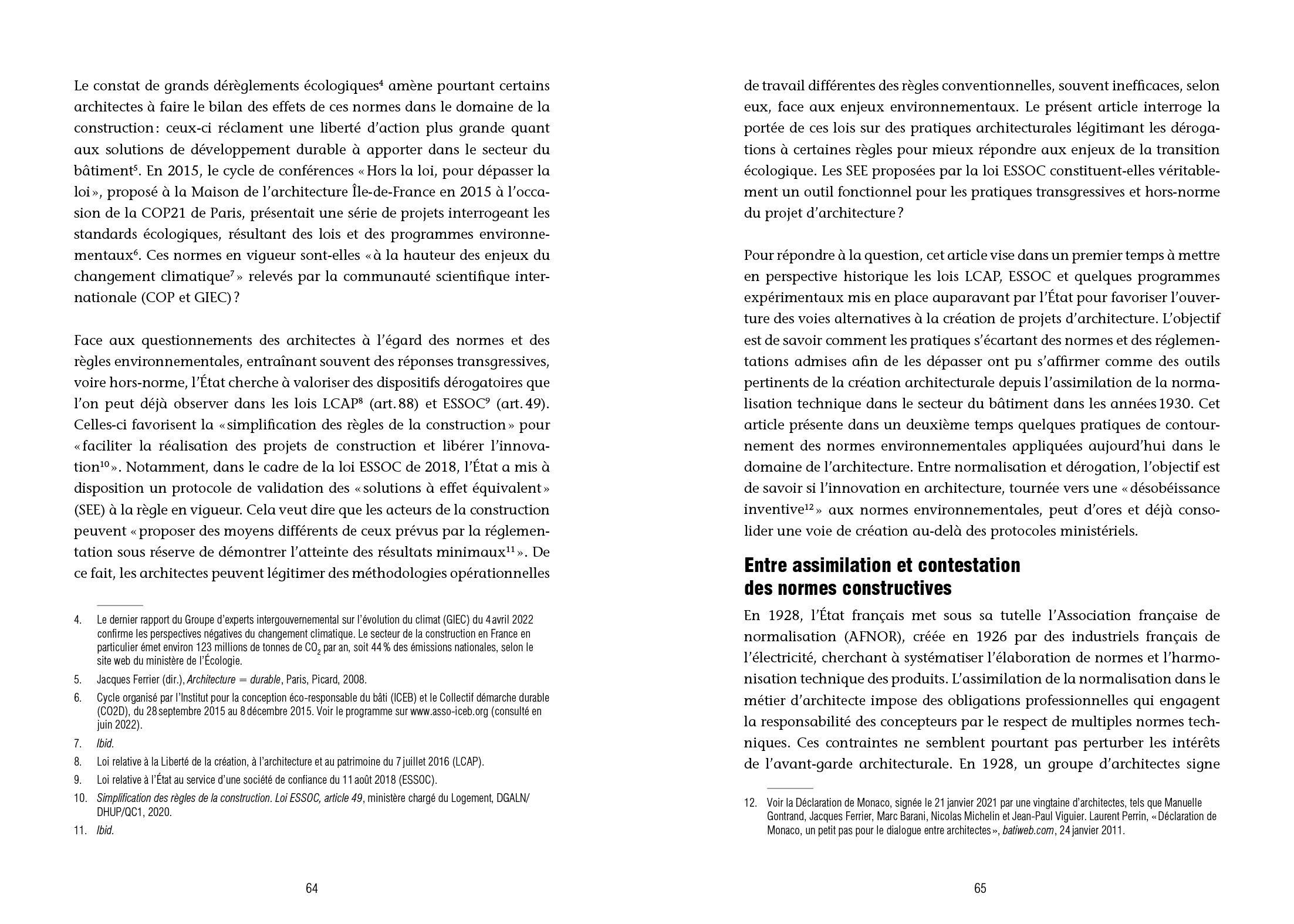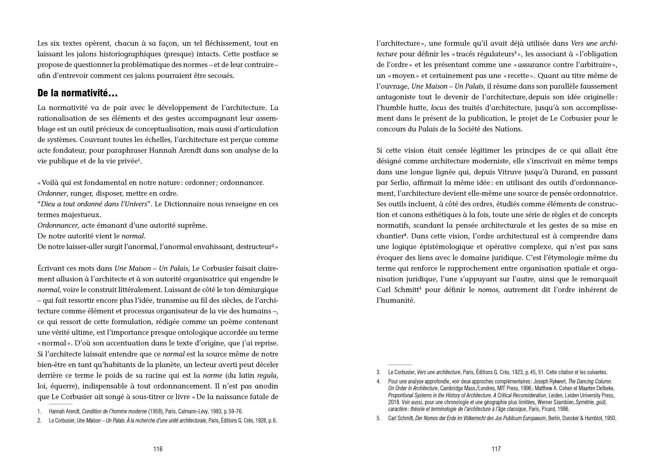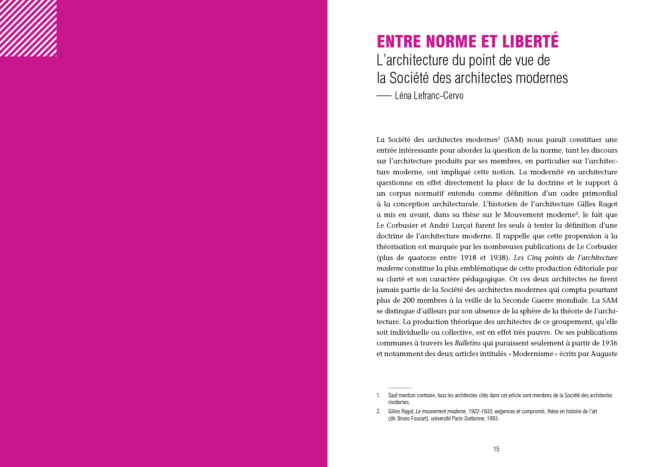 - « Entre norme et liberté pendant l'entre-deux-guerres » étudie le positionnement de la Société des architectes modernes par rapport aux normativités académique et fonctionnaliste.