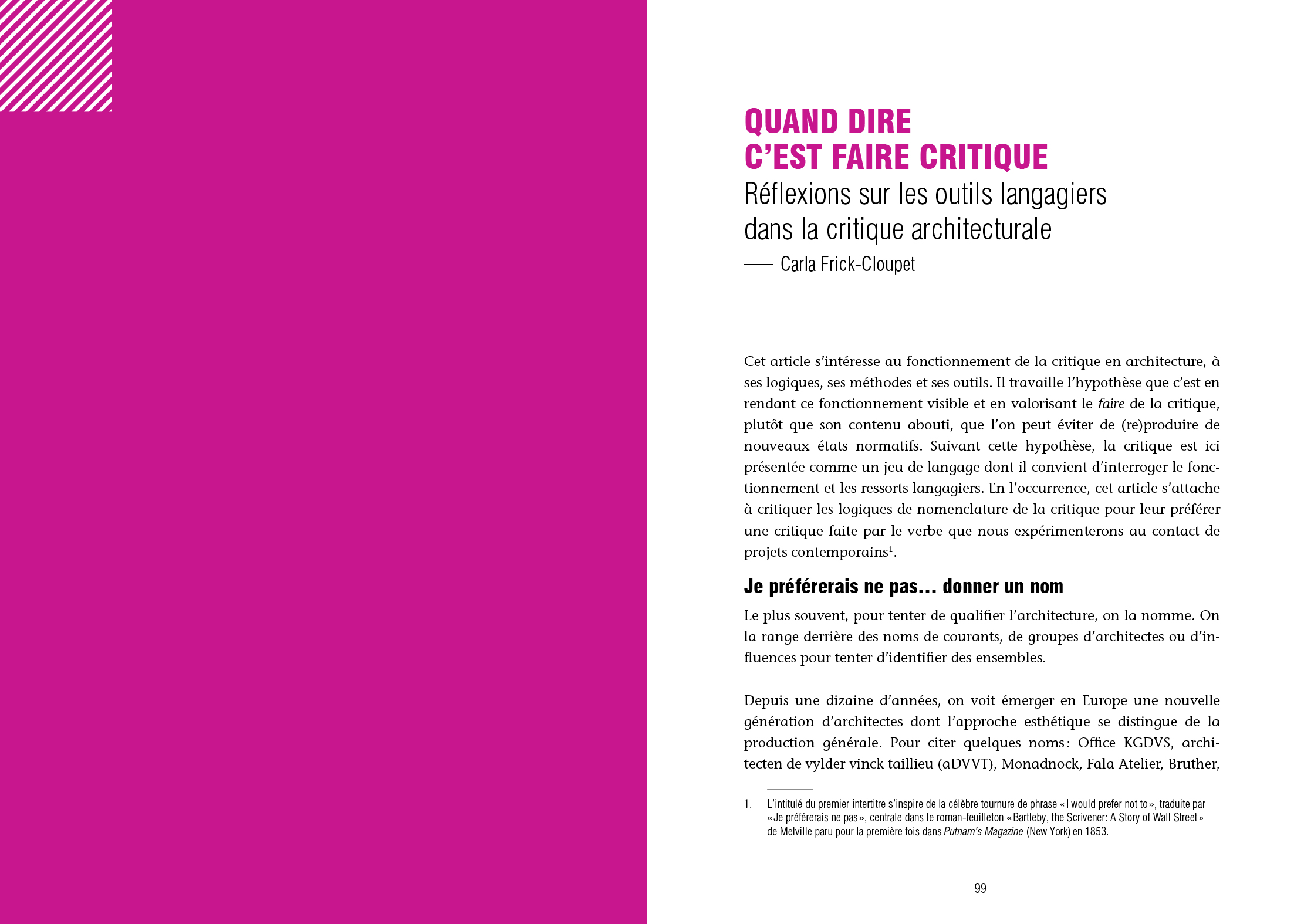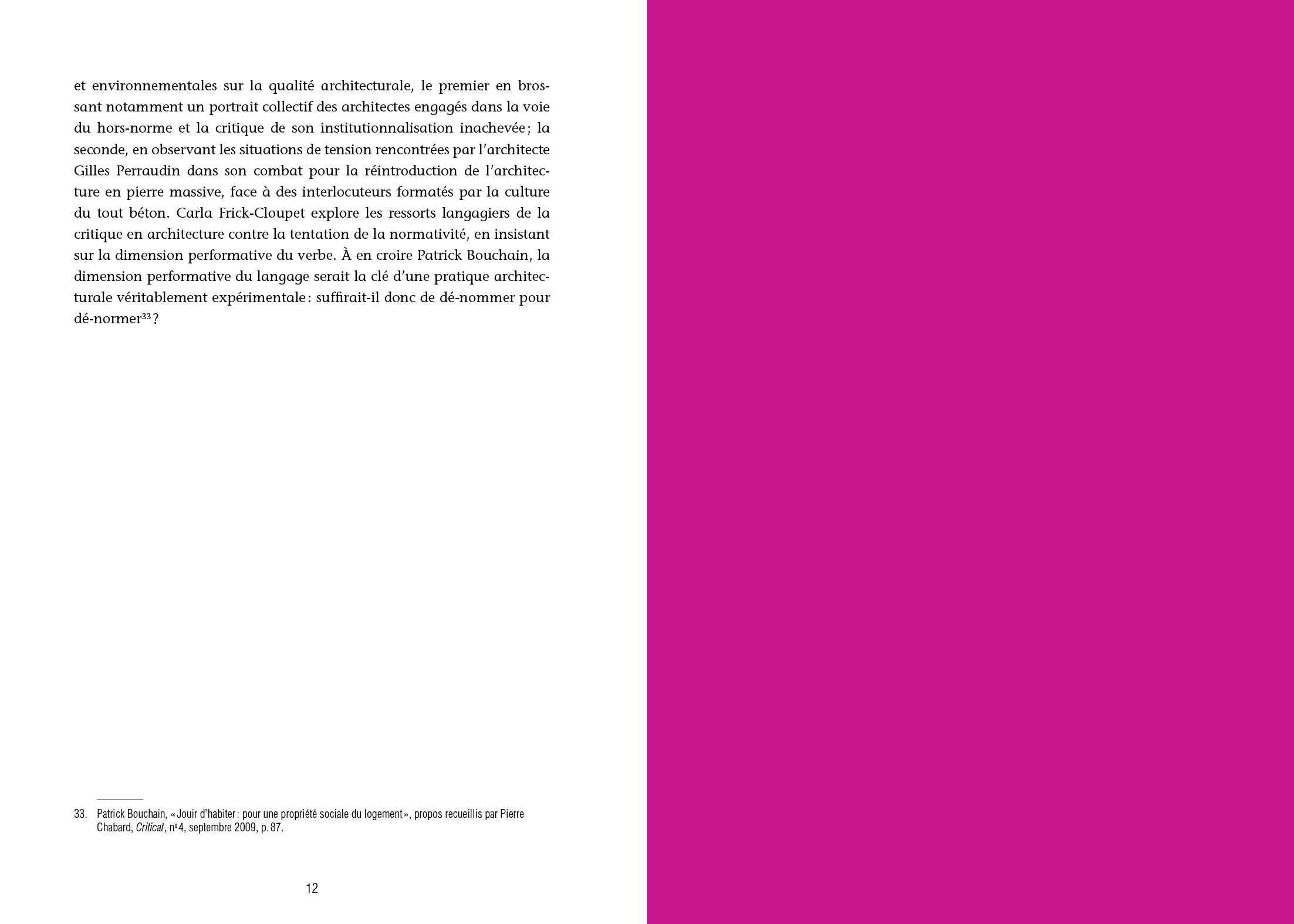 - « Quand dire c'est faire critique » explore les ressorts langagiers de la critique en architecture contre la tentation de la normativité.