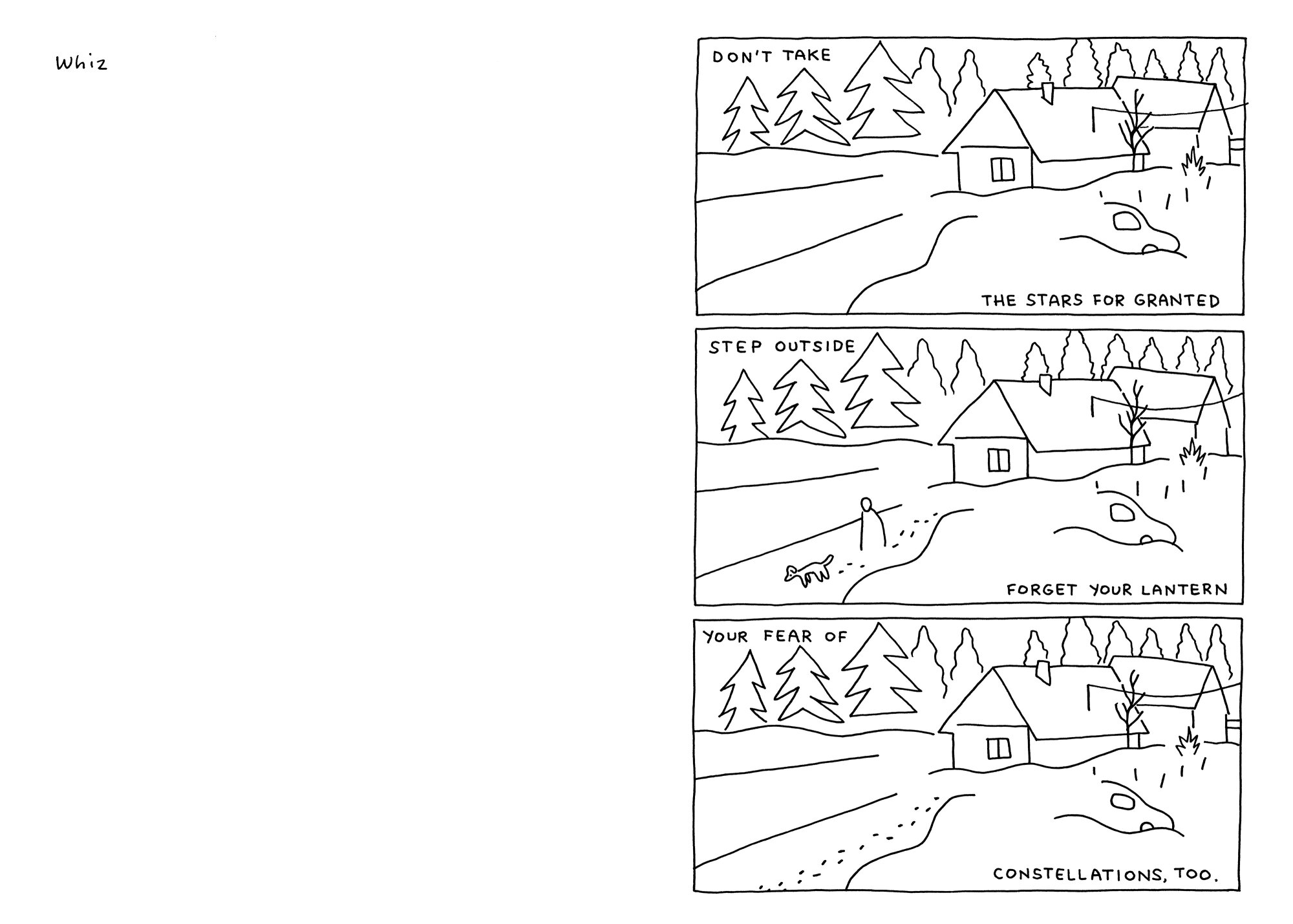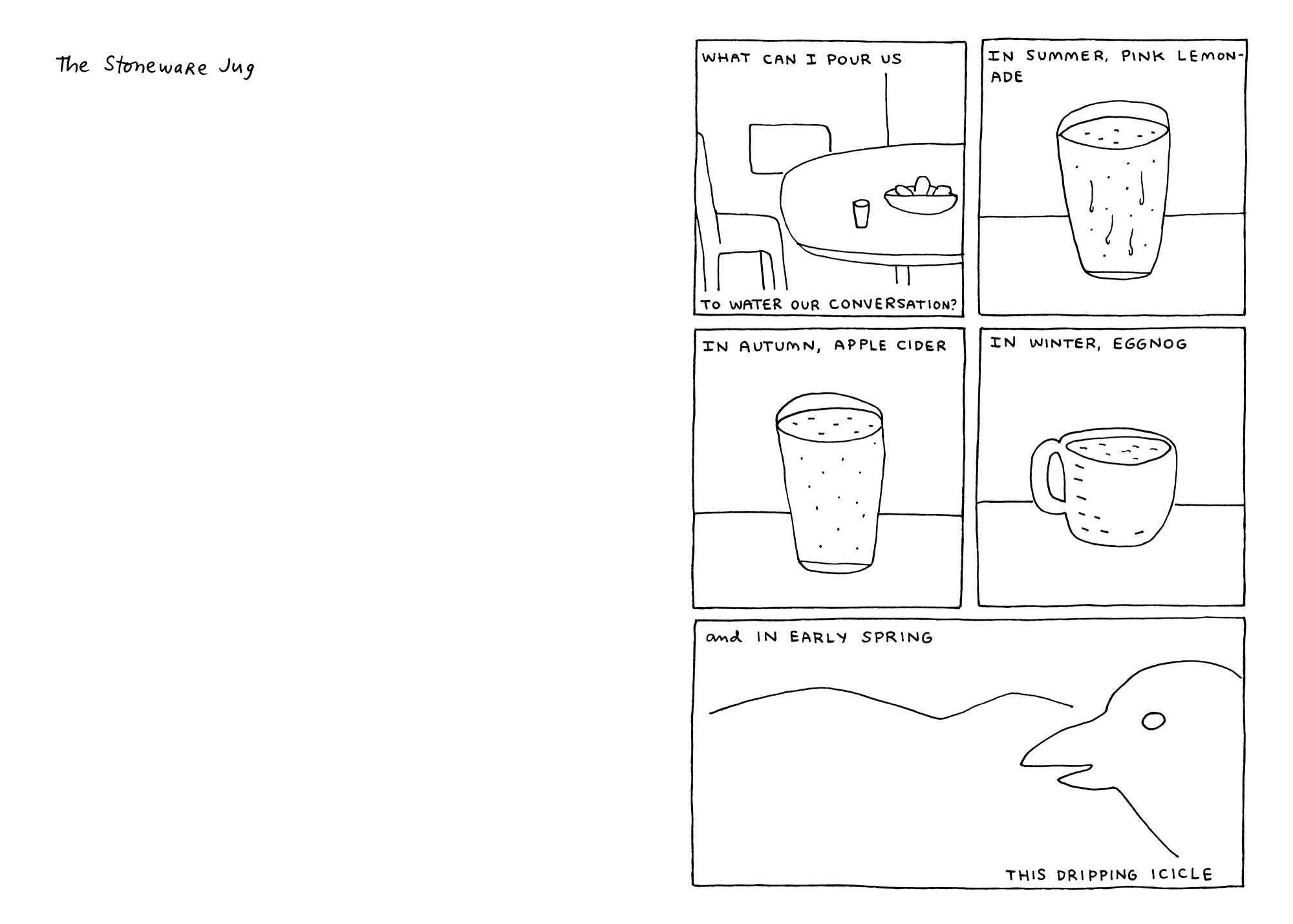 Un recueil de poèmes / dessins de Stefan Lorenzutti (mots) et John Porcellino (images), dans lequel Porcellino, légende de la bande dessinée américaine (King-Cat, Thoreau at Walden), « verse » les poèmes adaptés à l'encre dans ses planches, comme dans un récipient fabriqué à la main.