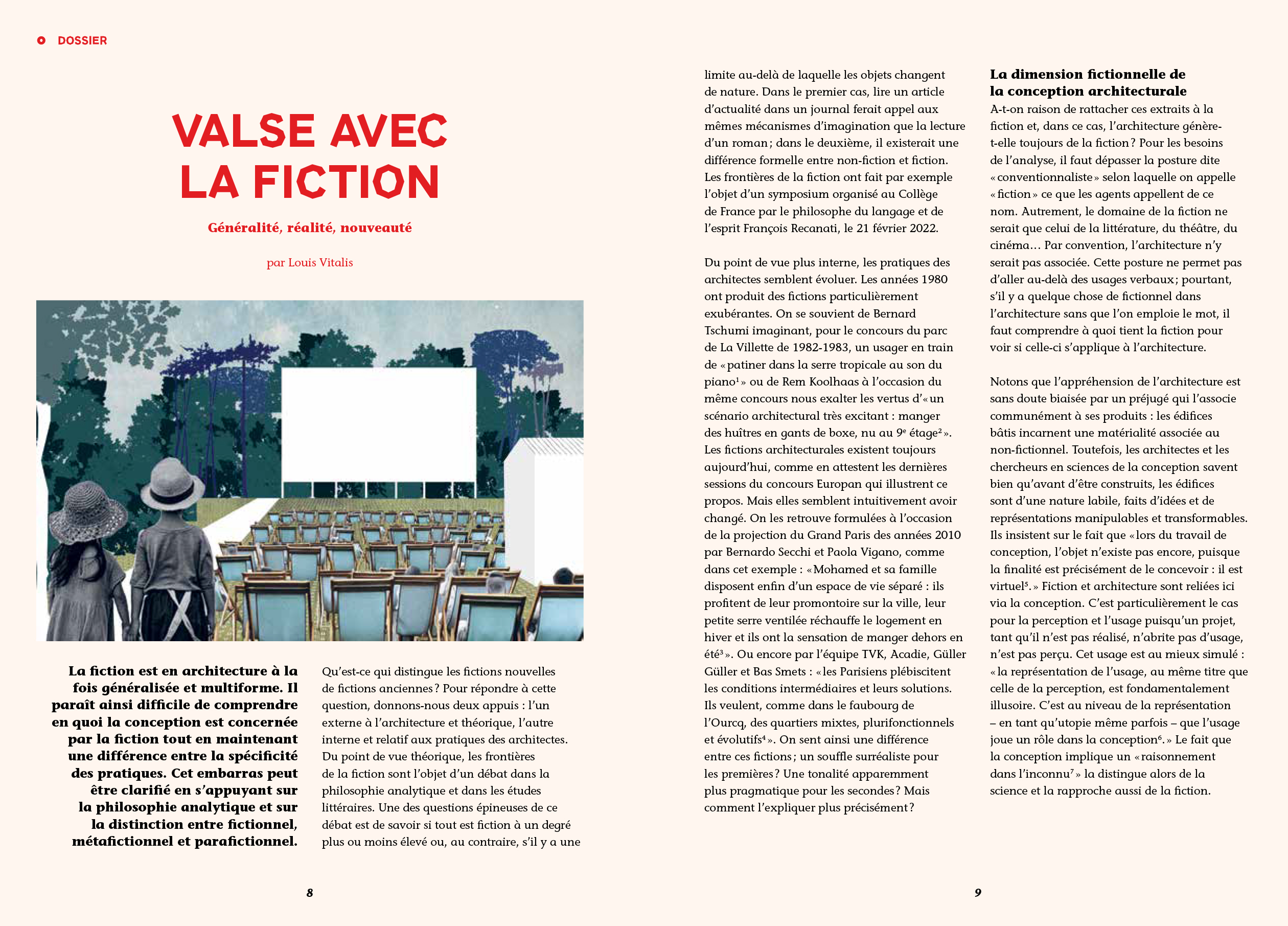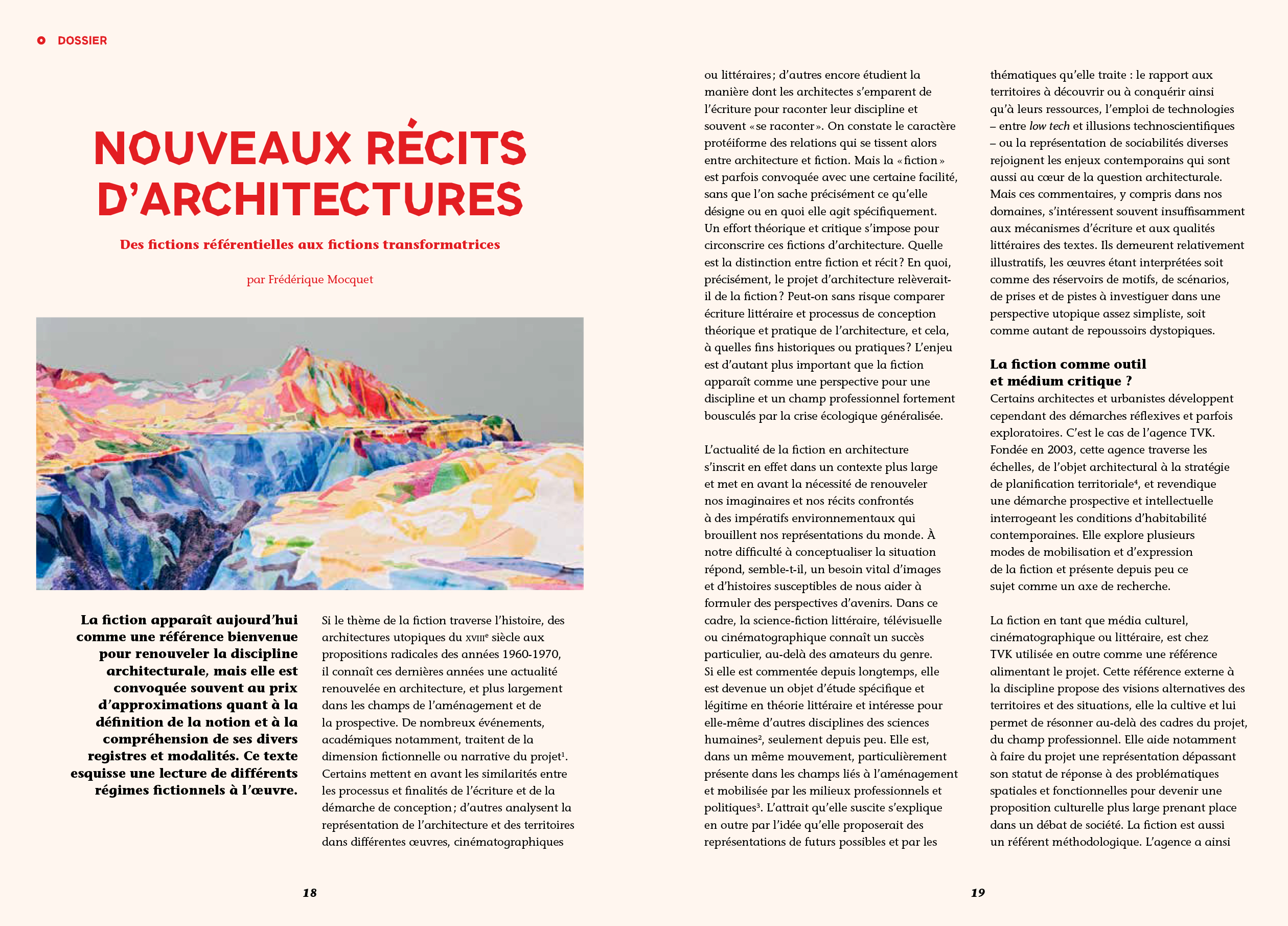 Ce nouveau numéro propose de se tourner vers la fiction et vers ce qu'elle recouvre de potentialités afin de penser et réaliser l'architecture d'aujourd'hui, celle de demain. Évoquer cette notion aux côtés de l'architecture n'est pas un angle nouveau.