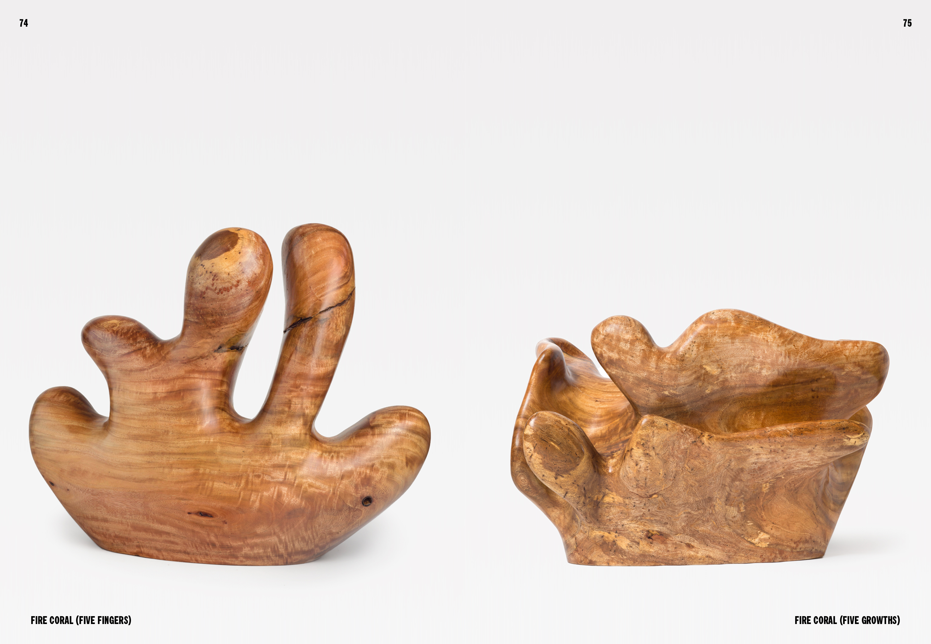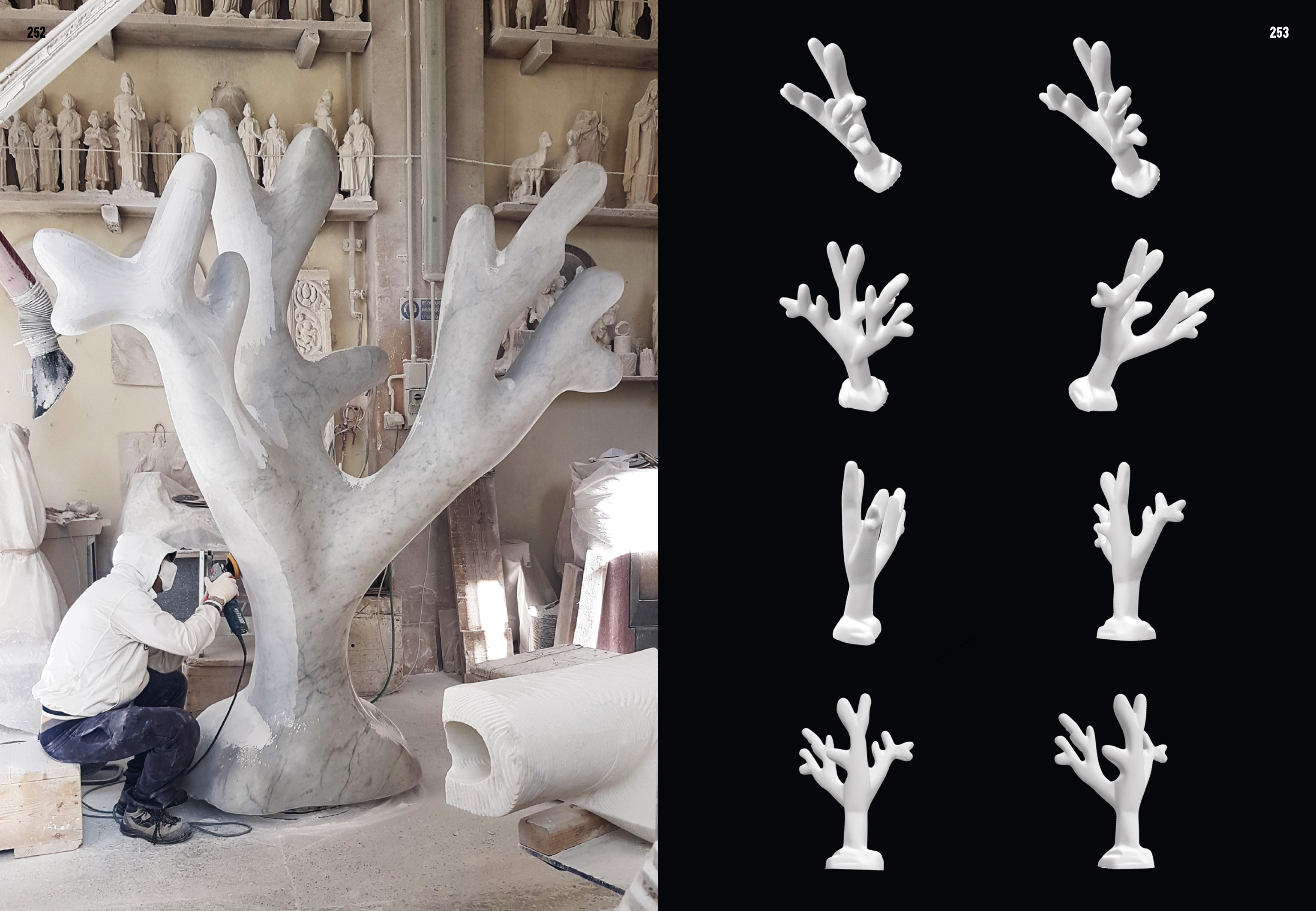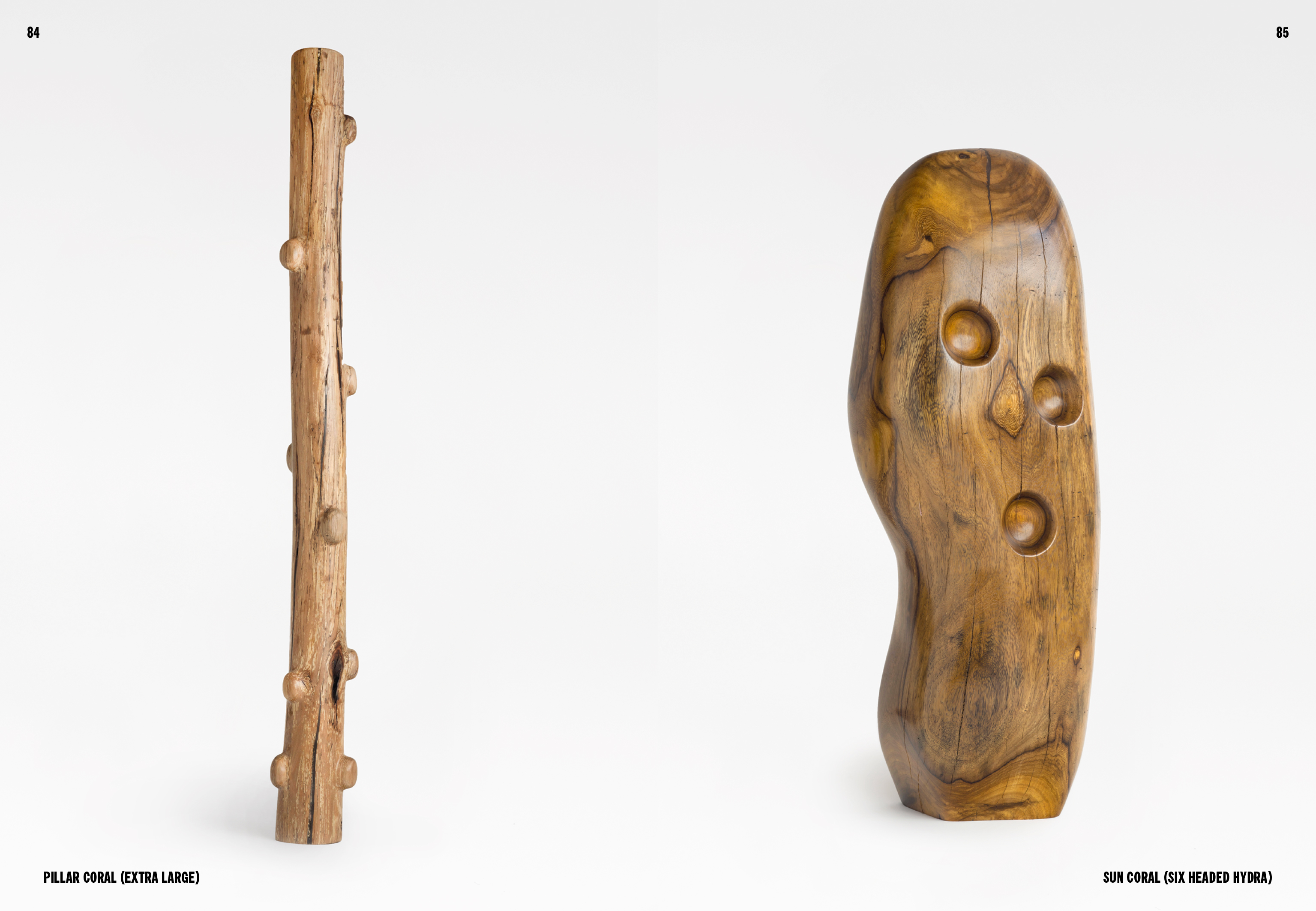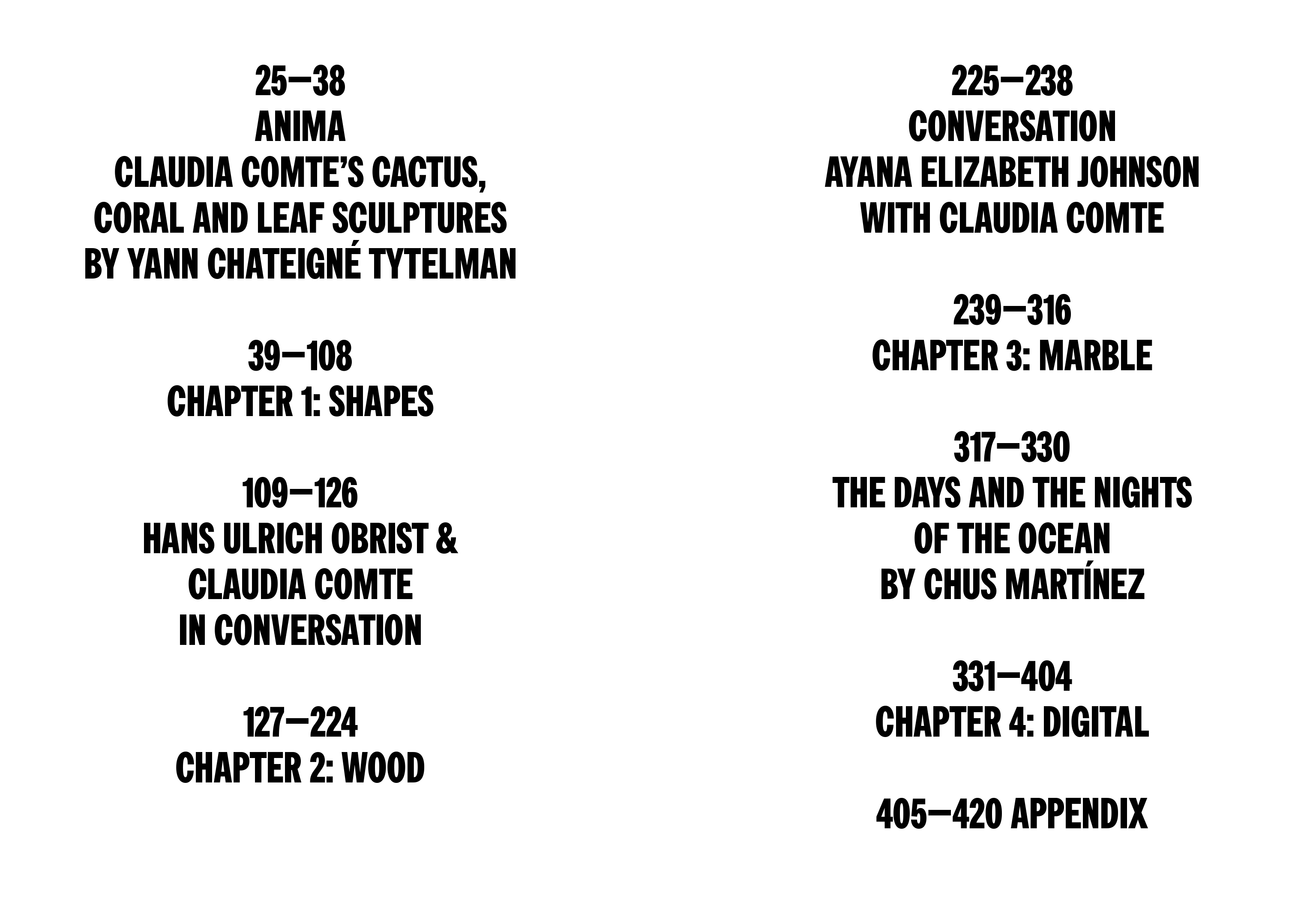 Le livre commence par un index des sculptures en bois de Comte, auxquelles elle donne des surnons, comme s'il s'agissait d'êtres familiers. Réalisées à partir de croquis, elles sont sculptées dans le bois ou exécutées dans le marbre à l'aide de supports numériques. Ainsi, le marbre, représentation pétrifiée de la mer, rencontre le bois, lieu de stockage des processus naturels terrestres et source constante d'oxygène.