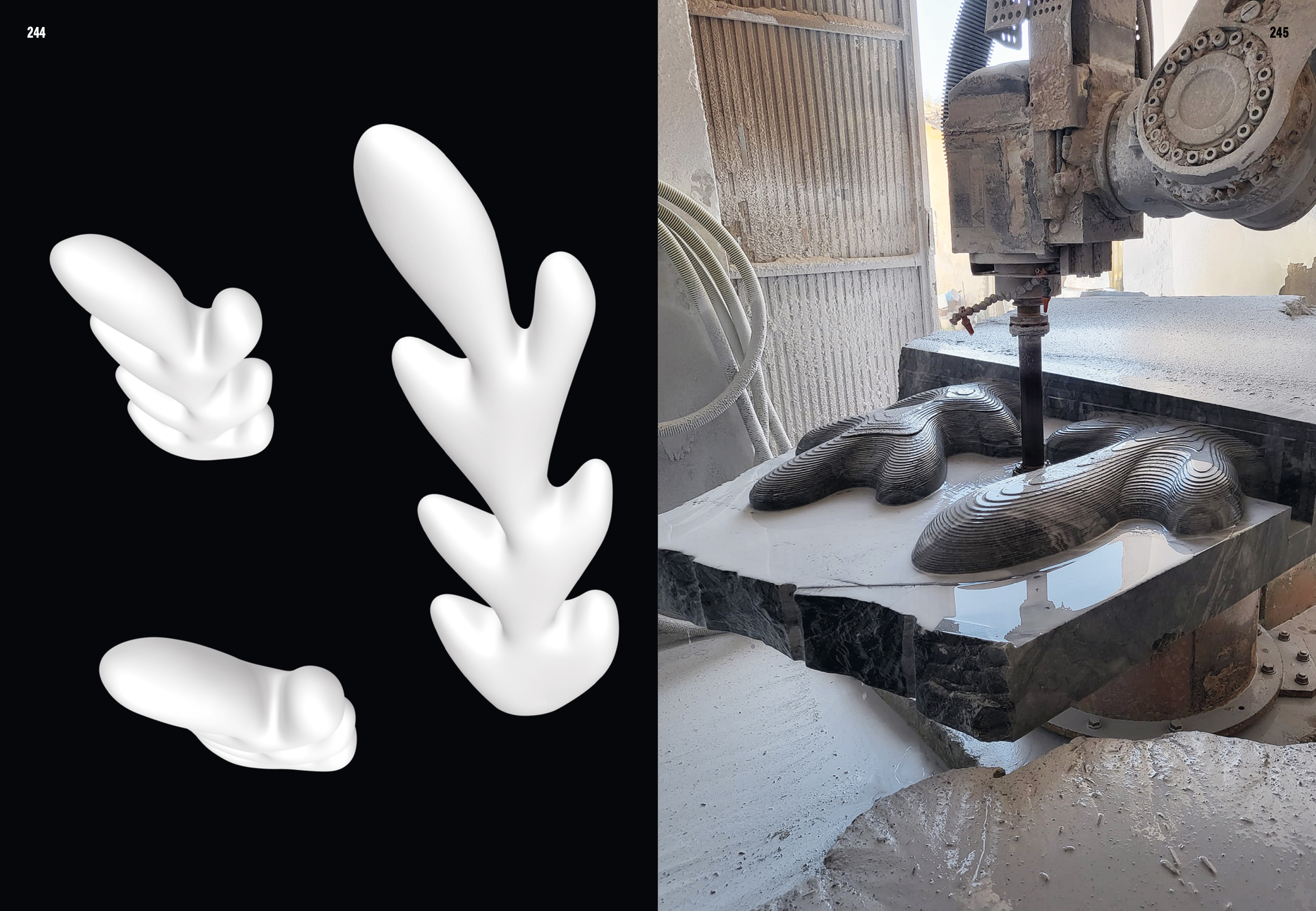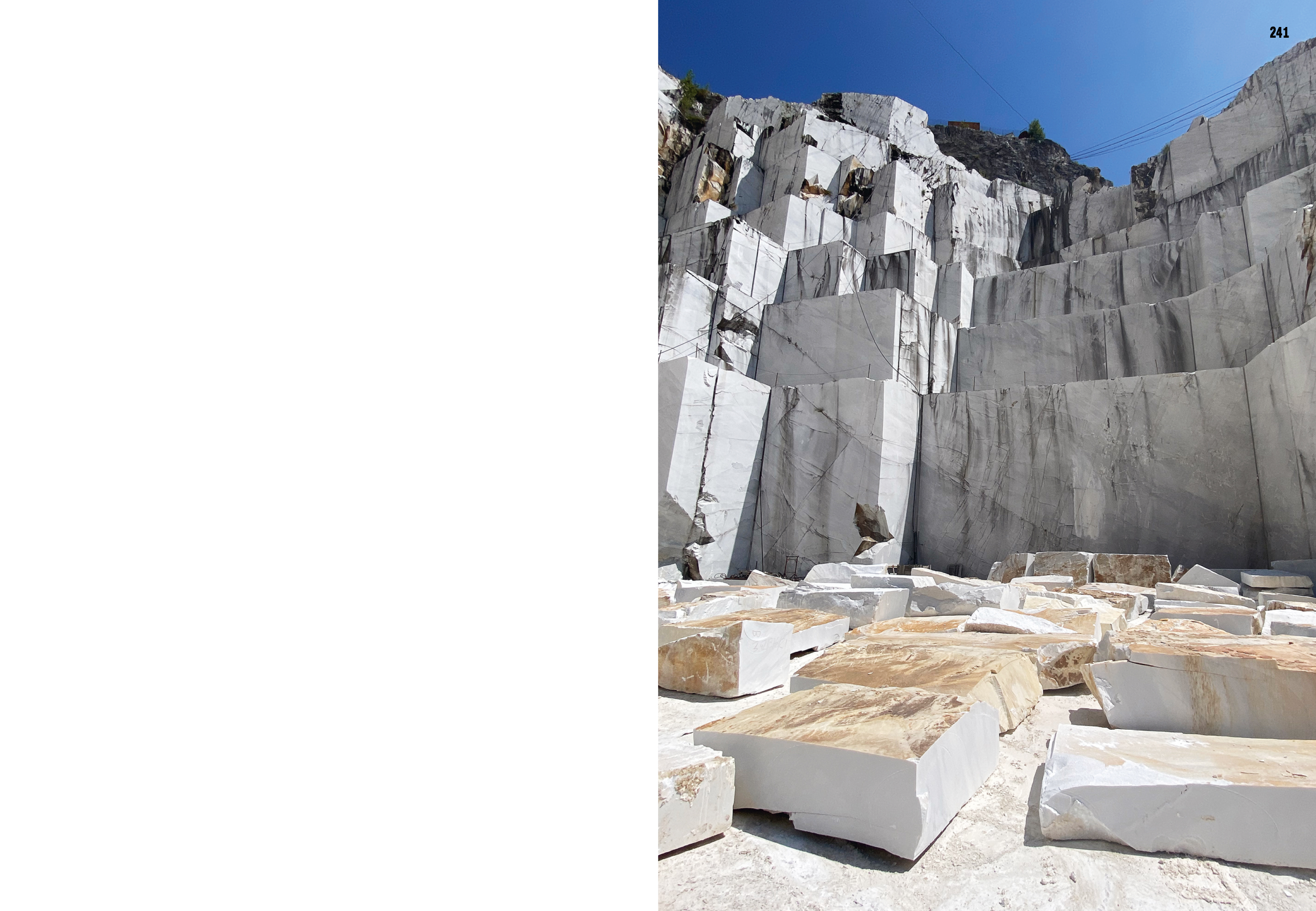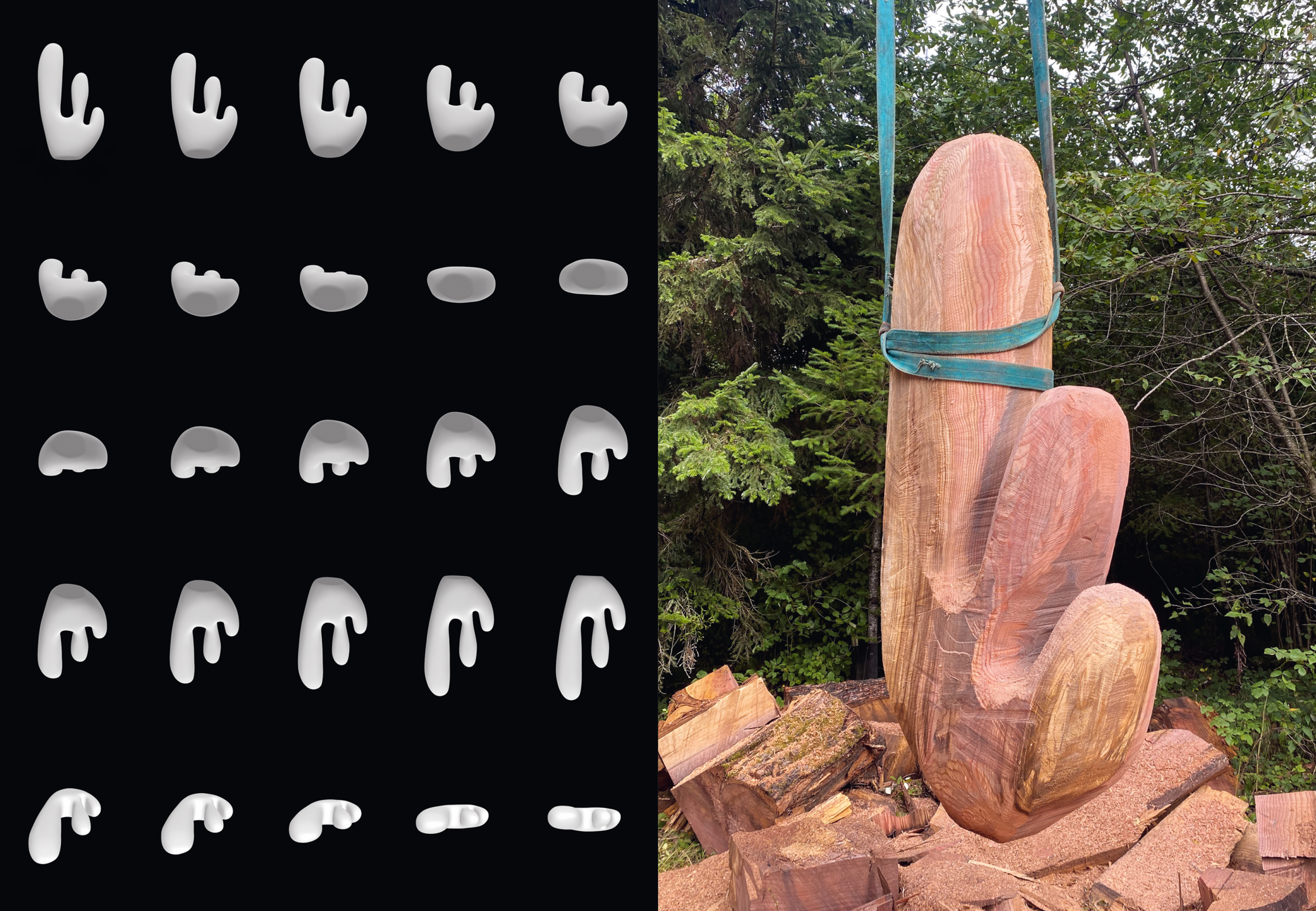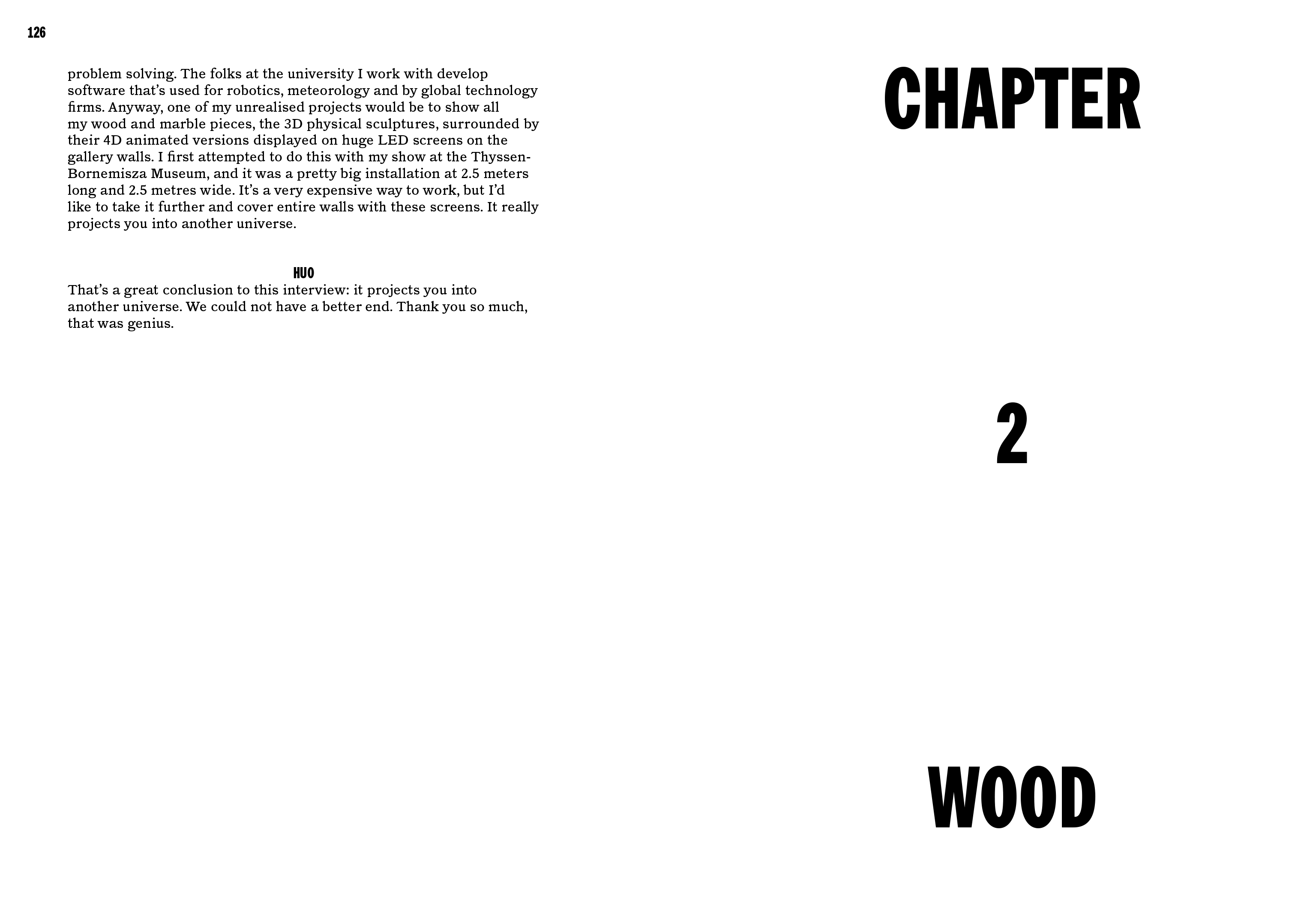 Le livre commence par un index des sculptures en bois de Comte, auxquelles elle donne des surnons, comme s'il s'agissait d'êtres familiers. Réalisées à partir de croquis, elles sont sculptées dans le bois ou exécutées dans le marbre à l'aide de supports numériques. Ainsi, le marbre, représentation pétrifiée de la mer, rencontre le bois, lieu de stockage des processus naturels terrestres et source constante d'oxygène.