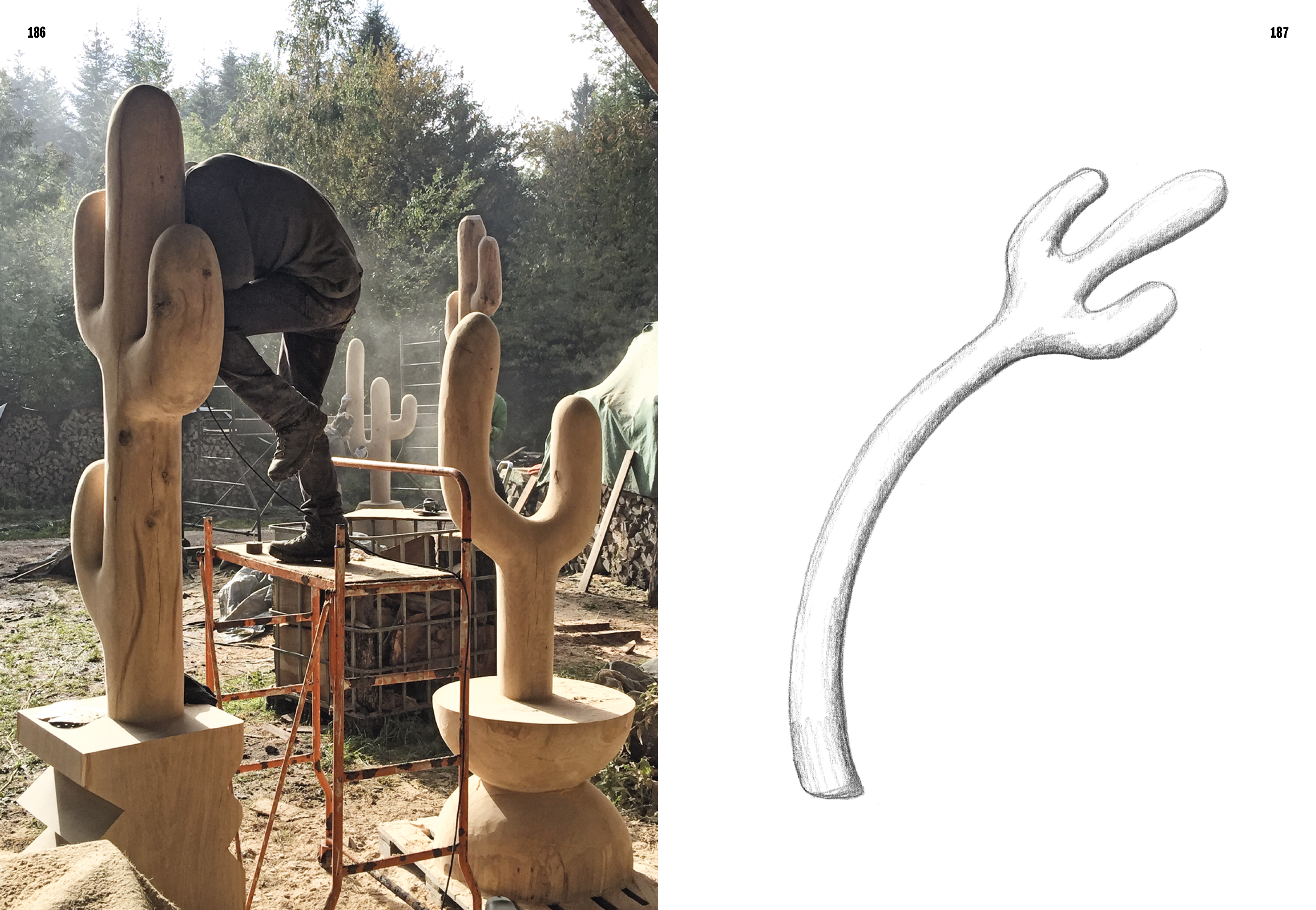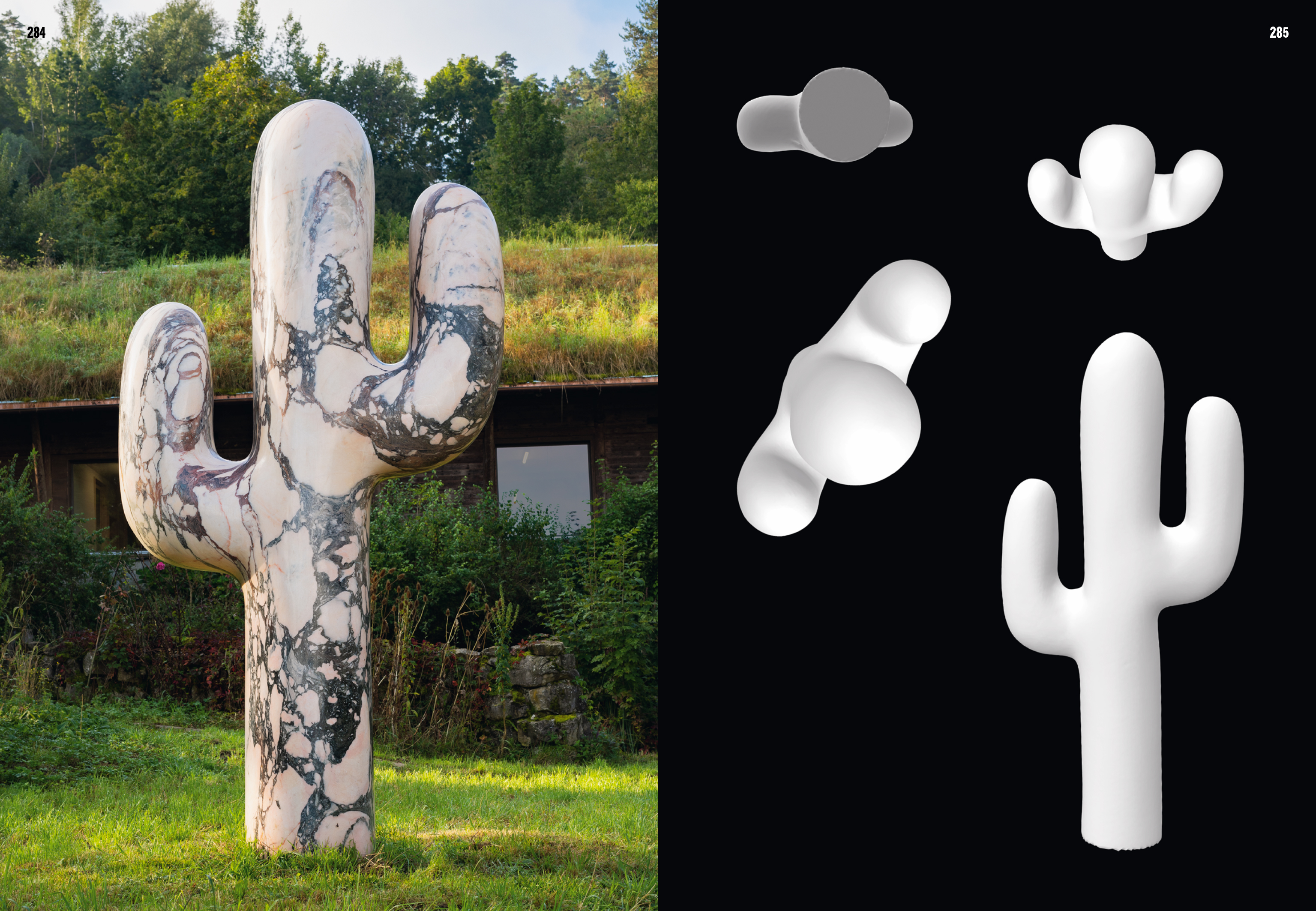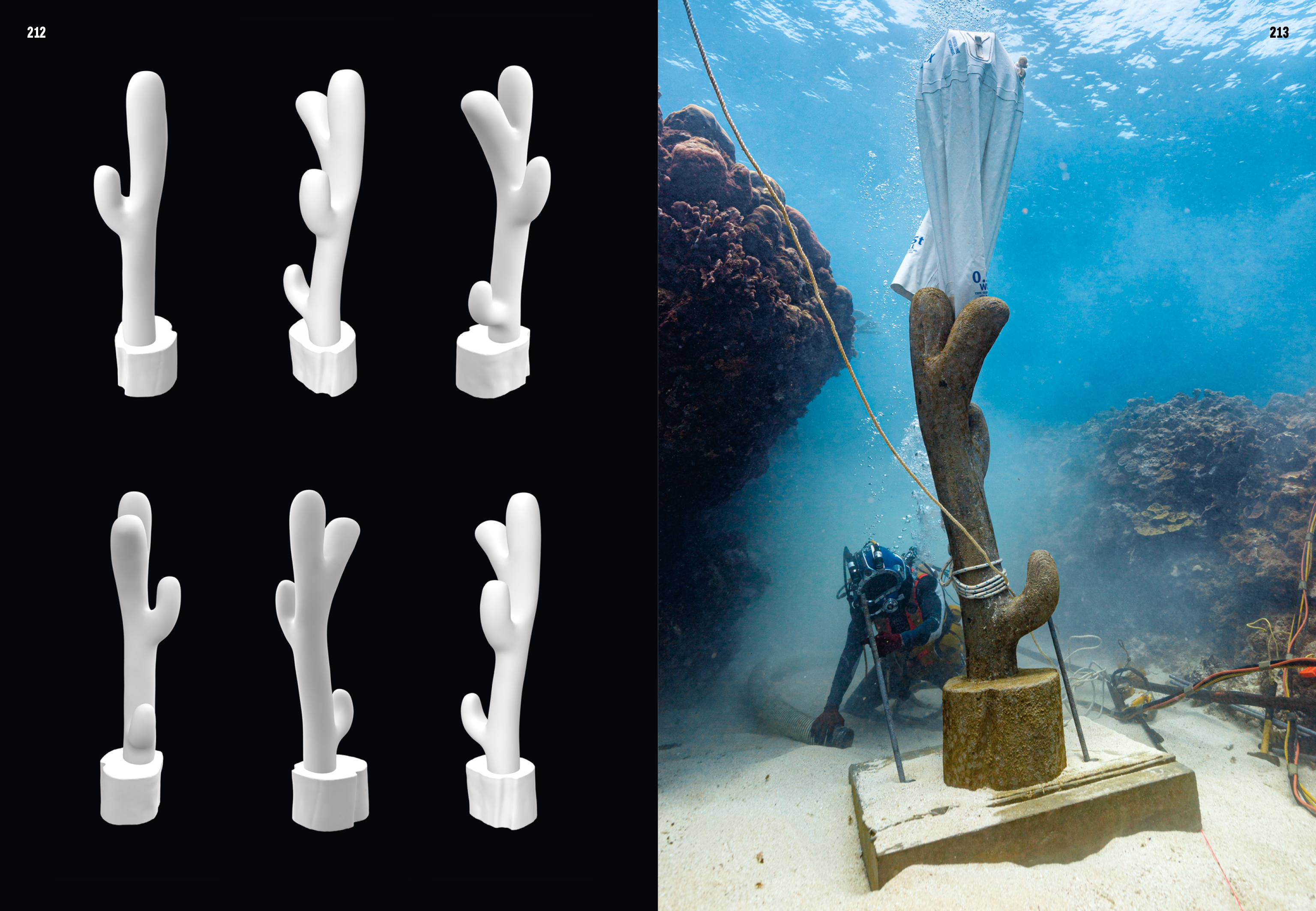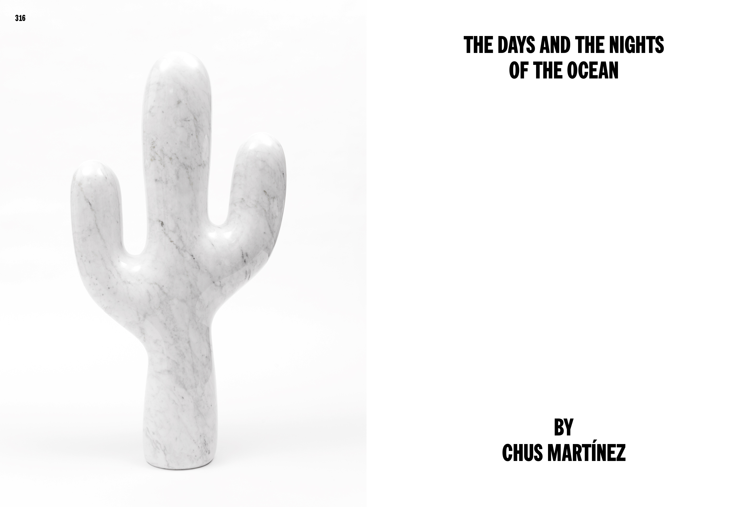 Des sculptures de cactus en marbre recouvertes de neige, des esquisses de coraux au crayon et des représentations de formes de feuilles apparemment suspendues dans les airs, entrecoupées de grilles de sculptures de couleur néon et de titres de journaux alarmants mettant en garde contre l'apocalypse climatique qui nous attend : ce livre d'artiste explore le système de référence diversifié de formes et de matériaux, de plantes, d'animaux et d'autres sujets à partir desquels Claudia Comte développe ses sculptures biomorphiques. Alors que les cactus sont bien adaptés aux conditions arides, les récifs coralliens, qui forment des écosystèmes bio-diversifiés au bas de la chaîne alimentaire marine, dépérissent en raison du réchauffement et de l'acidification de l'océan. Les feuilles, elles, représentent la photosynthèse, le processus de transformation de l'énergie qui dégage de l'oxygène. La fusion surnaturelle de Comte entre le cactus, le corail et la feuille établit des liens entre les aspects du désert, de l'océan et de la forêt à travers divers processus de métamorphose matérielle.