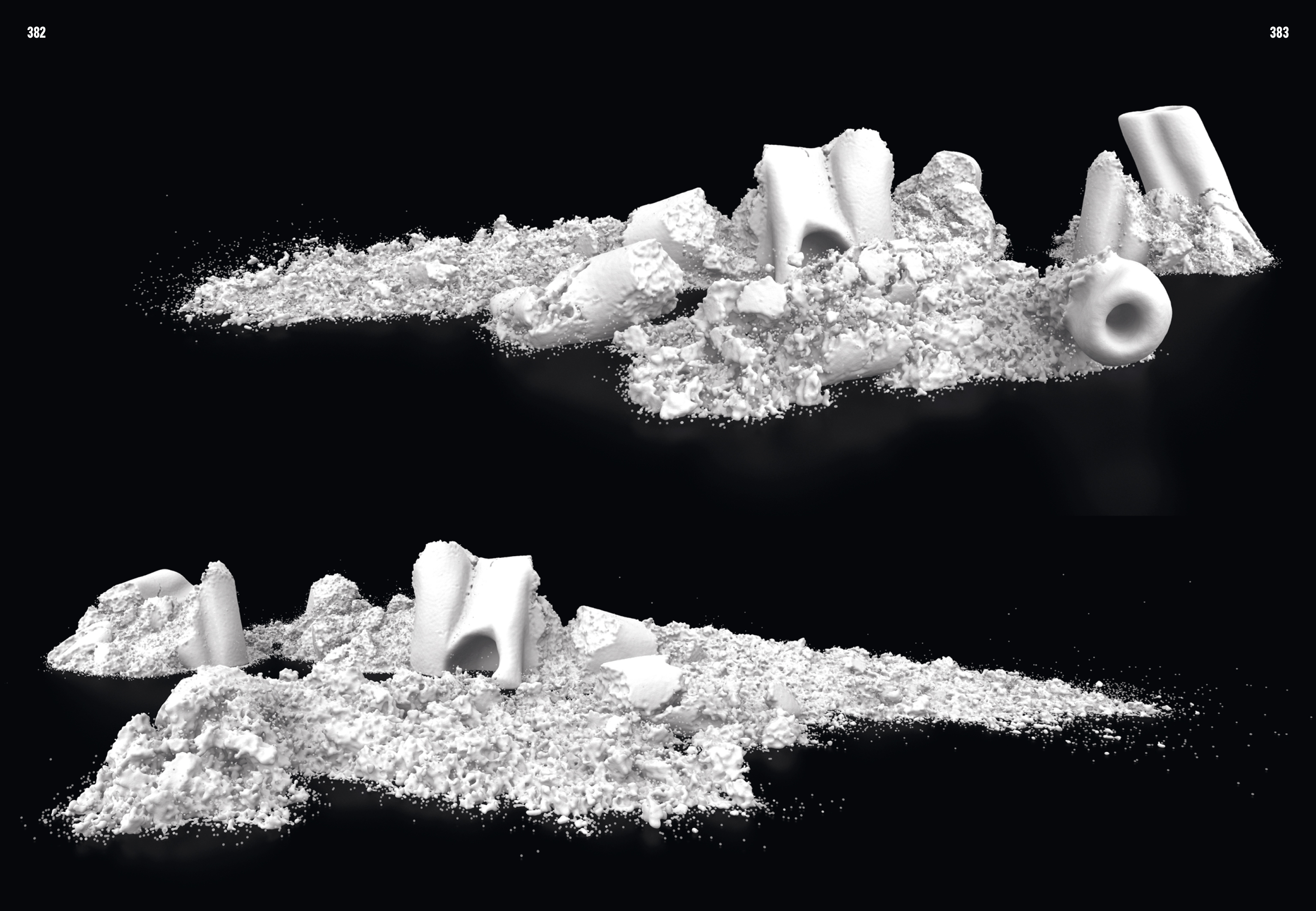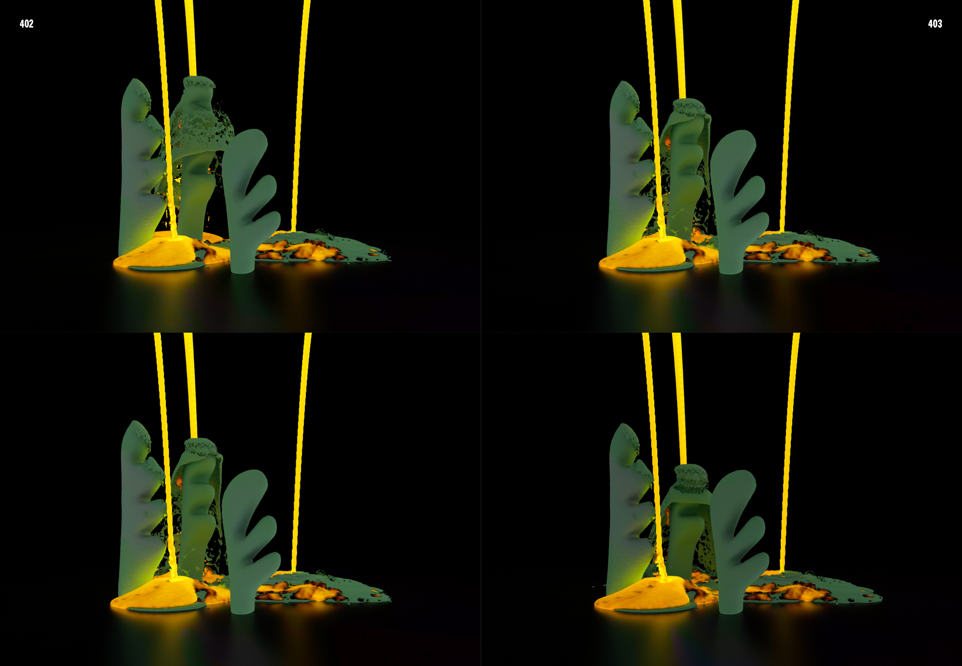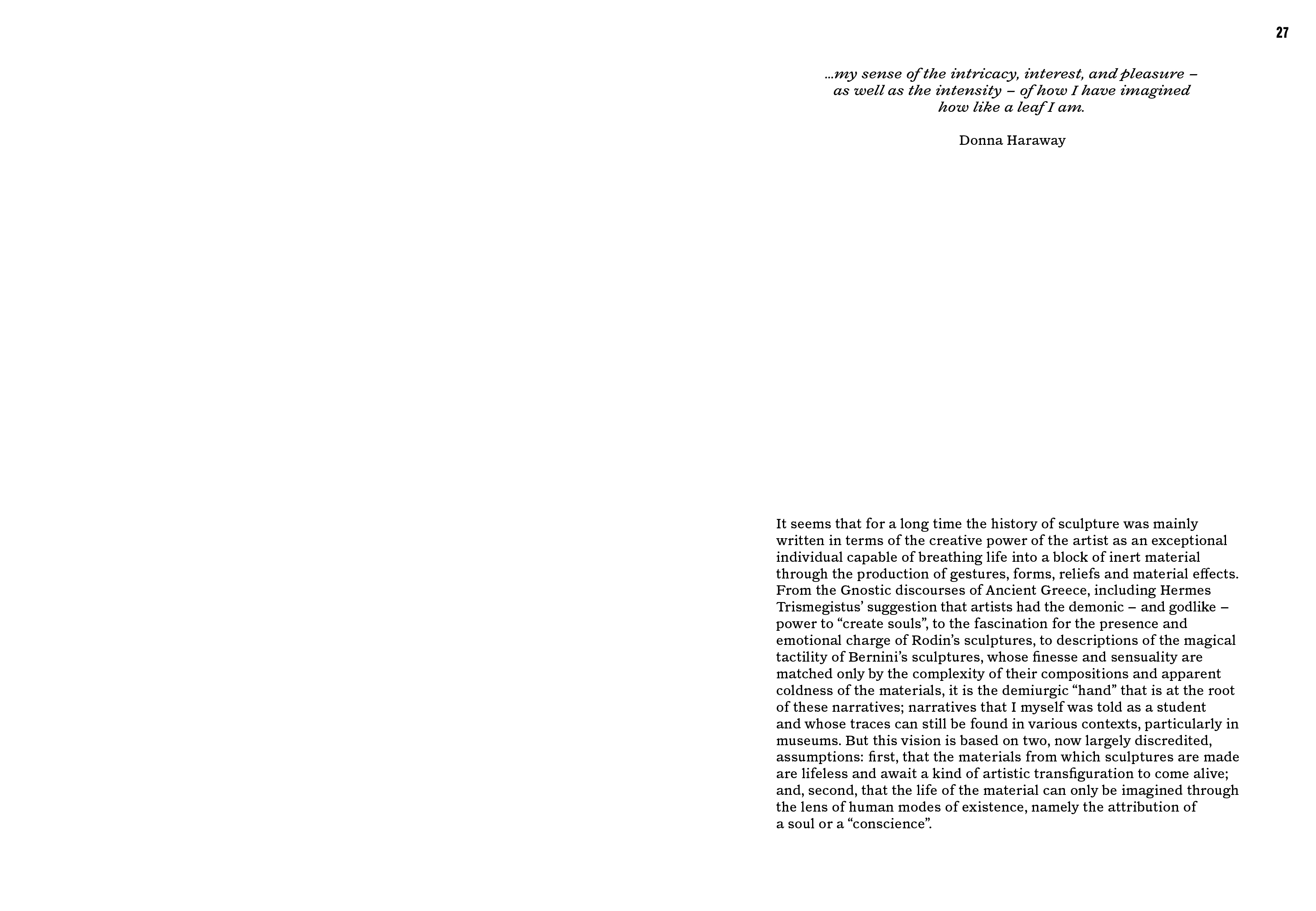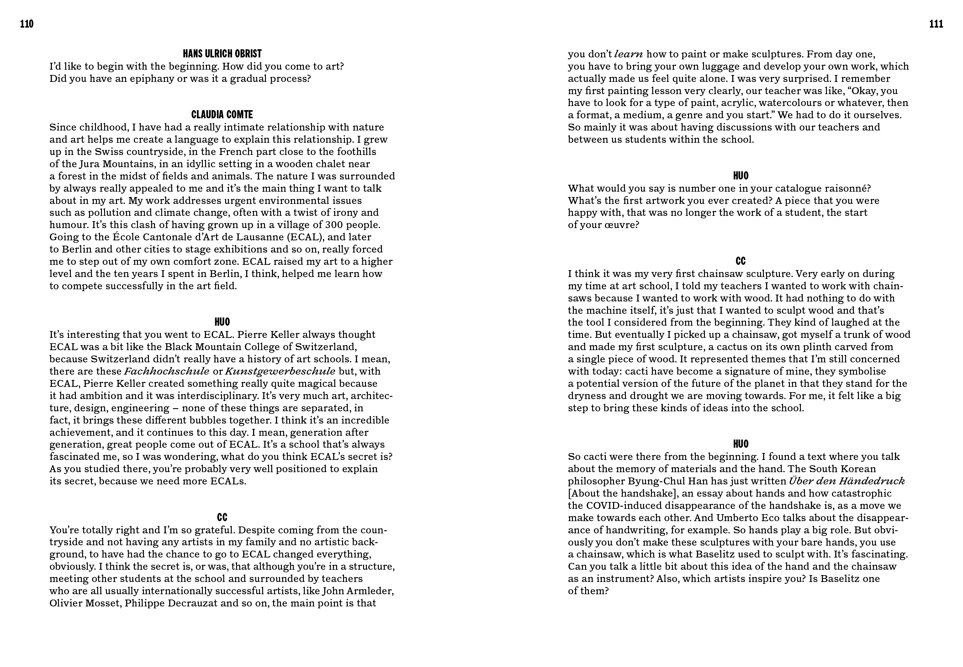 Des sculptures de cactus en marbre recouvertes de neige, des esquisses de coraux au crayon et des représentations de formes de feuilles apparemment suspendues dans les airs, entrecoupées de grilles de sculptures de couleur néon et de titres de journaux alarmants mettant en garde contre l'apocalypse climatique qui nous attend : ce livre d'artiste explore le système de référence diversifié de formes et de matériaux, de plantes, d'animaux et d'autres sujets à partir desquels Claudia Comte développe ses sculptures biomorphiques. Alors que les cactus sont bien adaptés aux conditions arides, les récifs coralliens, qui forment des écosystèmes bio-diversifiés au bas de la chaîne alimentaire marine, dépérissent en raison du réchauffement et de l'acidification de l'océan. Les feuilles, elles, représentent la photosynthèse, le processus de transformation de l'énergie qui dégage de l'oxygène. La fusion surnaturelle de Comte entre le cactus, le corail et la feuille établit des liens entre les aspects du désert, de l'océan et de la forêt à travers divers processus de métamorphose matérielle.