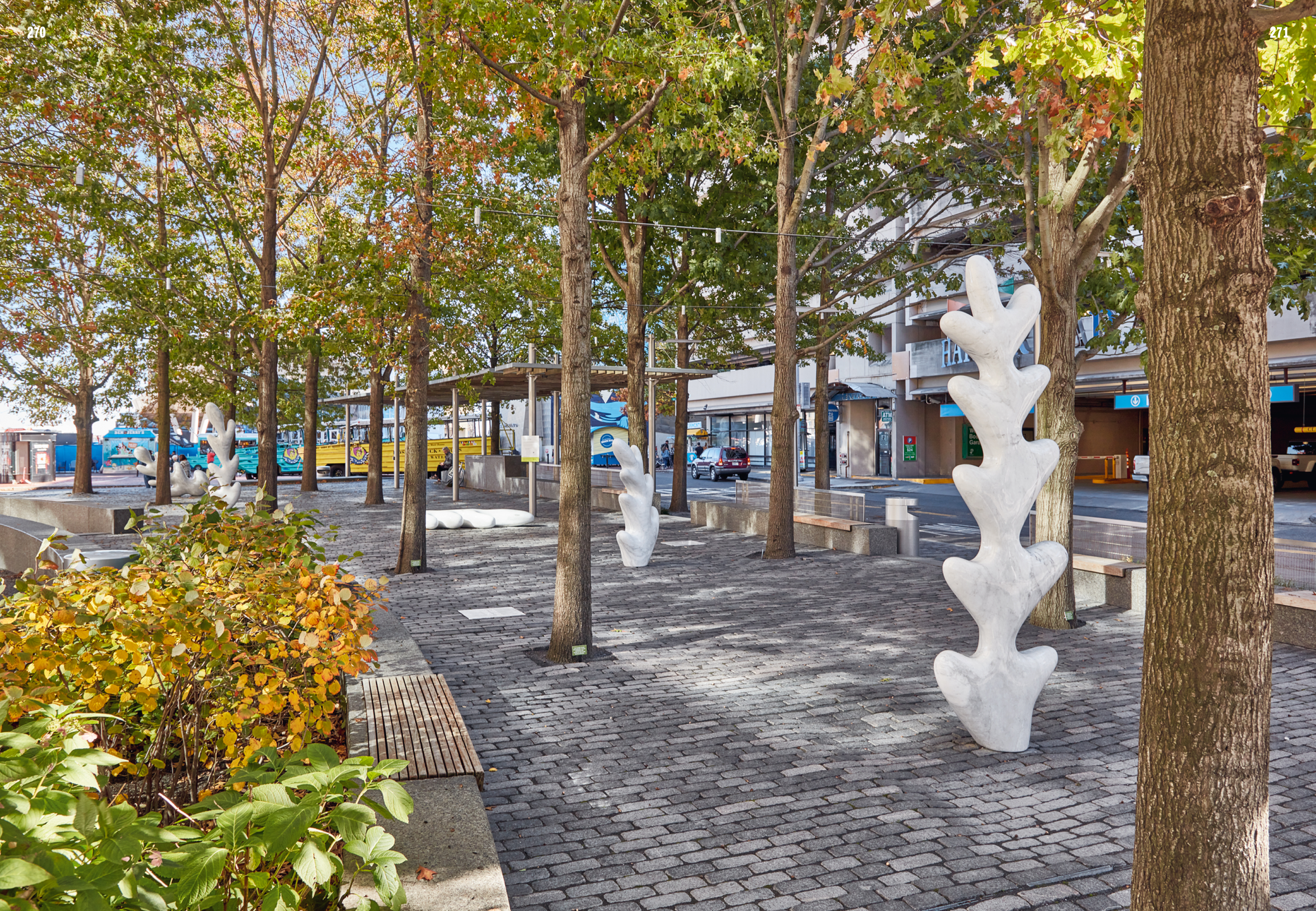 Principalement connue pour ses impressionnantes installations in situ qui permettent au public de rencontrer l'art via la nature, le travail minimaliste de Claudia Comte (née en 1983 à Grancy, Suisse, vit et travaille à Berlin) mêle peinture géométrique et sculpture abstraite. Par la décomposition et la répétition de motifs inspirés du Op Art et du Pop Art, Claudia Comte propose une œuvre colorée et dynamique. Toutefois, bien que séduisantes à l'œil, ses œuvres interrogent avant tout la mémoire des matériaux et leur écosystème. C'est ainsi que le bois qu'elle utilise nous rappelle par ses nervures les évolutions climatiques de la planète, nous faisant prendre conscience de la modification des matériaux intrinsèquement liée à leur écosystème.