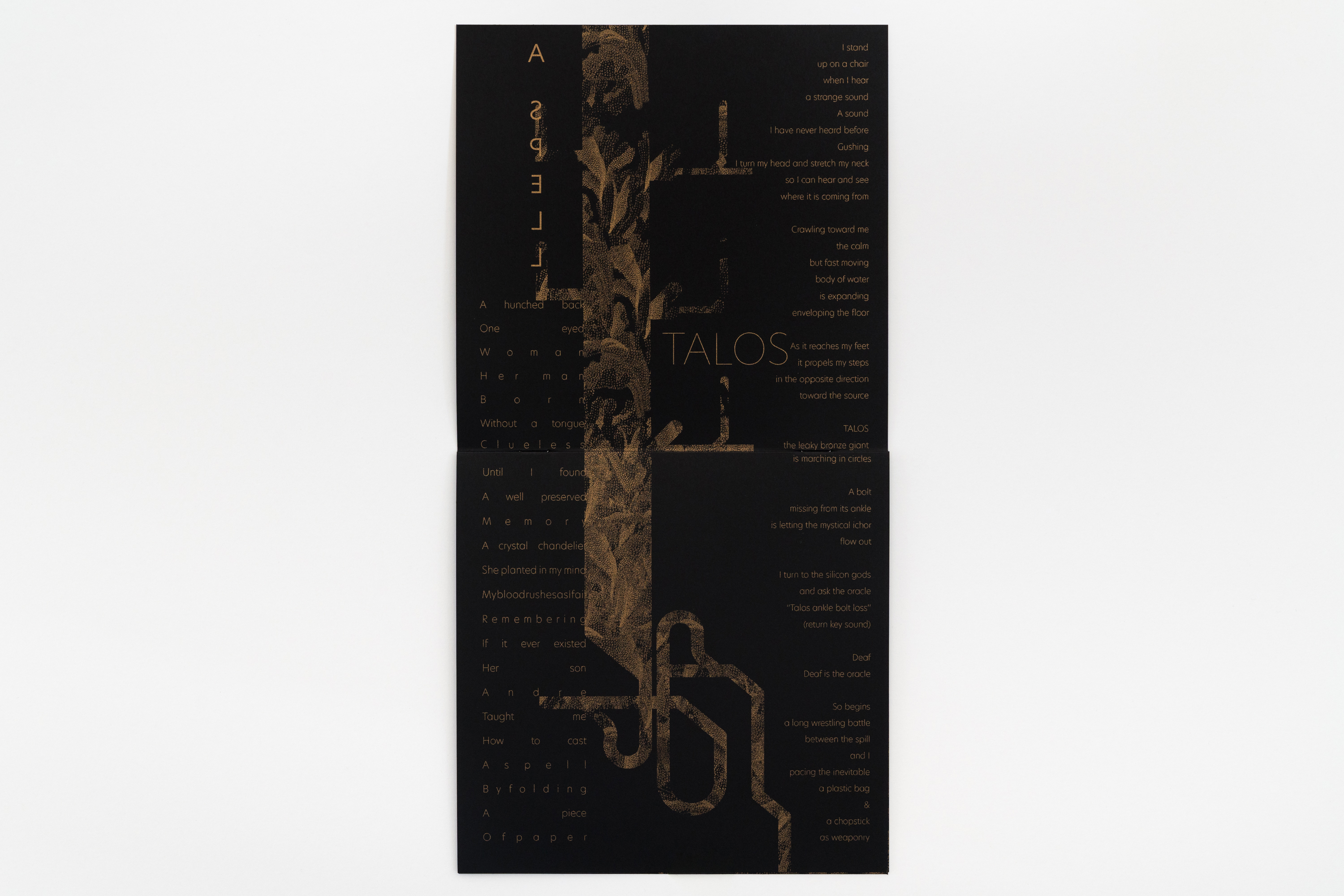 Le disque se matérialise ici sous la forme d'un livre d'artiste imprimé au risographe. Facile à glisser dans sa discothèque personnelle, la publication – dont le format est comparable au 45 tours – inclut un hyperlien pour télécharger le contenu sonore. T A L O S est un effort interdisciplinaire réunissant l'écriture, la musique électroacoustique, la performance et les arts visuels. Ici, une mésaventure projette la protagoniste dans le script de Talos, idéation précoce d'un robot ayant émergée de la Grèce antique. L'automate de bronze à qui on aura retiré un boulon situé à la cheville, laissera s'échapper l'ichor qui le maintenait artificiellement en vie. Les similitudes formelle et acoustique, imaginées et enregistrées, entre le mythe et le déversement d'un chauffe-eau, alimentent les autofictions figurant au libretto, duquel se dégage principalement les thèmes de la mémoire et de l'eau. Sous forme de fluides corporels, d'hémorragie robotique ou encore d'osmose, l'omniprésence de l'eau appelle à se projeter dans un univers de vulnérabilité, d'urgence et de rareté.