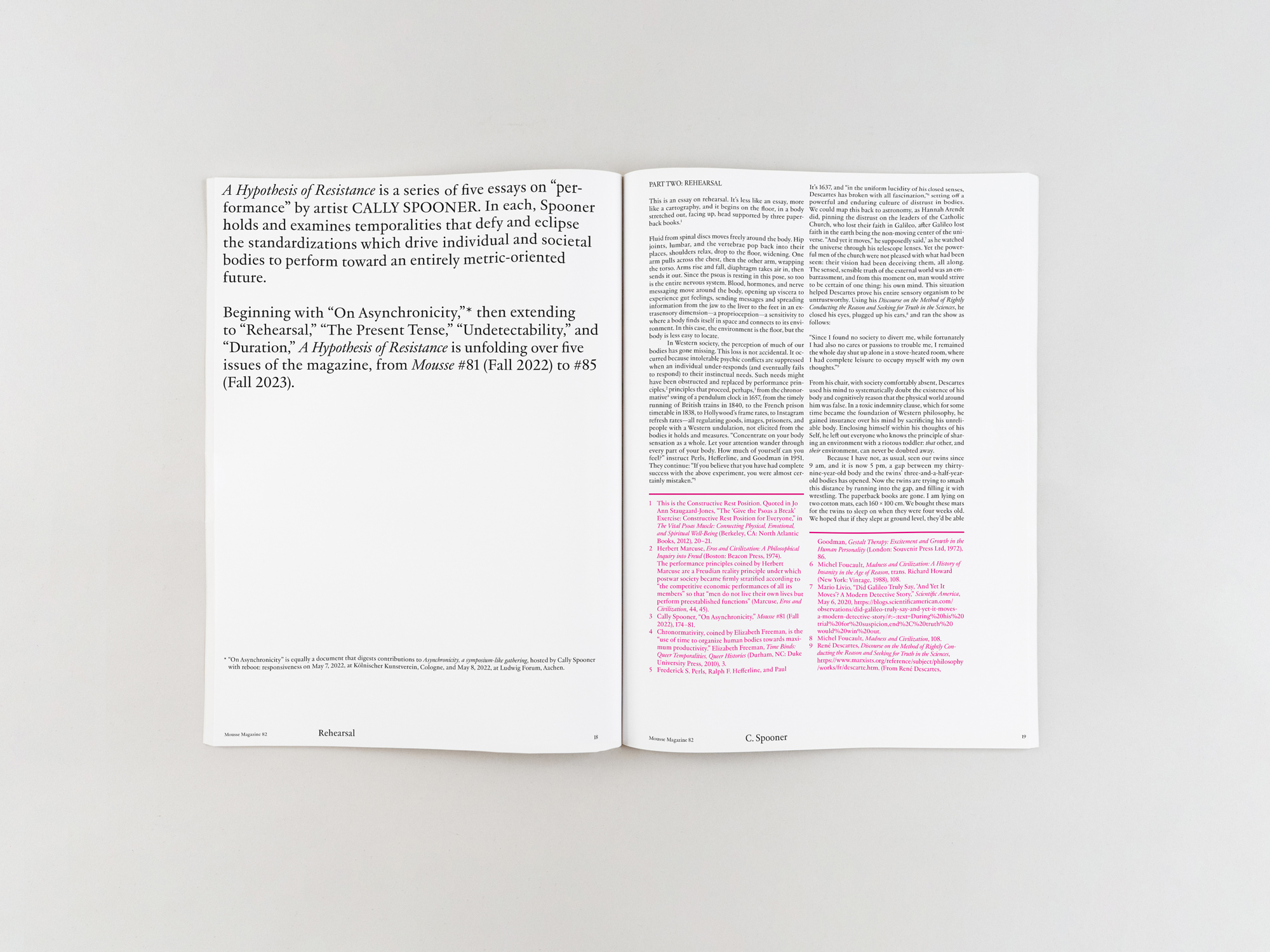 Magazine international bilingue (anglais / italien) de quelque 300 pages au format tabloïd, Mousse rassemble tous les deux mois, depuis 2006, des interviews, des conversations, des articles et des essais avec et autour des principaux acteurs de la scène artistique et de la culture contemporaines (critiques, artistes, curateurs), fédérant des contributeurs basés dans les plus grandes capitales artistiques du monde.