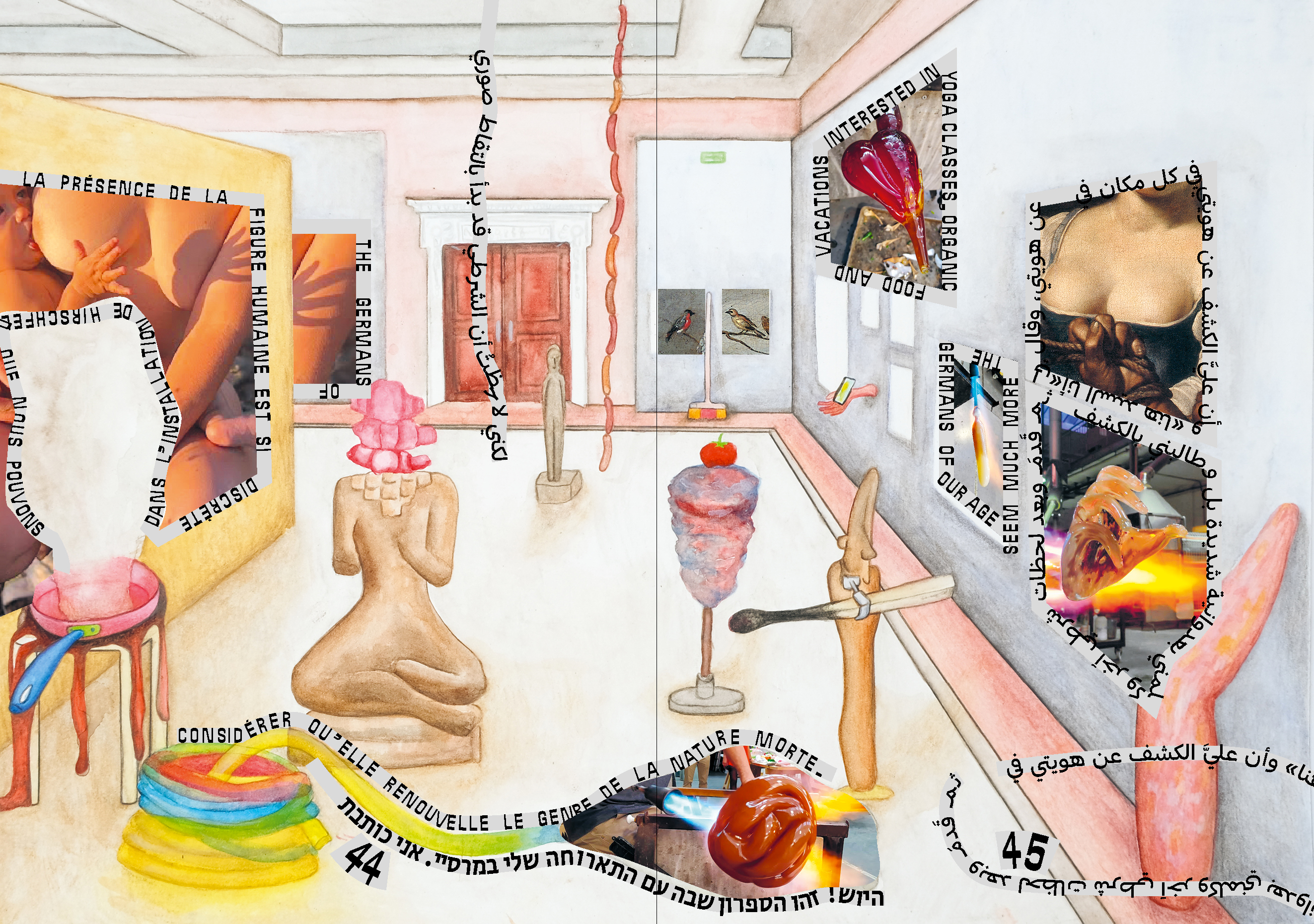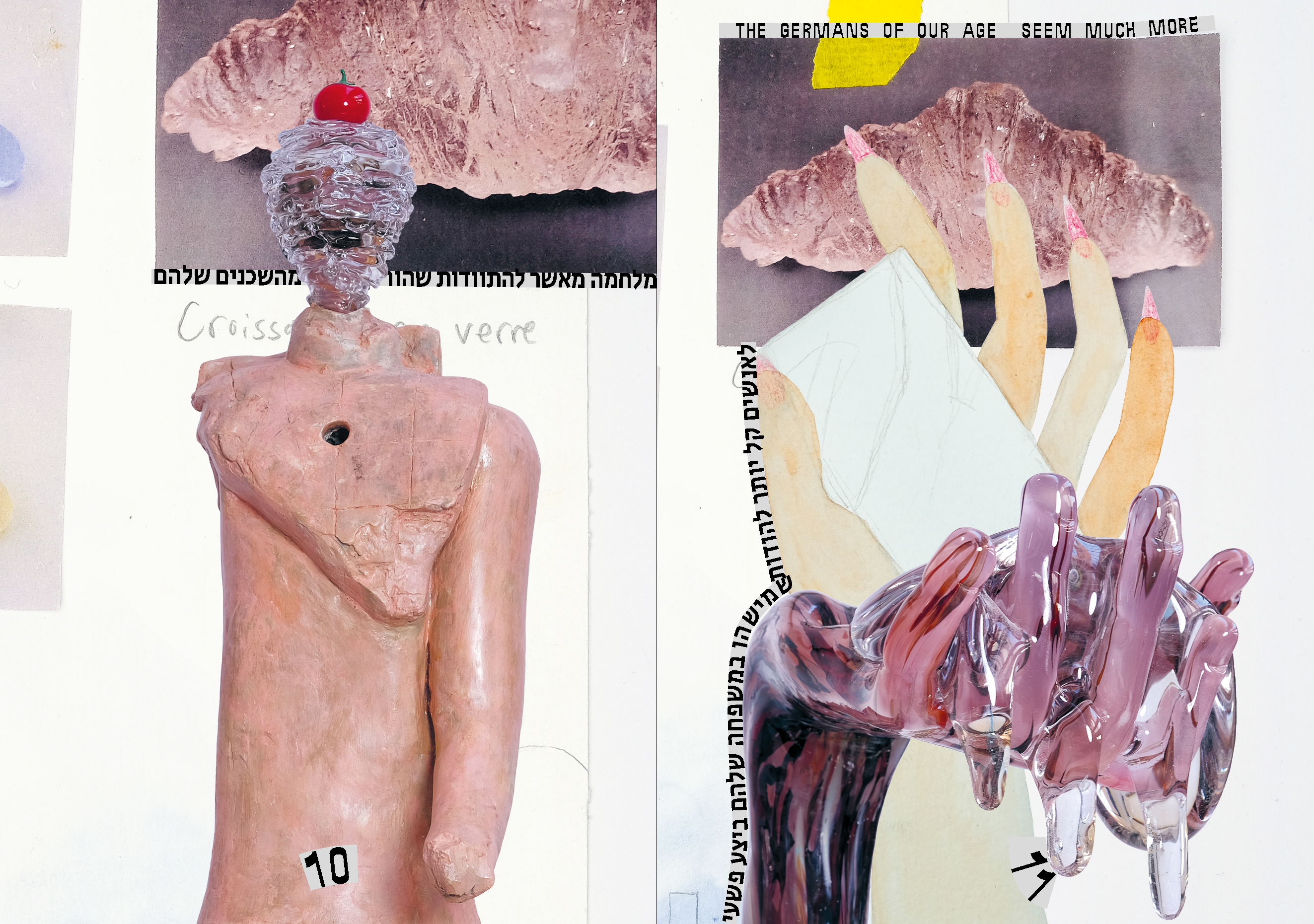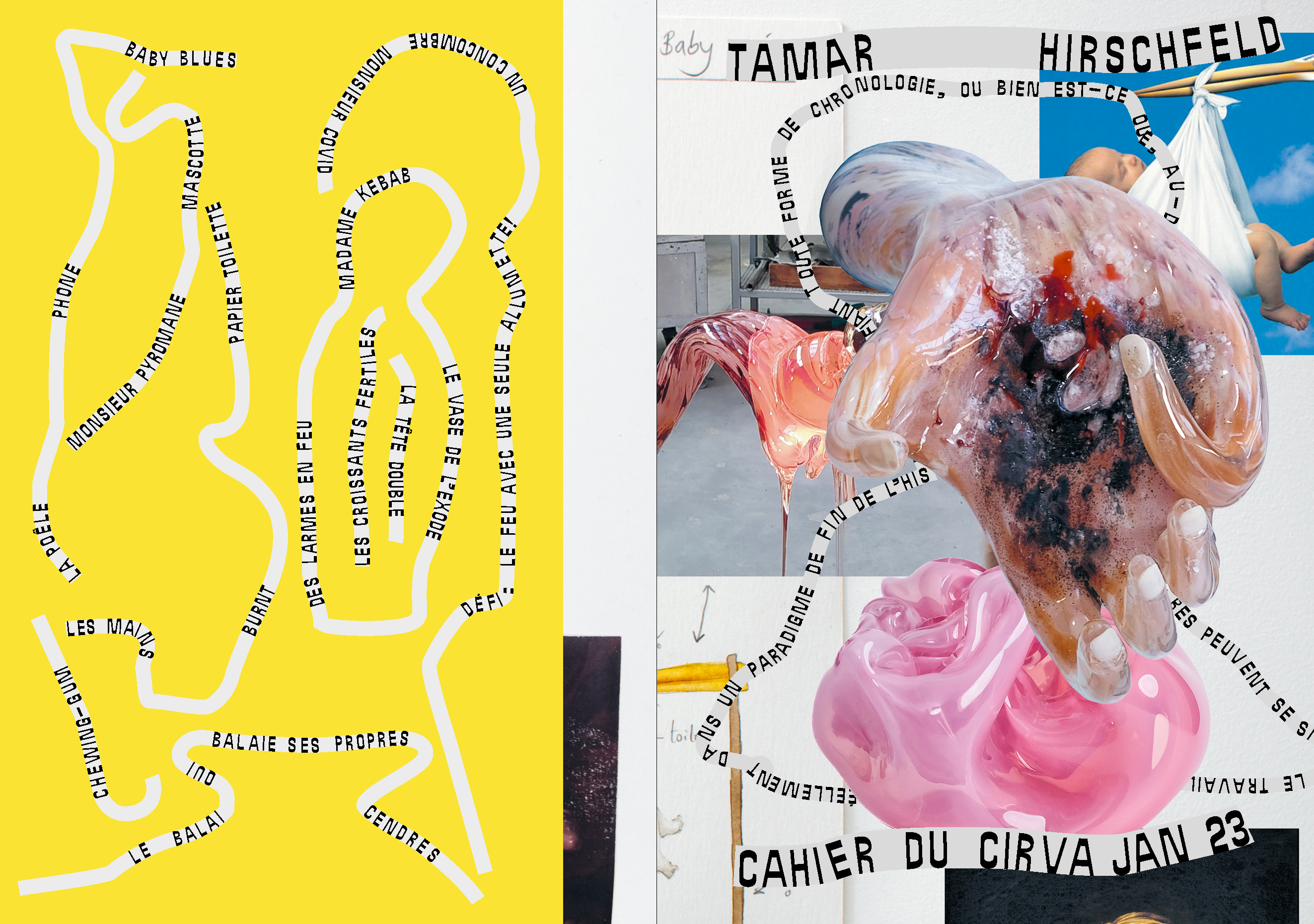 Ni carnets de bord, ni livres de recettes, les Cahiers du Cirva transmettent les idées, les procédés, les formes et les émotions qui émergent de la rencontre et du dialogue entre les artistes et designers et l'équipe du Cirva. Ce Cahier développe les pistes de réflexion explorées par Tamar Hirschfeld durant sa résidence. Par le principe du collage numérique, la mise en livre réalisée par l'artiste elle-même rend compte de la multiplicité de sources iconographiques et de registres employés : se rencontrent au fil des pages pièces en verre, images de références, dessins, et tableaux du musée des Beaux-Arts de Marseille dans lequel se déploie l'exposition. Leur proximité à la fois drôle et tragique produit des associations d'idées qui se font l'écho des préoccupations sociales et écologiques contemporaines.