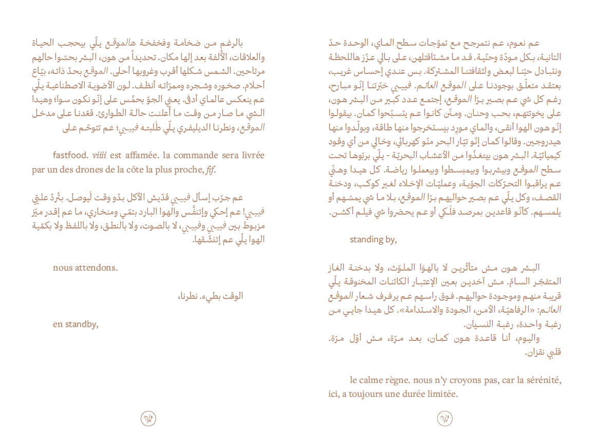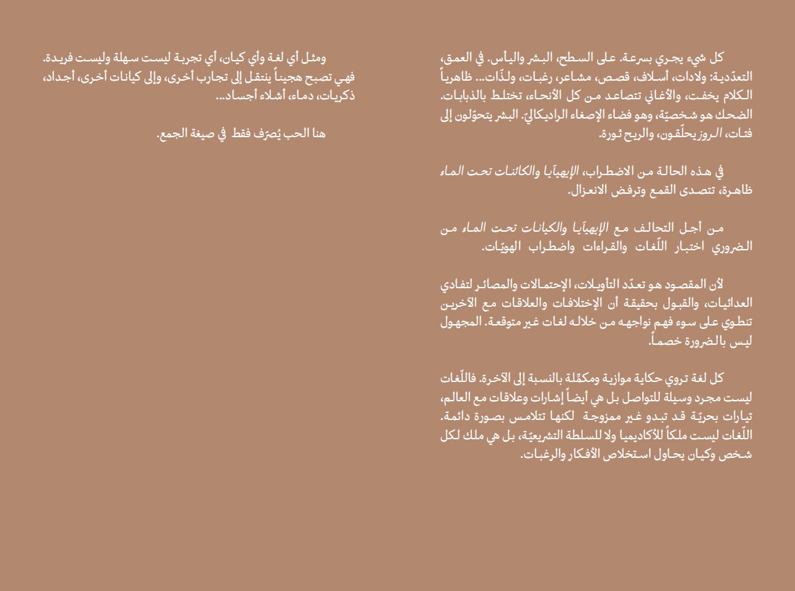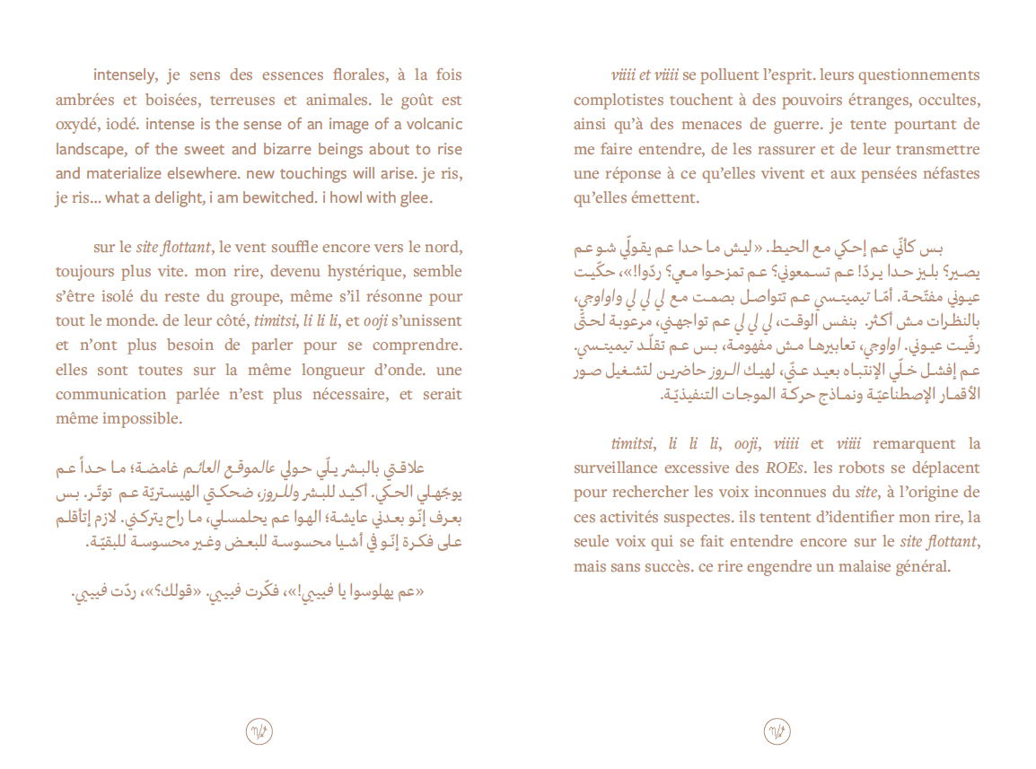 chaque langue raconte donc une histoire parallèle et complémentaire vis-à-vis de chaque autre. car les langues ne sont pas de simples moyens de communication mais aussi des gestes, des rapports au monde, des courants marins qui n'ont pas l'air de se mélanger et pourtant se touchent constamment. les langues n'appartiennent ni à l'académie, ni au pouvoir législatif, mais bien à chaque entité qui tente d'en extraire des pensées et des désirs. et, comme chaque langue, chaque entité, un vécu n'est ni simple, ni singulier. il s'hybride, se transfère à d'autres vécus, d'autres entités, des ancêtres, des mémoires, du sang, des bouts de corps.