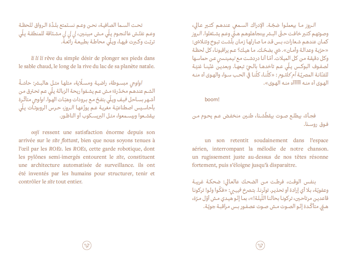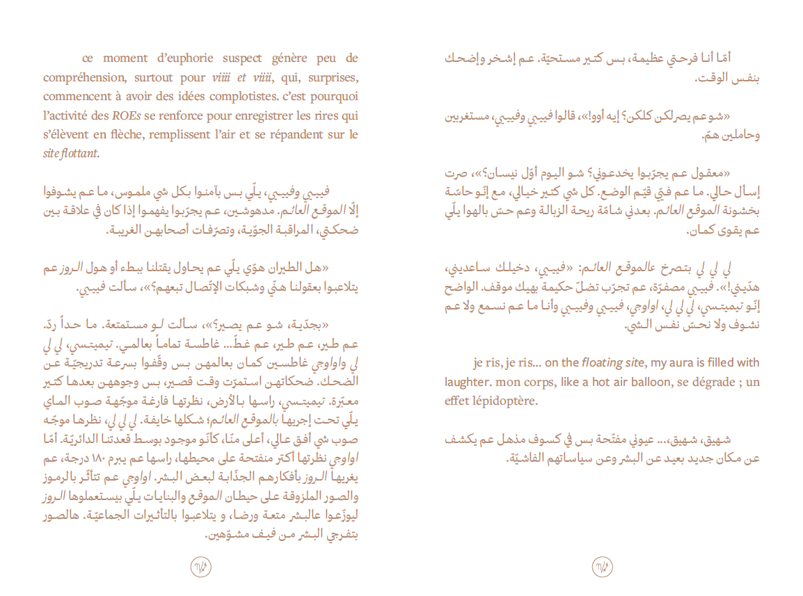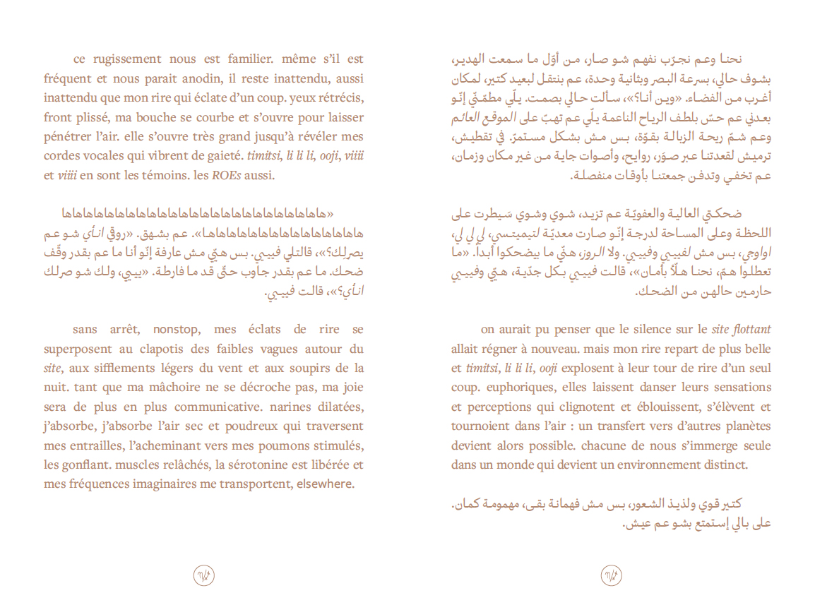 « tout se passe très vite. en surface, des humains, du désespoir. en profondeur, une multiplicité : des naissances, des ancêtres, des histoires, des émotions, des envies, des désirs… ostensiblement, les paroles s'atténuent, des chants s'élèvent, de tous les côtés, des vibrations s'entremêlent. le rire est personnage, l'espace d'écoute radical. les humains se morcellent, les ROEs s'envolent. le vent est une révolution.