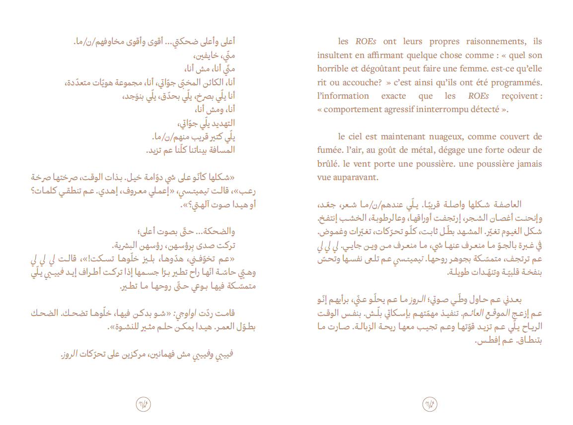 Dans ce livre, chaque langue raconte une histoire parallèle et complémentaire vis-à-vis de chaque autre. Les vécus des entités et des personnages de l'histoire, comme les langues, s'hybrident, se transfèrent à d'autres vécus, à des ancêtres, des mémoires, du sang, des bouts de corps.