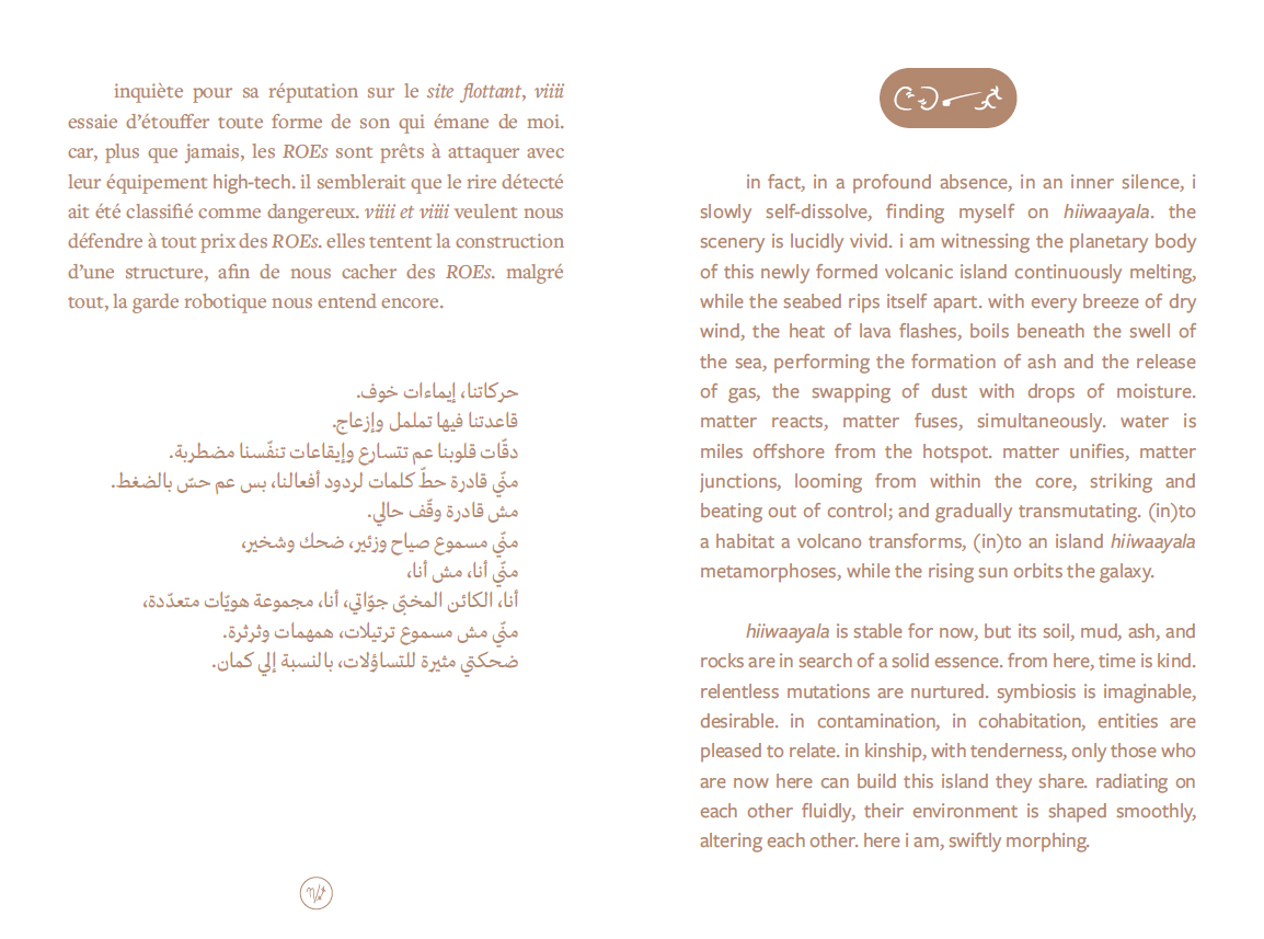 dans la tourmente, surgissent les ehiiaya et les entités sous l'eau pour affronter l'oppression et refuser la réclusion. pour s'allier aux ehiiaya et les entités sous l'eau, il est essentiel d'éprouver les langues, les lectures et troubler les identités.