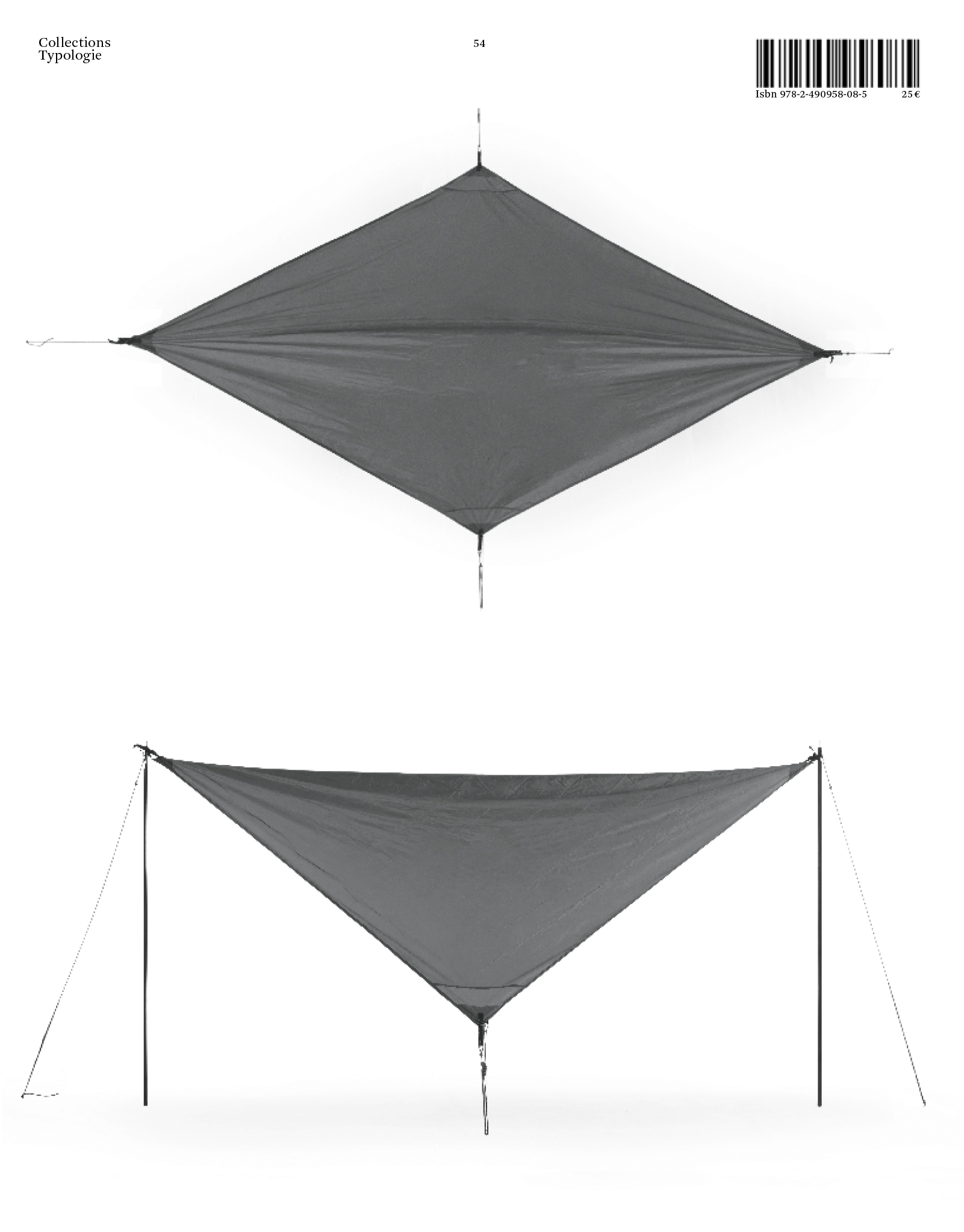 Le nouvel ouvrage des Collections Typologie est consacré à la tente de camping. Motif commun des paysages ruraux et des espaces urbains, la tente est une typologie omniprésente dont la simplicité apparente est trompeuse. A mi-chemin entre l'architecture que l'on manipule et le mobilier que l'on habite, la tente recouvre de nombreux usages et fait converger des réalités hétéroclites. Réminiscence de huttes primitives, descendante des campements militaires, abri de loisir ou de fortune, précaire tout en étant résistante, protectrice mais poreuse, la tente est utilisée autant en milieux balisés qu'extrêmes. Assemblage élémentaire de matériaux ultra-performants, elle est conçue en Occident et produite en Asie du Sud-Est. Plus encore que les objets mono-matériaux étudiés dans les précédentes revues de Typologie, cet objet composite permet de prendre conscience de la nature complexe des choses qui nous entourent.