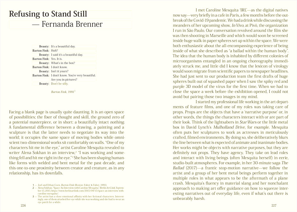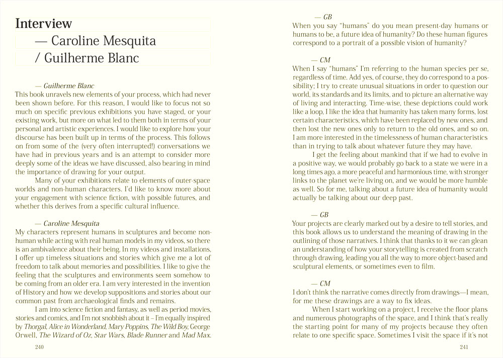 Cette publication rassemble des croquis, des vues d'installations et une abondante documentation, ainsi qu'une analyse approfondie de la pratique de Caroline Mesquita, mettant en lumière son processus unique de création artistique, de la conception d'une idée à l'œuvre finale, de la déconstruction des identités de ses personnages à la création incessante de mondes différents. La vaste iconographie est complétée par des essais critiques de Fernanda Brenner et Loïc Le Gall et d'un entretien avec Guilherme Blanc, offrant un aperçu complet de la production et du cadre de référence de Mesquita.