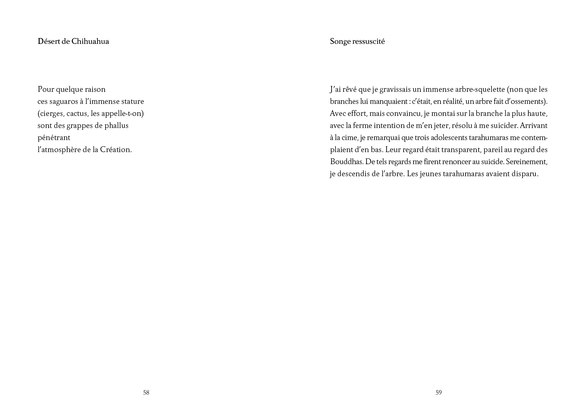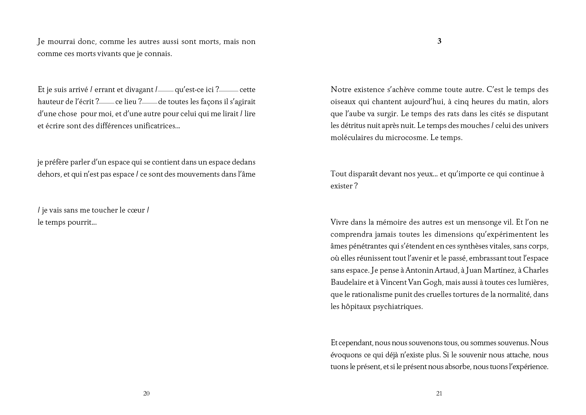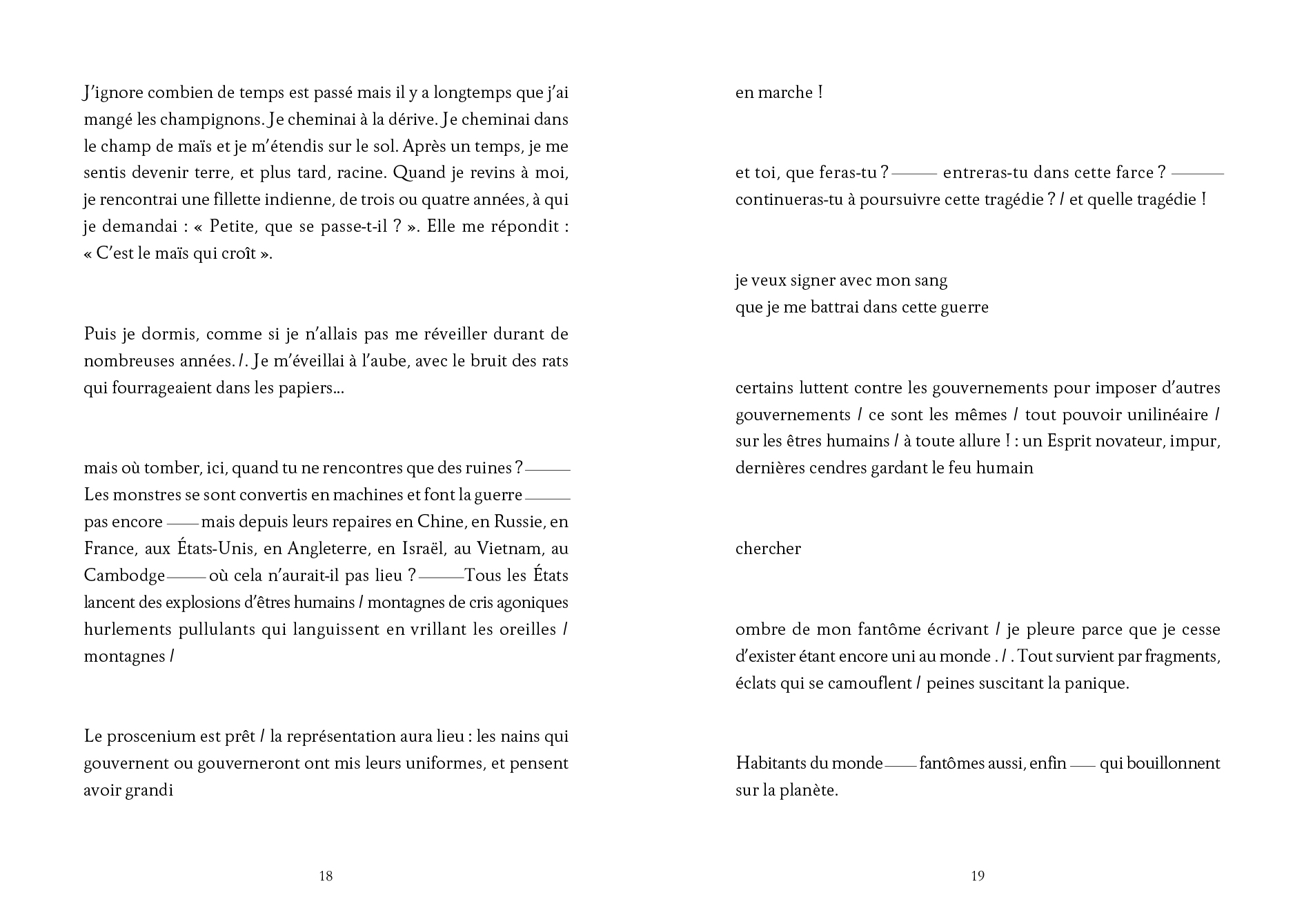 « mais où tomber, ici, quand tu ne rencontres que des ruines ?__Les monstres se sont convertis en machines et font la guerre__pas encore__mais depuis leurs repaires en Chine, en Russie, en France, aux États-Unis, en Angleterre, en Israël, au Vietnam, au Cambodge__où cela n'aurait-il pas lieu ? Tous les États lancent des explosions d'êtres humains / montagnes de cris agoniques hurlements pullulants qui languissent en vrillant les oreilles / montagnes / »