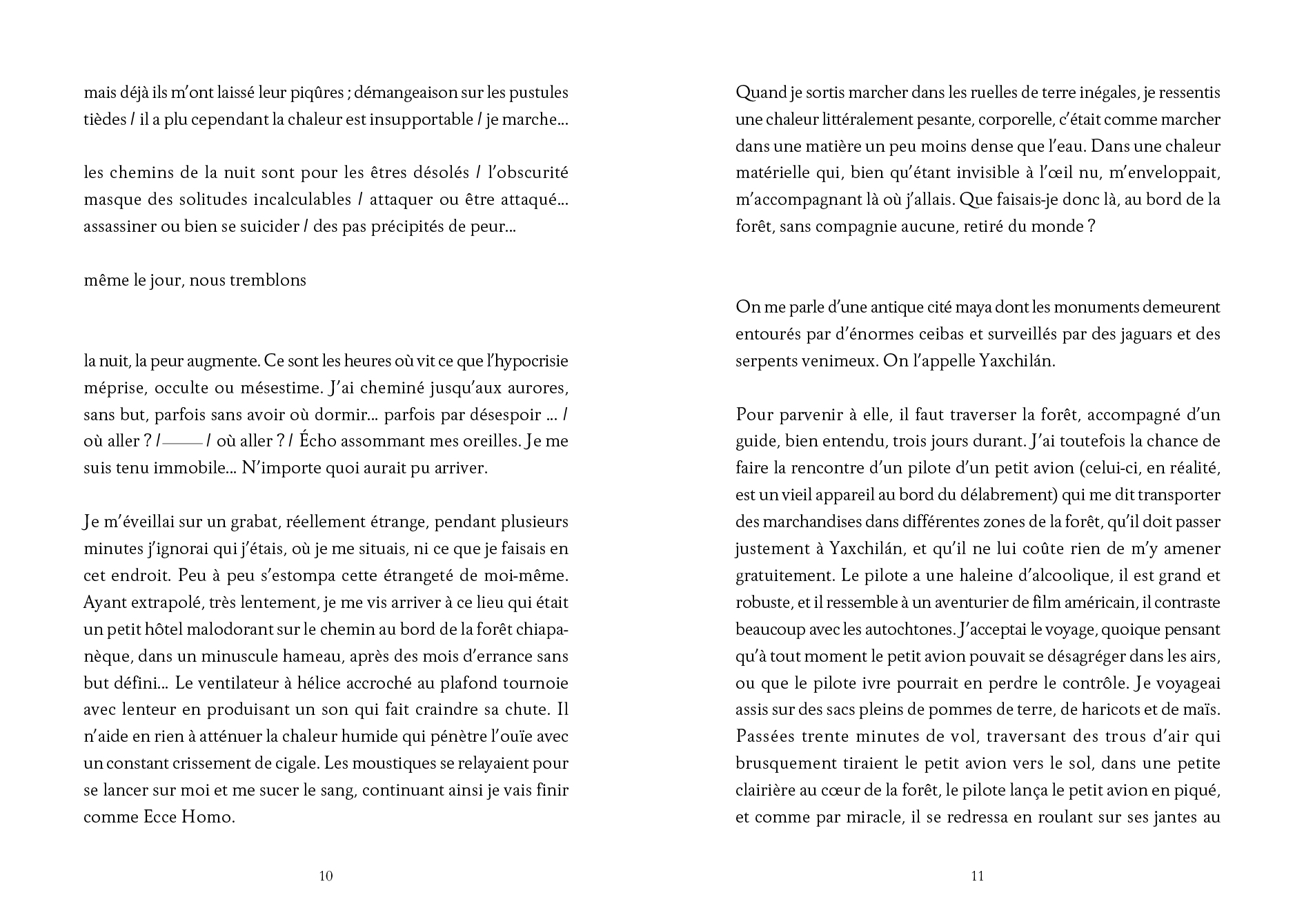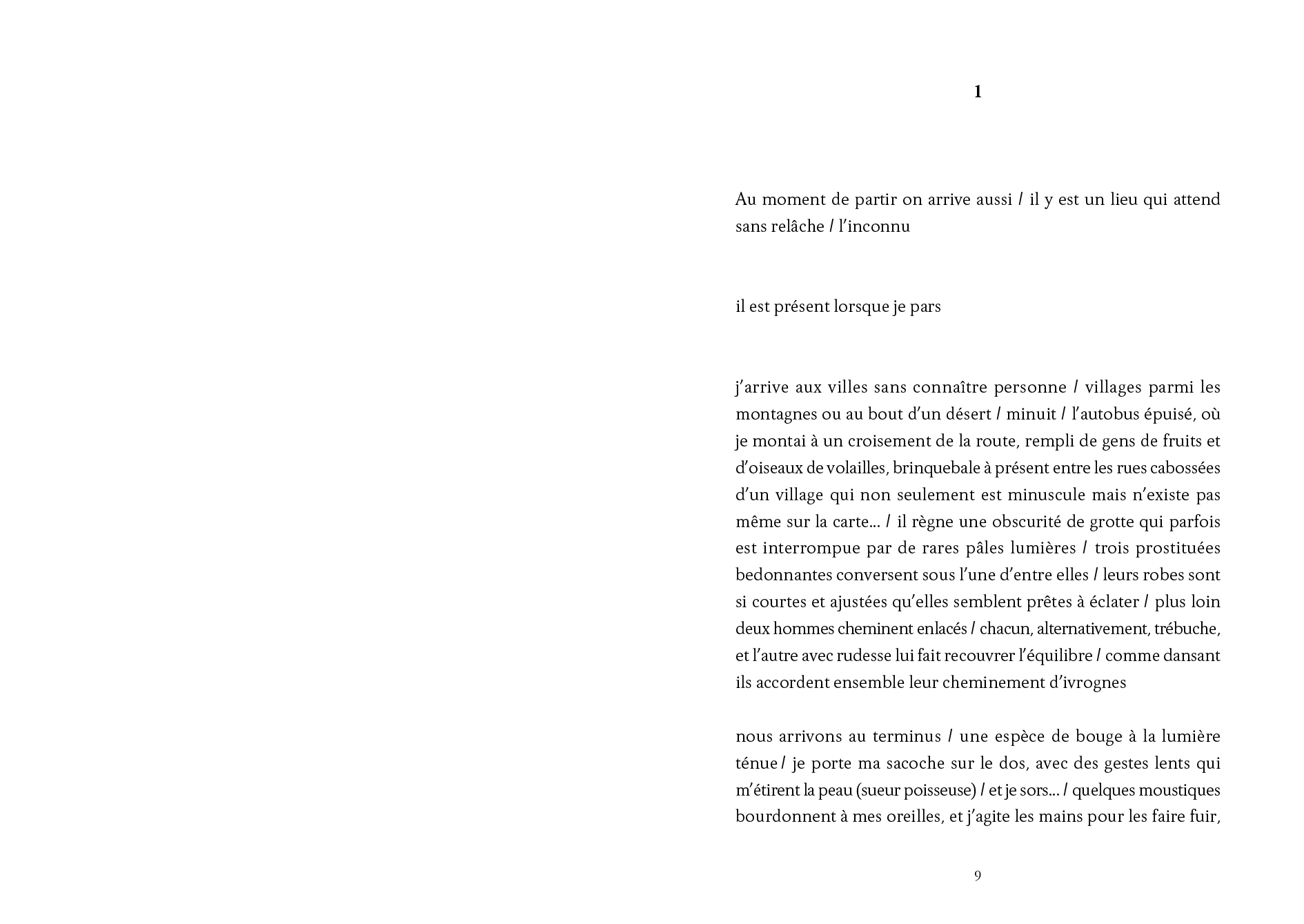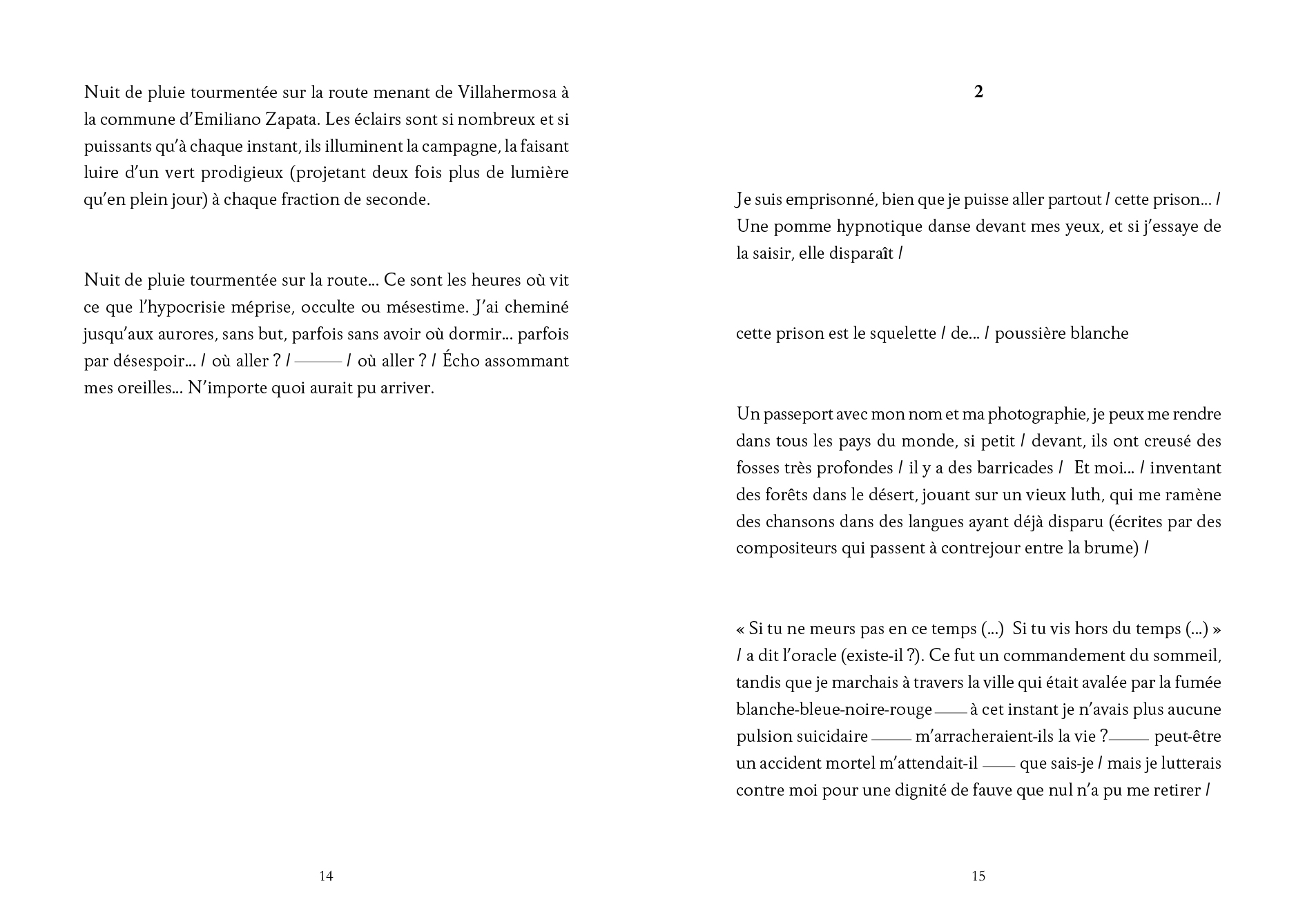 « mais où tomber, ici, quand tu ne rencontres que des ruines ?__Les monstres se sont convertis en machines et font la guerre__pas encore__mais depuis leurs repaires en Chine, en Russie, en France, aux États-Unis, en Angleterre, en Israël, au Vietnam, au Cambodge__où cela n'aurait-il pas lieu ? Tous les États lancent des explosions d'êtres humains / montagnes de cris agoniques hurlements pullulants qui languissent en vrillant les oreilles / montagnes / »