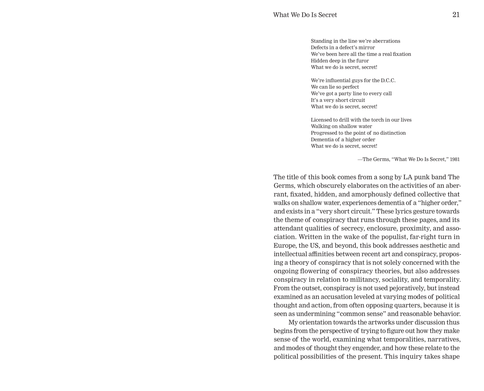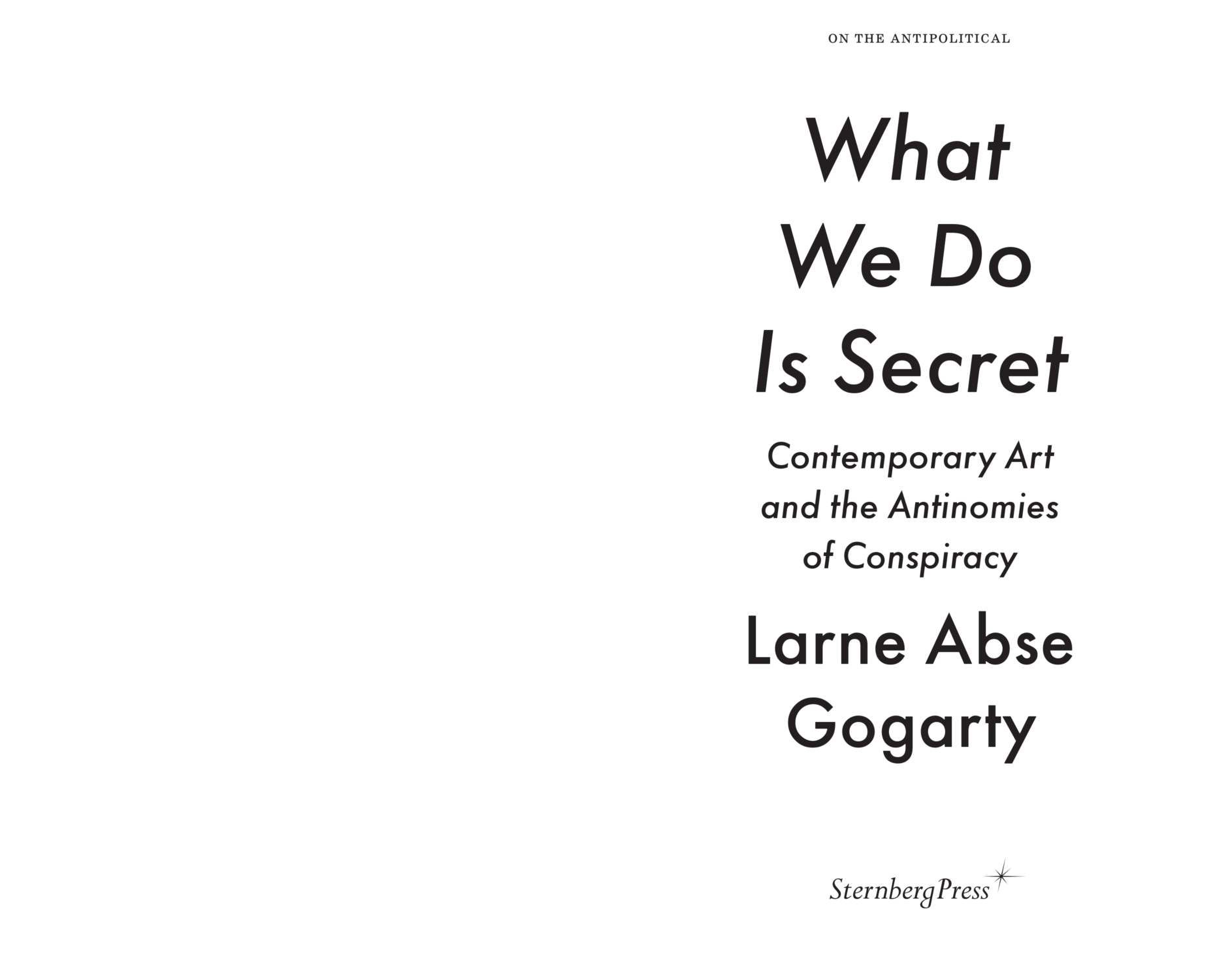 Written in the wake of the far-right populist turn in Europe, the US, and beyond, What We Do Is Secret addresses aesthetic and intellectual affinities between recent art and conspiracy, proposing a theory of conspiracy that is not primarily concerned with conspiracy theory. This inquiry takes shape across chapters on the politics of post-internet art aesthetics; the sublime and possessive individualism in recent "critical" art; Cady Noland's security fences, and silkscreens of the Symbionese Liberation Army; and mutuality, secrecy, and improvisation in the work of Ima-Abasi Okon. Larne Abse Gogarty discusses the relationship between culture and contemporary politics, following on from David Lloyd's proposition that through its compensatory qualities, the aesthetic sphere naturalizes forms of life lived under the rule of property. What kind of art can work against this? Can art exist as a conspiracy capable of corroding that rule?