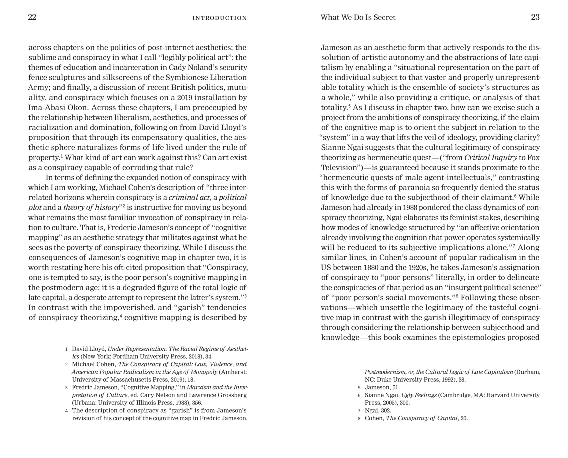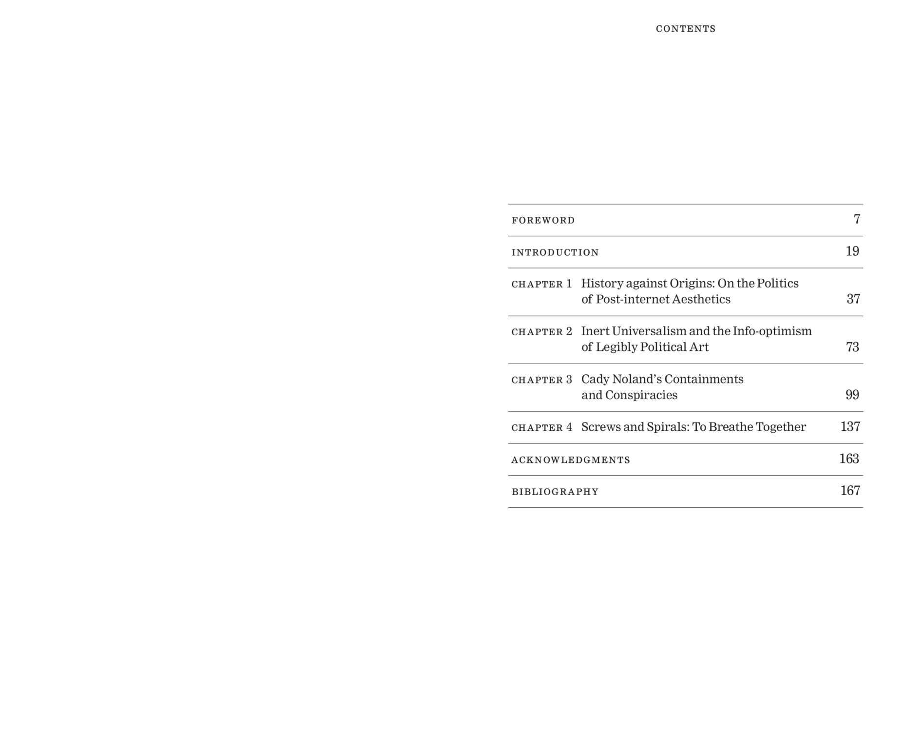 « In a time of rampant conspiracy theories and actual criminal conspirators in power, what do we make of the conspiracy as a practice conceived from below? Across trenchant analyses that range from the contemporary resurfacing of fascist aesthetics to the radical work of artists including Cady Noland and Ima-Abasi Okon, Larne Abse Gogarty gives reason to believe that art can again be a space of insurgent interventions rather than one of liberal reconciliation. »
