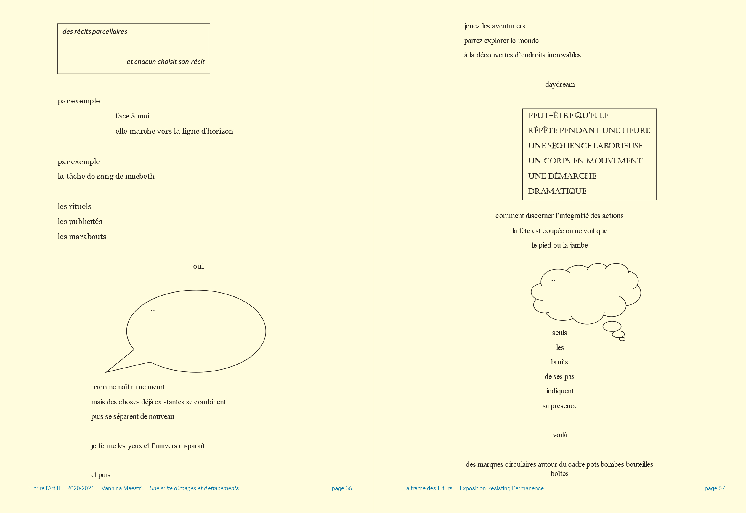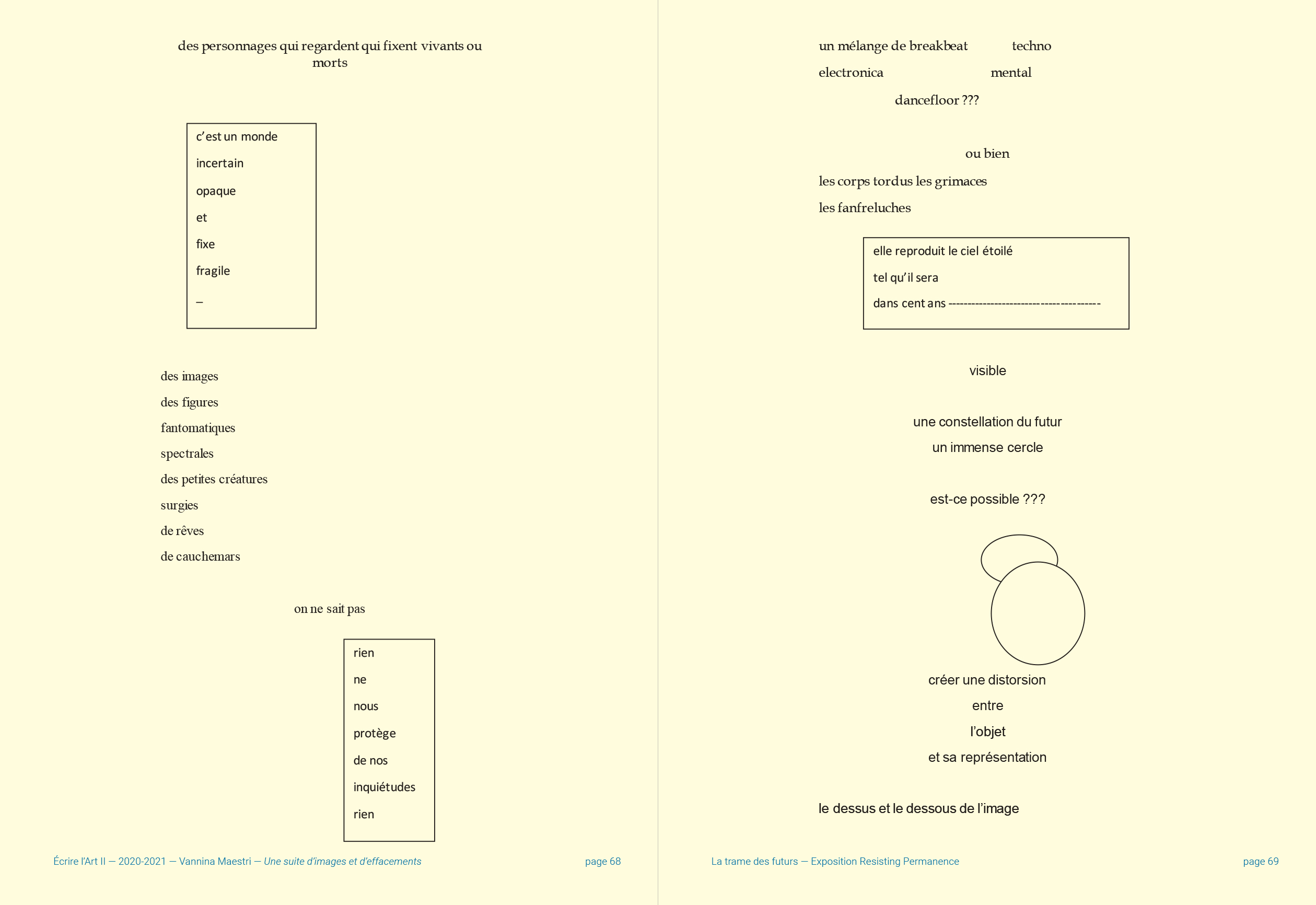 L'écrivaine et performeuse Vannina Maestri est auteure associée à la saison d'exposition 2020-2021 de La Kunsthalle Mulhouse. Elle s'est immergée dans l'univers de trois expositions, a composé librement autour des œuvres et des idées qu'elle y a perçues.