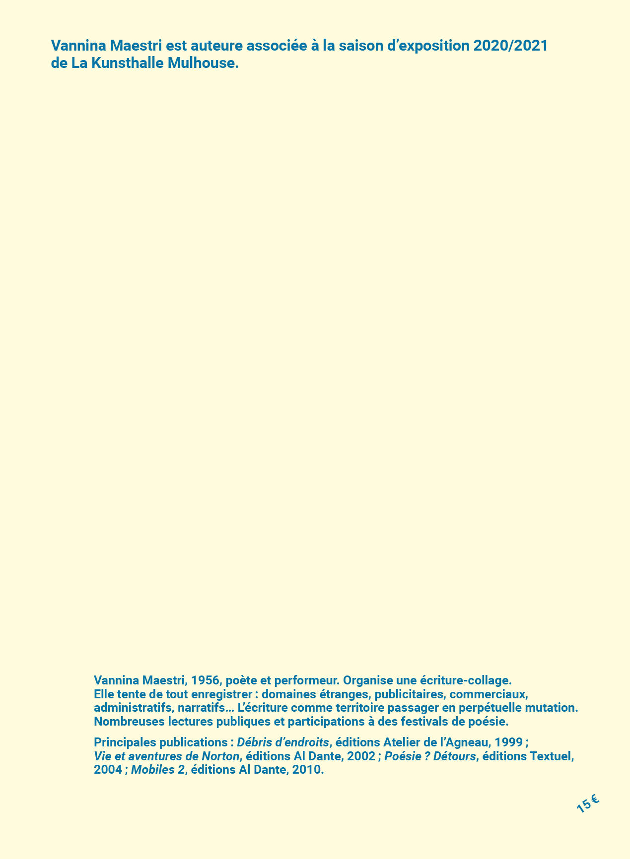 Auteure et performeuse, Vannina Maestri (née en 1956, vit et travaille à Paris) organise une écriture-collage. Elle tente de tout enregistrer : domaines étranges, publicitaires, commerciaux, administratifs, narratifs… L'écriture comme territoire passager en perpétuelle mutation. Vannina Maestri a fondé et dirigé, avec