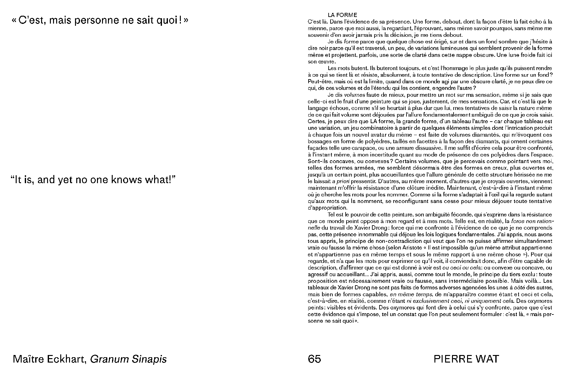 « Memento mori. Il y a de la vanité dans la peinture de Xavier Drong, quelque chose comme une méditation sur un monde en train de perdre son humanité. Prévenants, ses tableaux le sont aussi par leur lumière, certes peu rassurante, mais présente malgré tout : tentant de préserver, à sa façon pauvre et fragile, ce monde aspiré par la force négative de l'obscurité. Là est le peintre, là est son lieu et son rôle. »