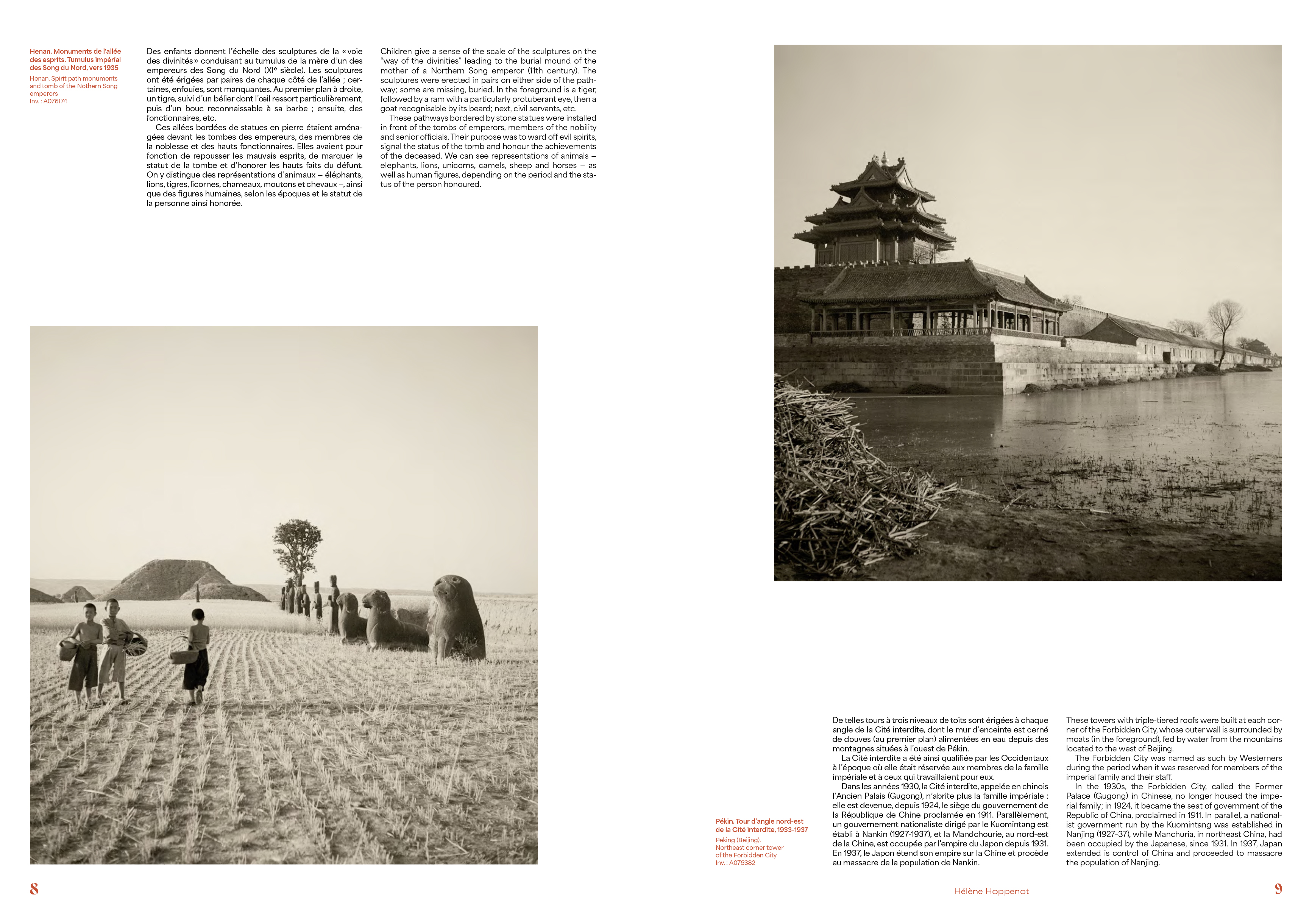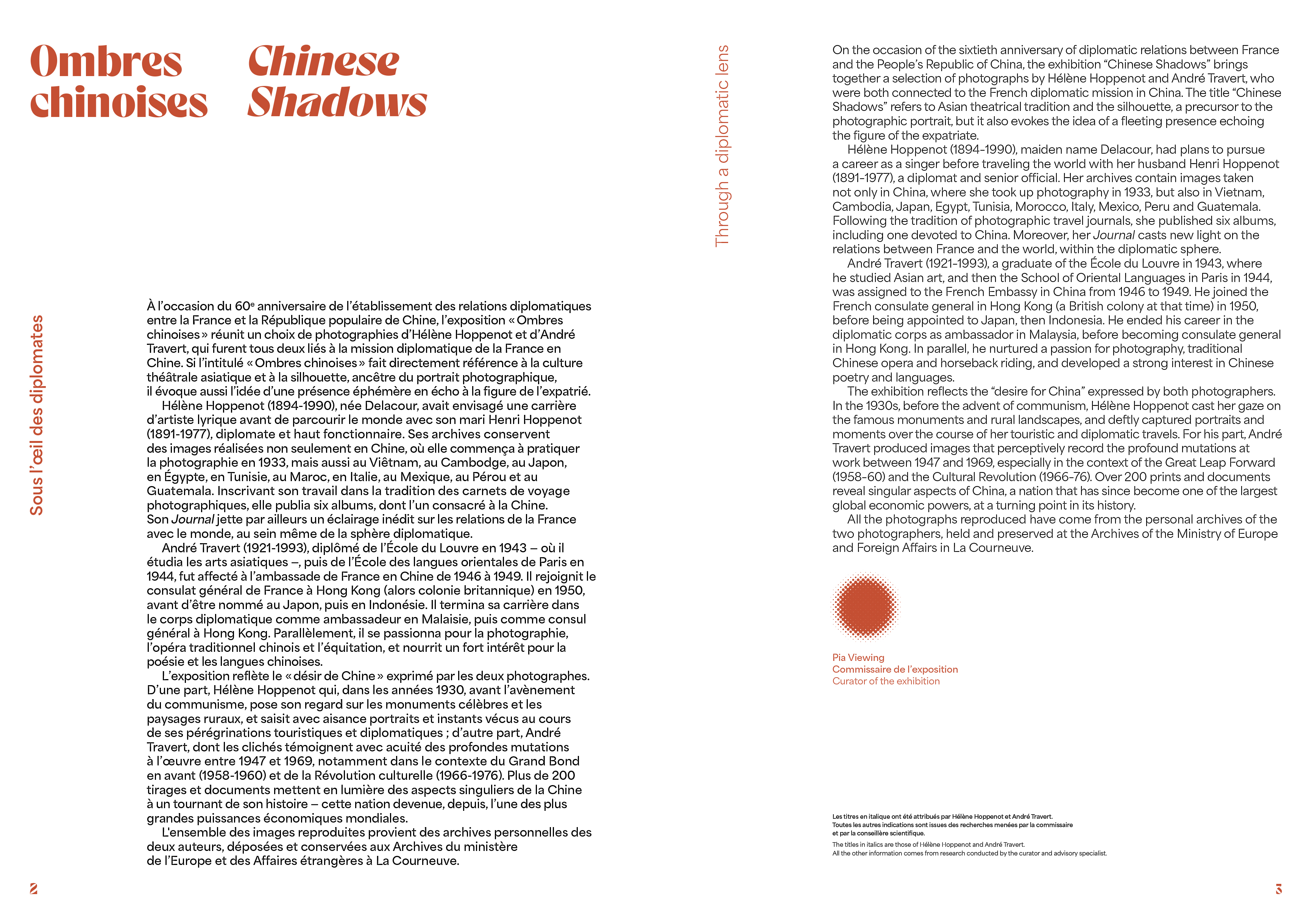 L'exposition, issue des très riches Archives du ministère des Affaires étrangères, est constituée de photographies d'Hélène Hoppenot (Pékin et alentours, années 1930) et de celles d'André Travert (secrétaire de l'ambassade de France à Nankin dès 1946, puis Hong Kong). Cette sélection d'images et de documents méconnus ou inédits invite à suivre le parcours de ces personnalités remarquables qui ont fait de leur séjour en Chine plus qu'une mission en service commandé, un véritable voyage initiatique.