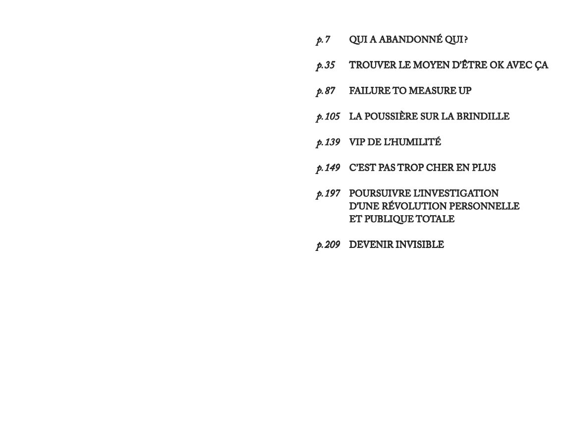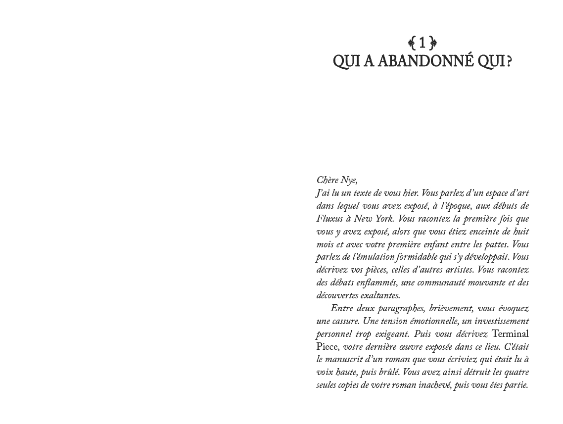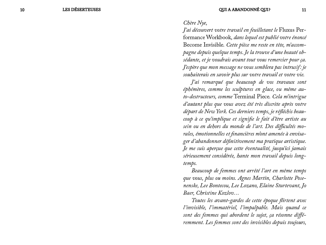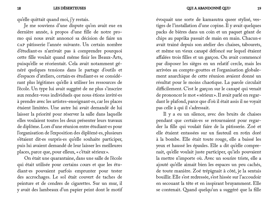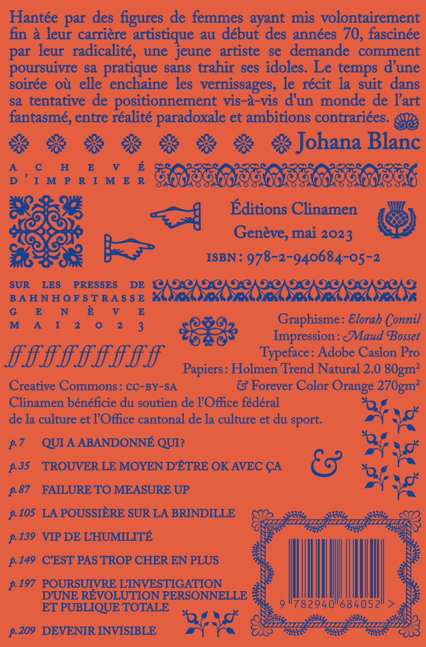Le premier roman de l'artiste, éditeur et écrivain suisse : hantée par des figures de femmes ayant mis volontairement fin à leur carrière artistique au début des années 70, fascinée par leur radicalité, une jeune artiste se demande comment poursuivre sa pratique sans trahir ses idoles. Le temps d'une soirée où elle enchaîne les vernissages, le récit la suit dans sa tentative de positionnement vis-à -vis d'un monde de l'art fantasmé, entre réalité paradoxale et ambitions contrariées.