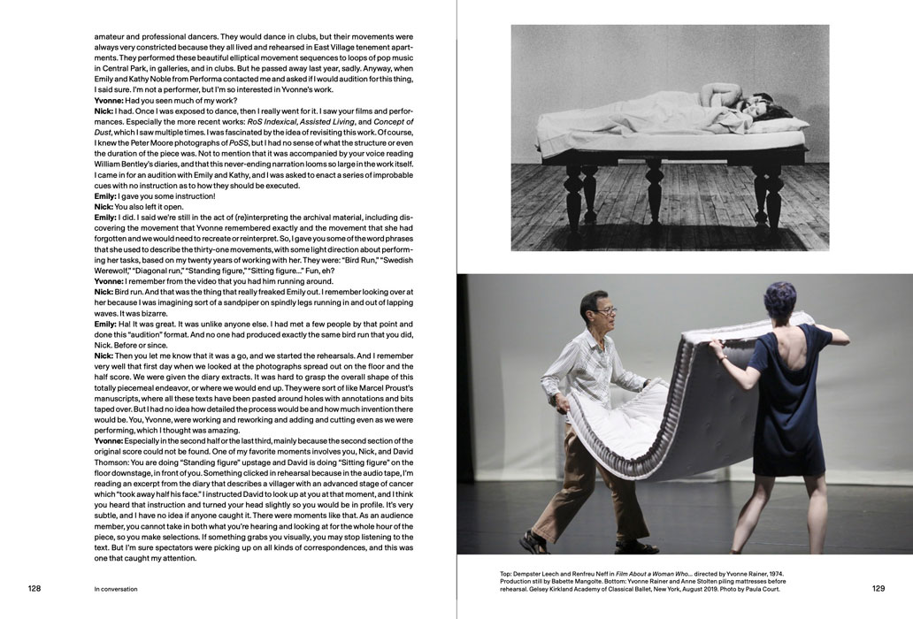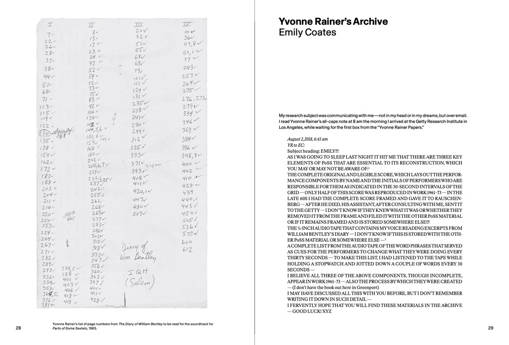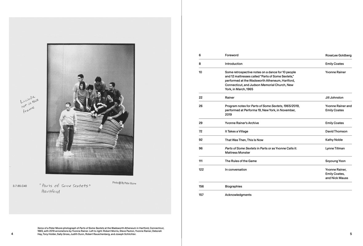 Textes et contributions de Emily Coates, RoseLee Goldberg, Jill Johnston, Kathy Noble, Yvonne Rainer, David Thomson, Lynne Tillman and Soyoung Yoon ; conversation entre Nick Mauss.