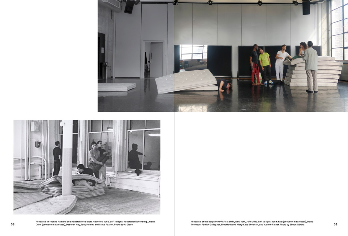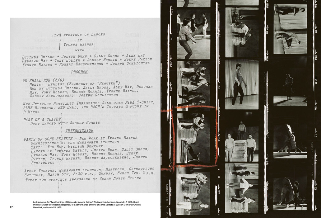 Ce livre, conçu par l'artiste visuel Nick Mauss, comprend des images d'archives et des documents inédits des représentations de 1965 à la Judson Memorial Church de New York et au Wadsworth Atheneum de Hartford, dans le Connecticut. Des textes d'Emily Coates, RoseLee Goldberg, Jill Johnston, Kathy Noble, Yvonne Rainer, David Thomson, Lynne Tillman et Soyoung Yoon, ainsi qu'un nouvel entretien avec Rainer, posent des questions sur les trajectoires des œuvres d'art, des interprètes et du public, tout en retraçant la vie – et le devenir » d'une danse.