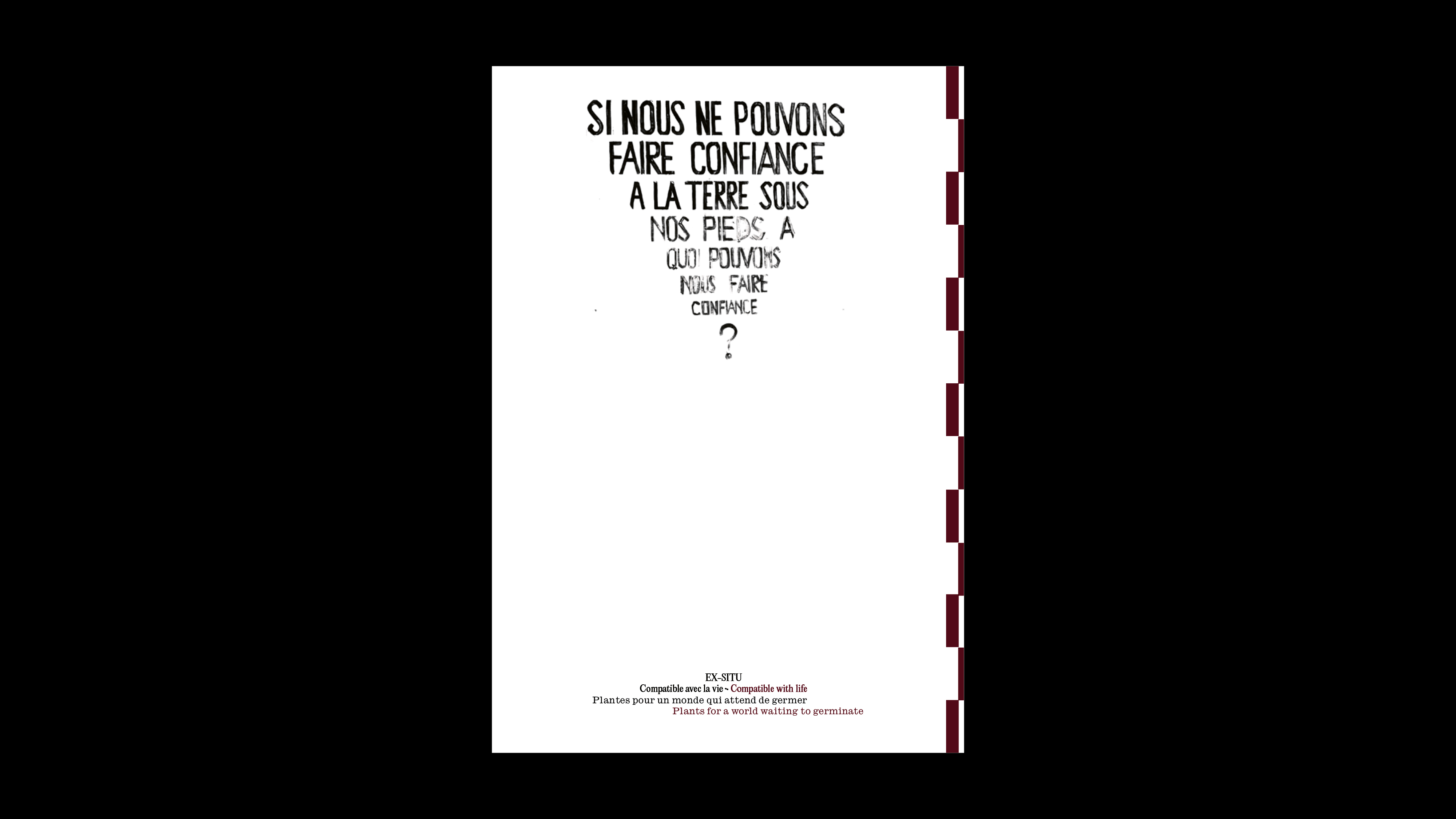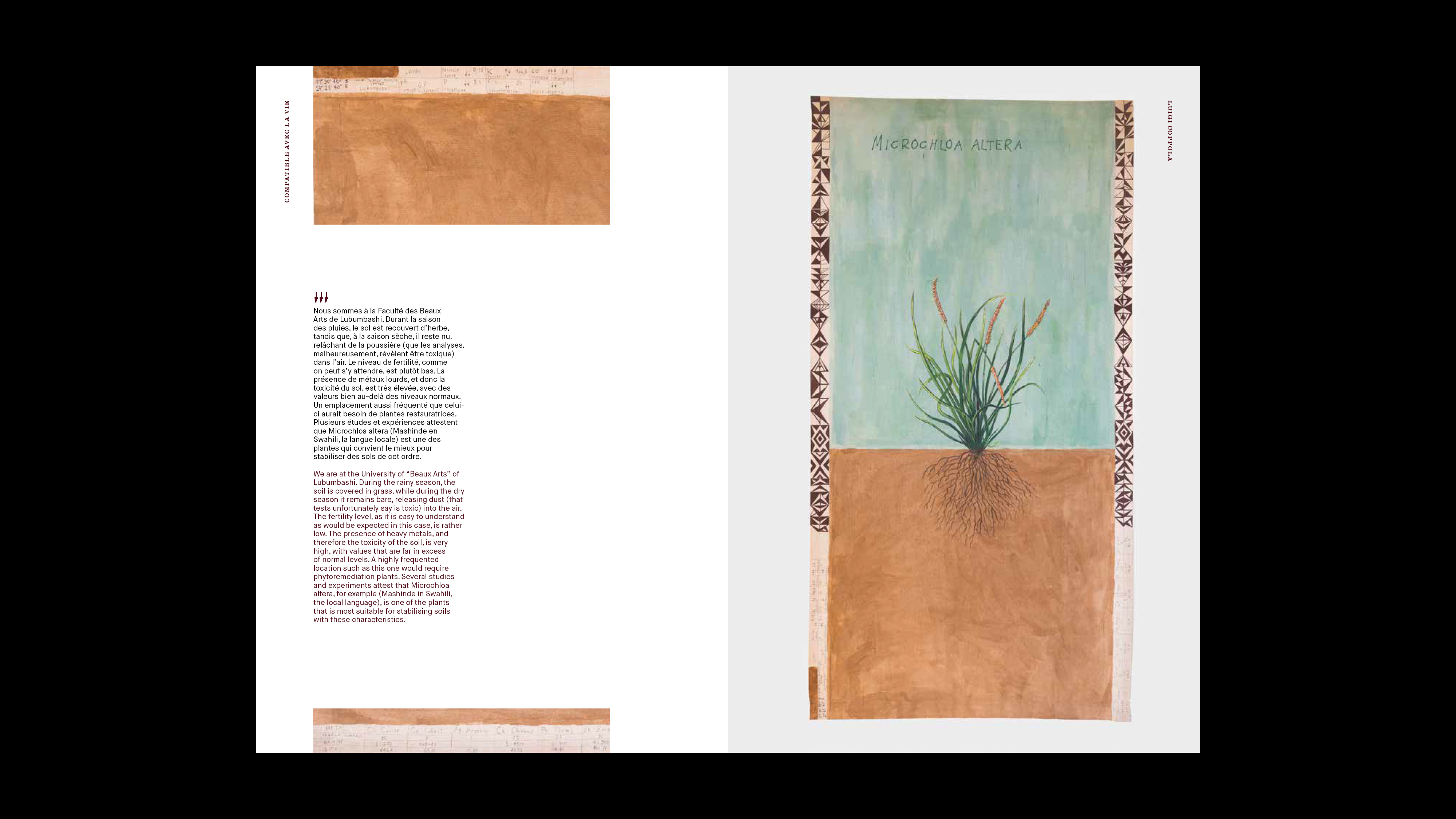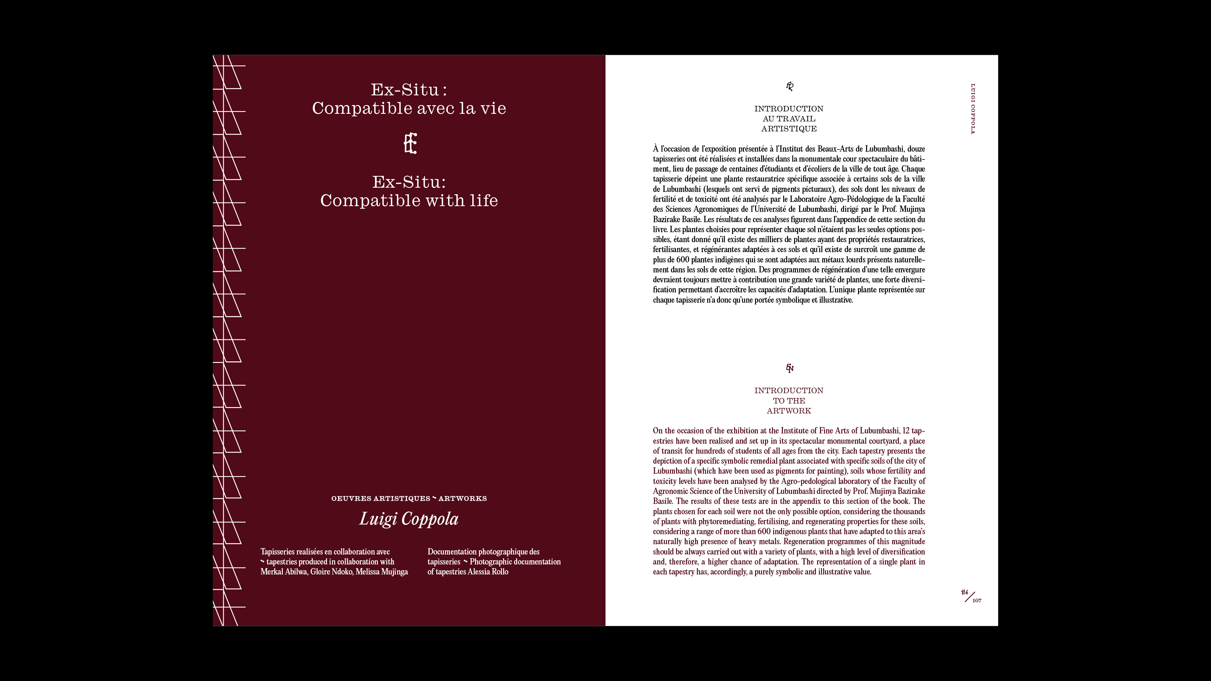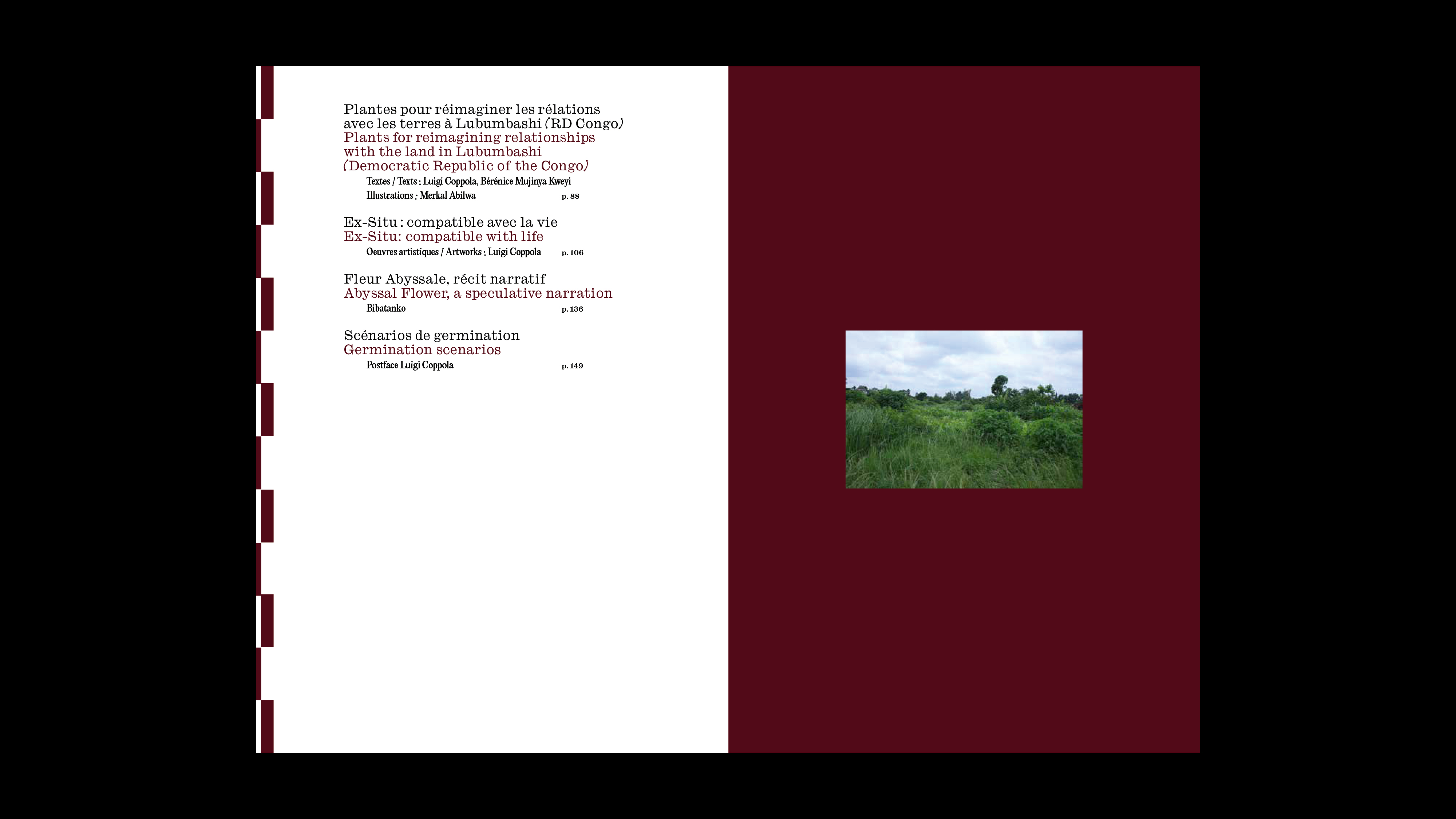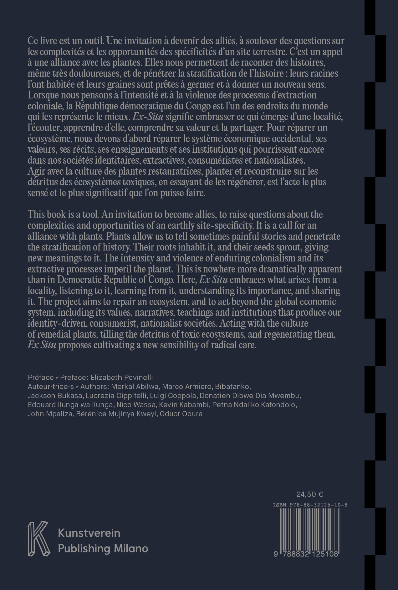 Ce livre est un outil. Une invitation à devenir des alliés, à soulever des questions sur les complexités et les opportunités des spécificités d'un site terrestre. C'est un appel à une alliance avec les plantes. Elles nous permettent de raconter des histoires, même très douloureuses, et de pénétrer la stratification de l'histoire : leurs racines l'ont habitée et leurs graines sont prêtes à germer et à donner un nouveau sens. Lorsque nous pensons à l'intensité et à la violence des processus d'extraction coloniale, la République démocratique du Congo est l'un des endroits du monde qui les représente le mieux. Ex Situ signifie embrasser ce qui émerge d'une localité, l'écouter, apprendre d'elle, comprendre sa valeur et la partager. Pour réparer un écosystème, nous devons d'abord réparer le système économique occidental, ses valeurs, ses récits, ses enseignements et ses institutions qui pourrissent encore dans nos sociétés identitaires, extractives, consuméristes et nationalistes. Agir avec la culture des plantes restauratrices, planter et reconstruire sur les détritus des écosystèmes toxiques, en essayant de les régénérer, est l'acte le plus sensé et le plus significatif que l'on puisse faire.