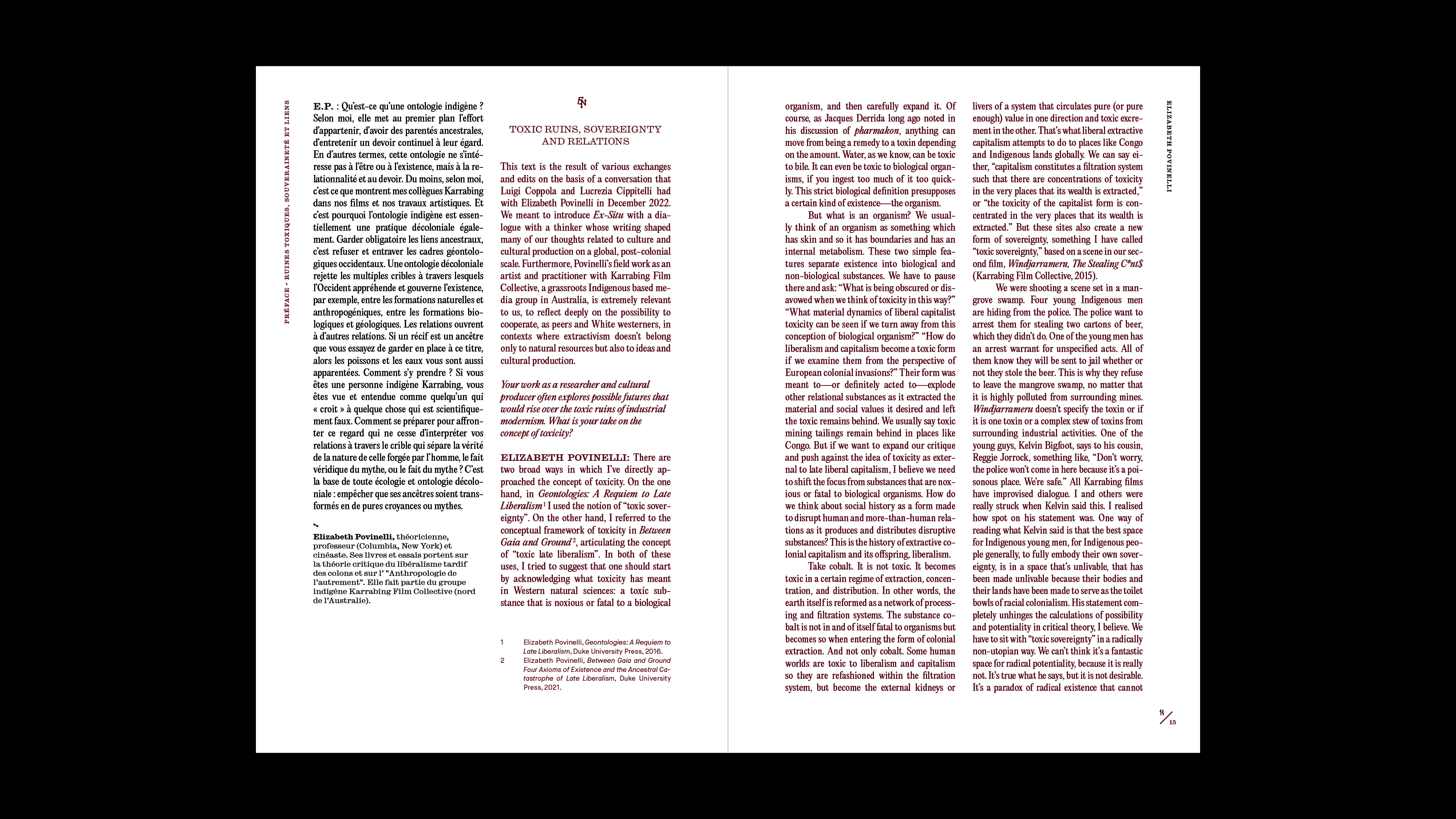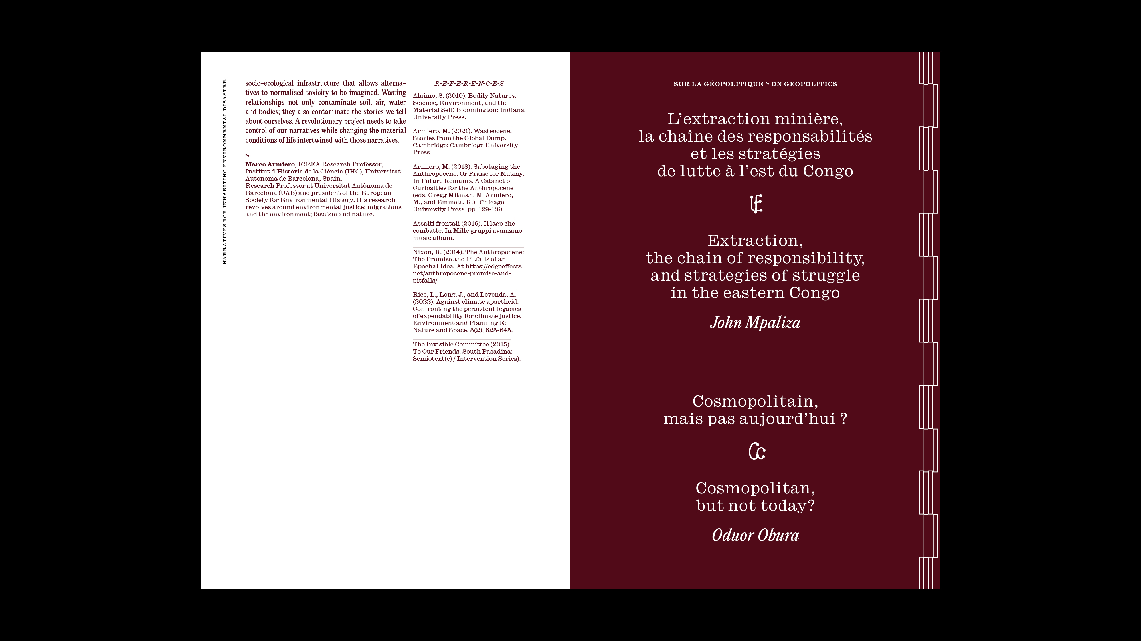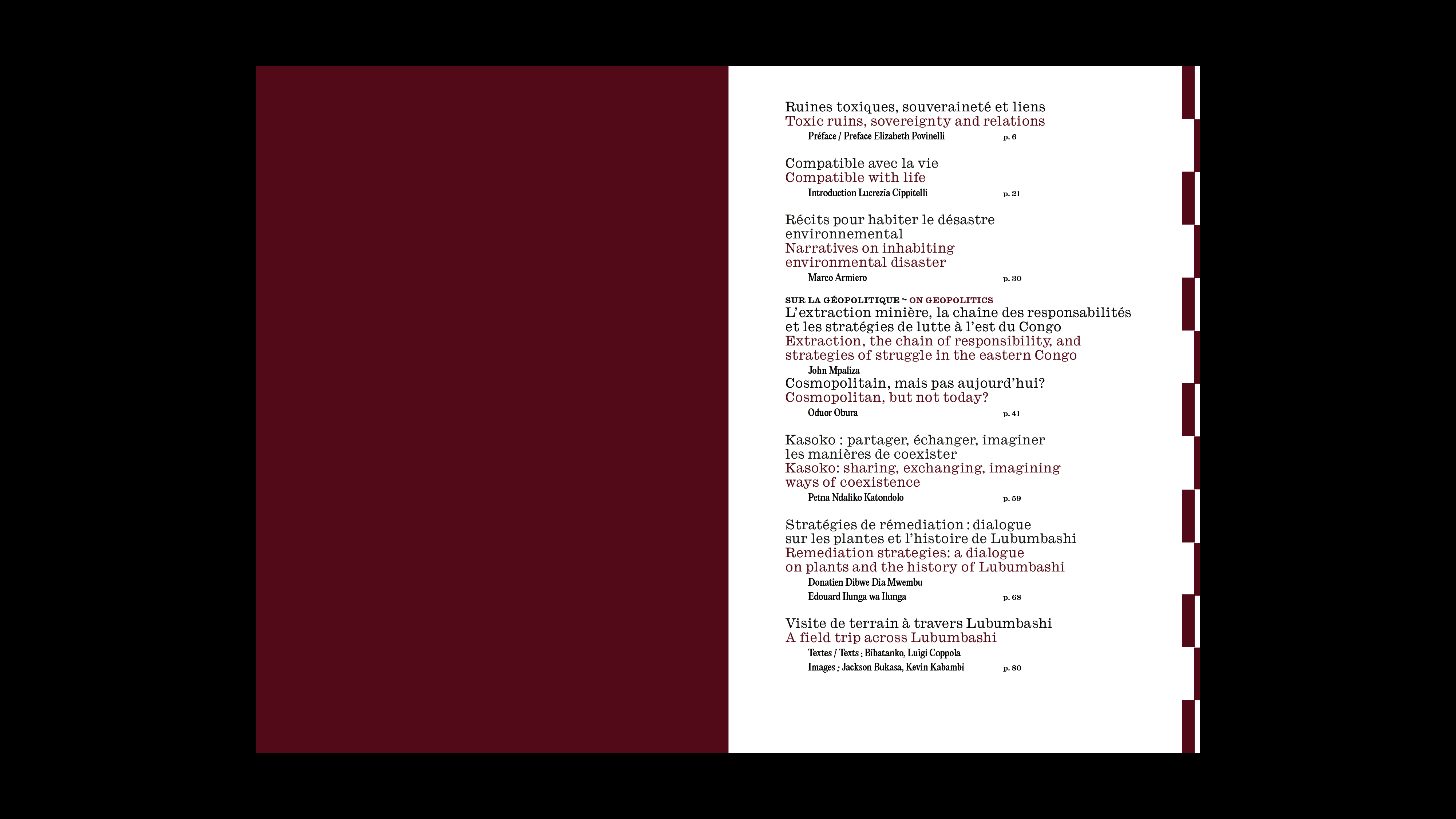 Contributions de Elizabeth A. Povinelli, Merkal Abilwa, Marco Armiero, Bibatanko, Jackson Bukasa, Lucrezia Cippitelli, Luigi Coppola, Donatien Dibwe Dia Mwembu, Edouard Ilunga wa Ilunga, Nico Wassa, Kevin Kabambi, Petna Ndaliko Katondolo, John Mpaliza, Bérénice Mujinya Kweyi, Oduor Obura.