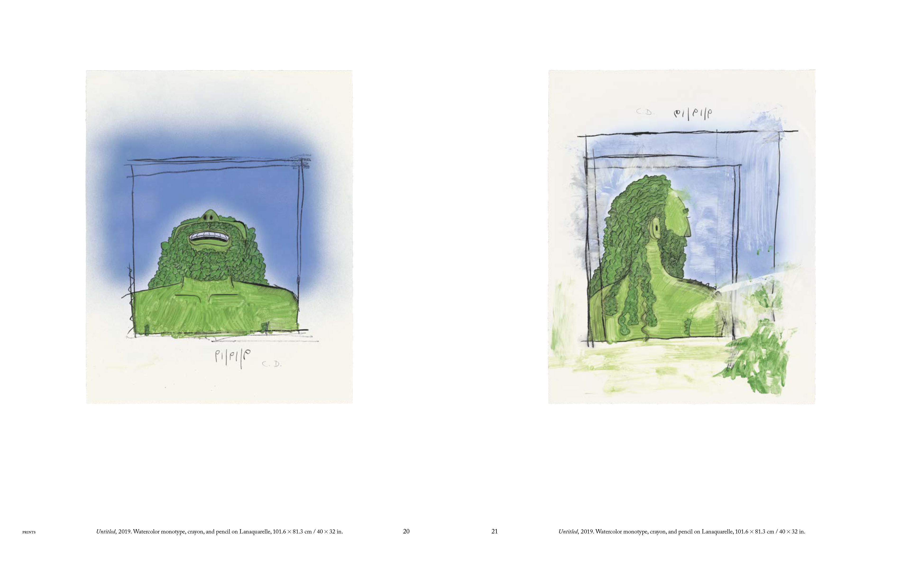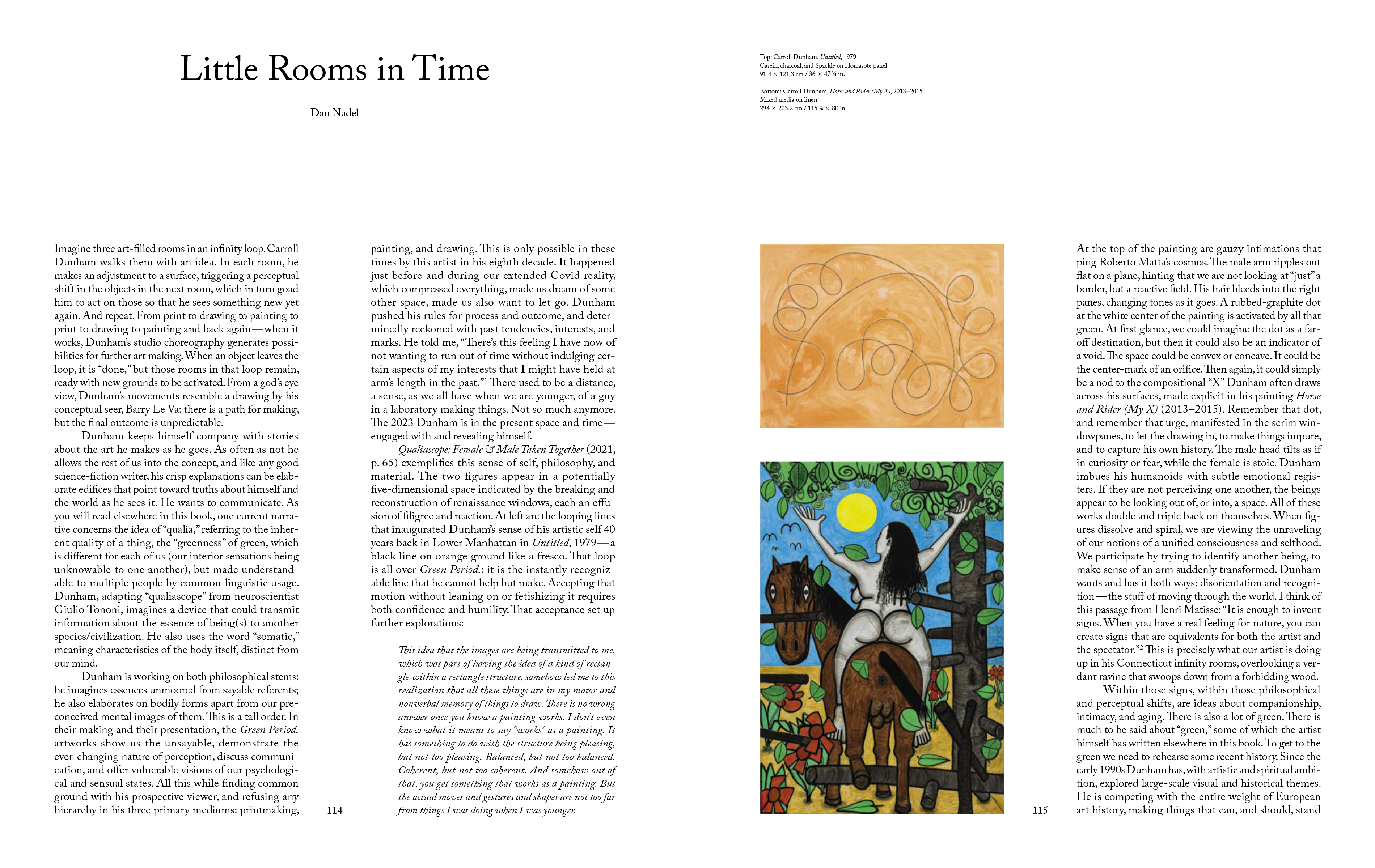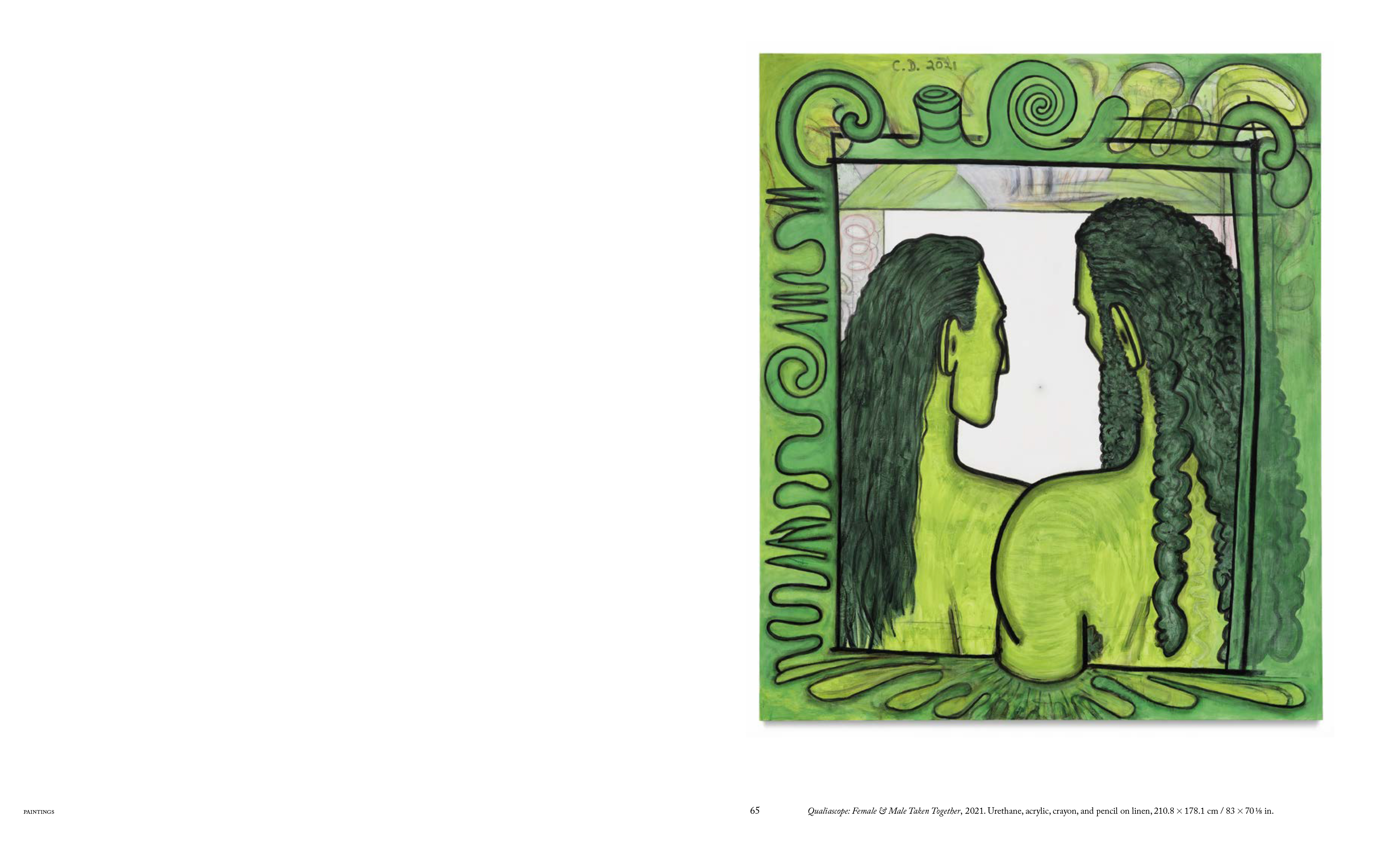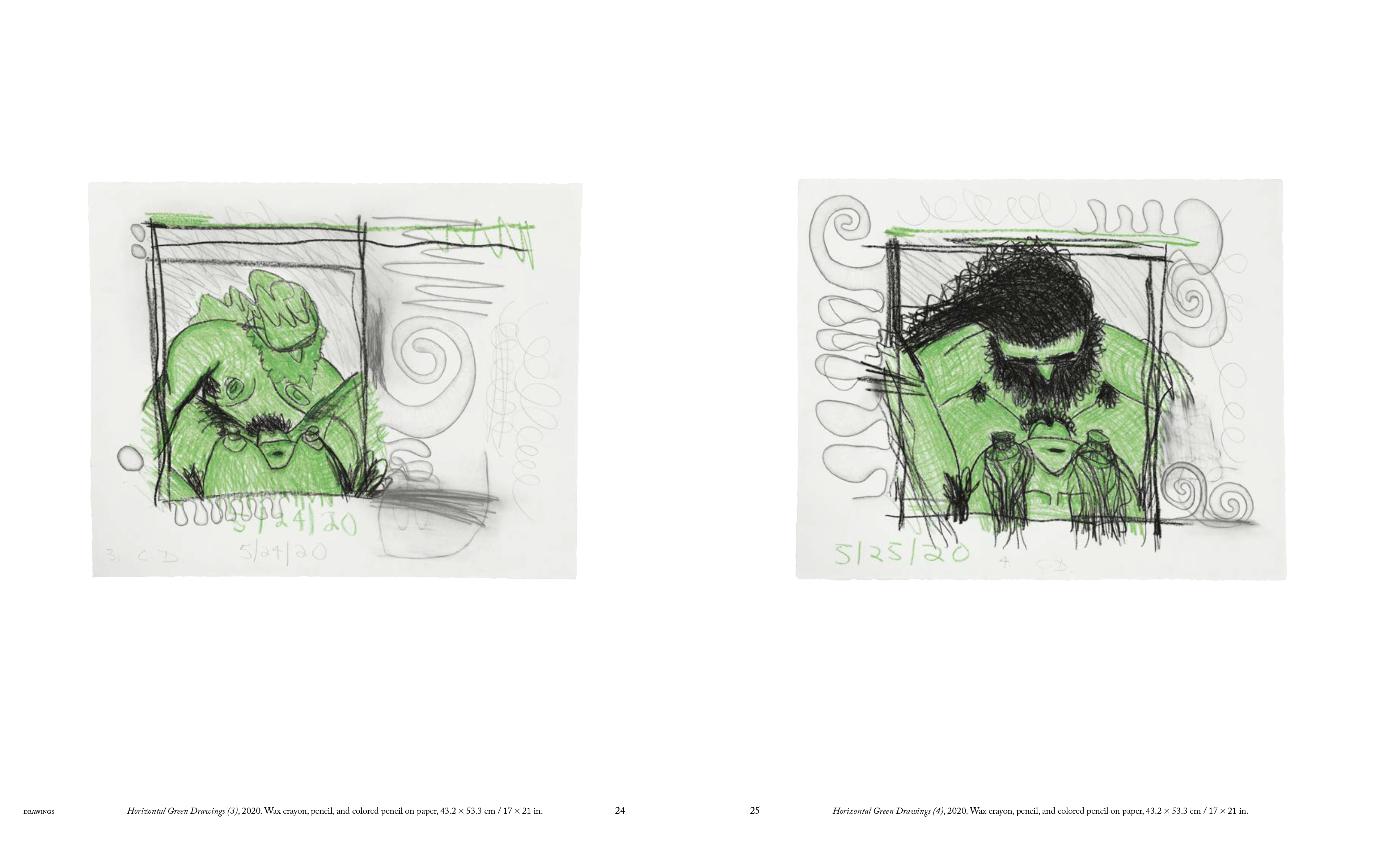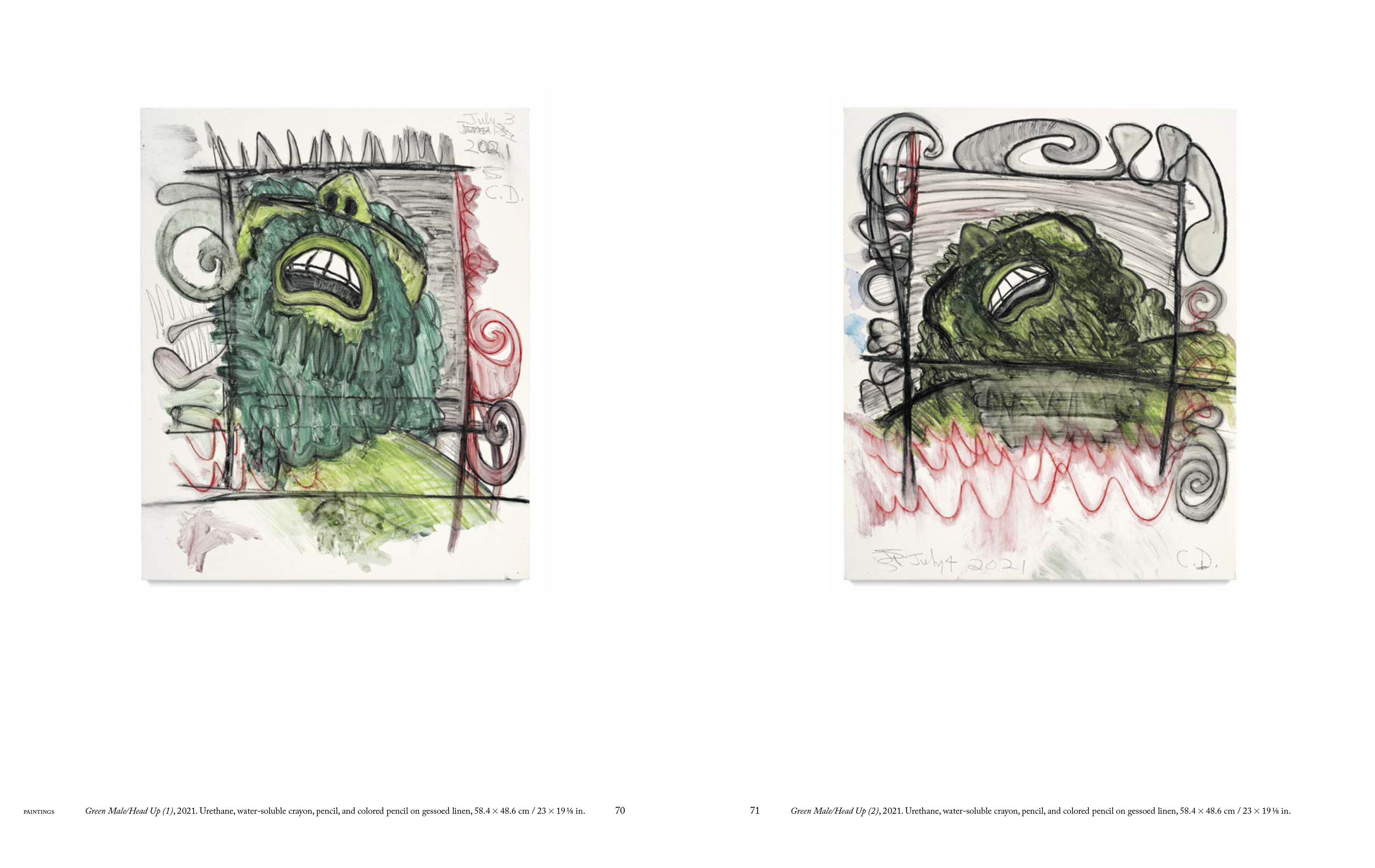 Centrée sur la « période verte » de Carroll Dunham, cette publication rassemble des œuvre imprimées, des dessins et des peintures réalisés entre 2018 et 2022 pour former l'un de ses corpus les plus distinctifs. Utilisant la couleur verte comme outil pictural et expressif, Dunham a exploré la qualité et le concept du « vert » à travers des images de personnages dans un monde archaïque qu'il a lui-même créé. Dans ces œuvres « figuratives », il explore l'intimité, la race, le sexe, le vieillissement et ses propres langages graphiques et picturaux. Le maintien de cet objectif singulier l'a encouragé à inventer des scénarios spatiaux, narratifs et philosophiques jusqu'alors inimaginables dans son travail. Ces œuvres, les plus sensibles et les plus fragiles, sont des méditations profondément émouvantes sur la nature de l'existence humaine au XXIe siècle.