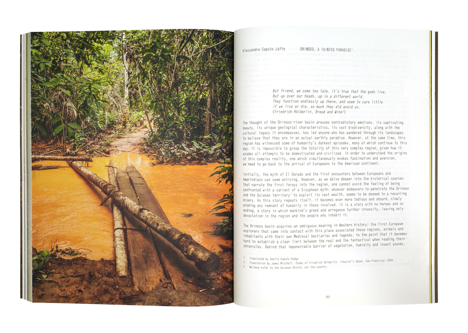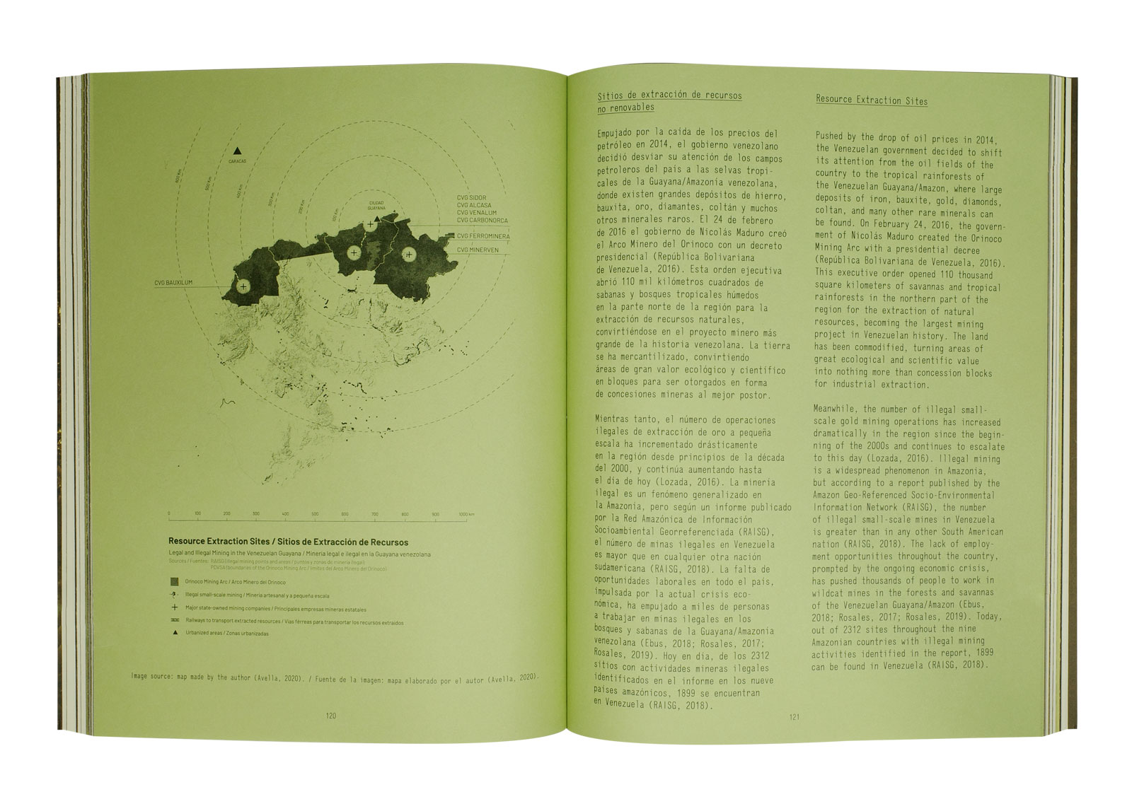 Conçue par l'artiste vénézuélienne Ana Alenso, basée à Berlin, cette publication est le résultat de sa recherche artistique pour l'installation Lo que la mina te da, la mina te quita en 2020. L'installation a été commandée par Urbane Künste Ruhr pour l'exposition Ruhr Ding: Klima (2021) et a également été présentée dans le cadre d'une exposition individuelle à la Galerie Wedding à Berlin en 2020. Parmi les principaux contributeurs à la publication figurent l'organisation environnementale SOS Orinoco et ACL/SPV, la cinéaste Alexandra Henao, l'indigène Pemón Kukuy, le poète Santiago Acosta, la chercheuse Alessandra Caputo Jaffe, l'architecte urbain Ricardo Avella et les artistes visuels Luis Arroyo, Sheroanawe Hakihiiwe, Esperanza Mayobre, Marco Montiel Soto, Lucía Pizzani et Christian Vinck.
