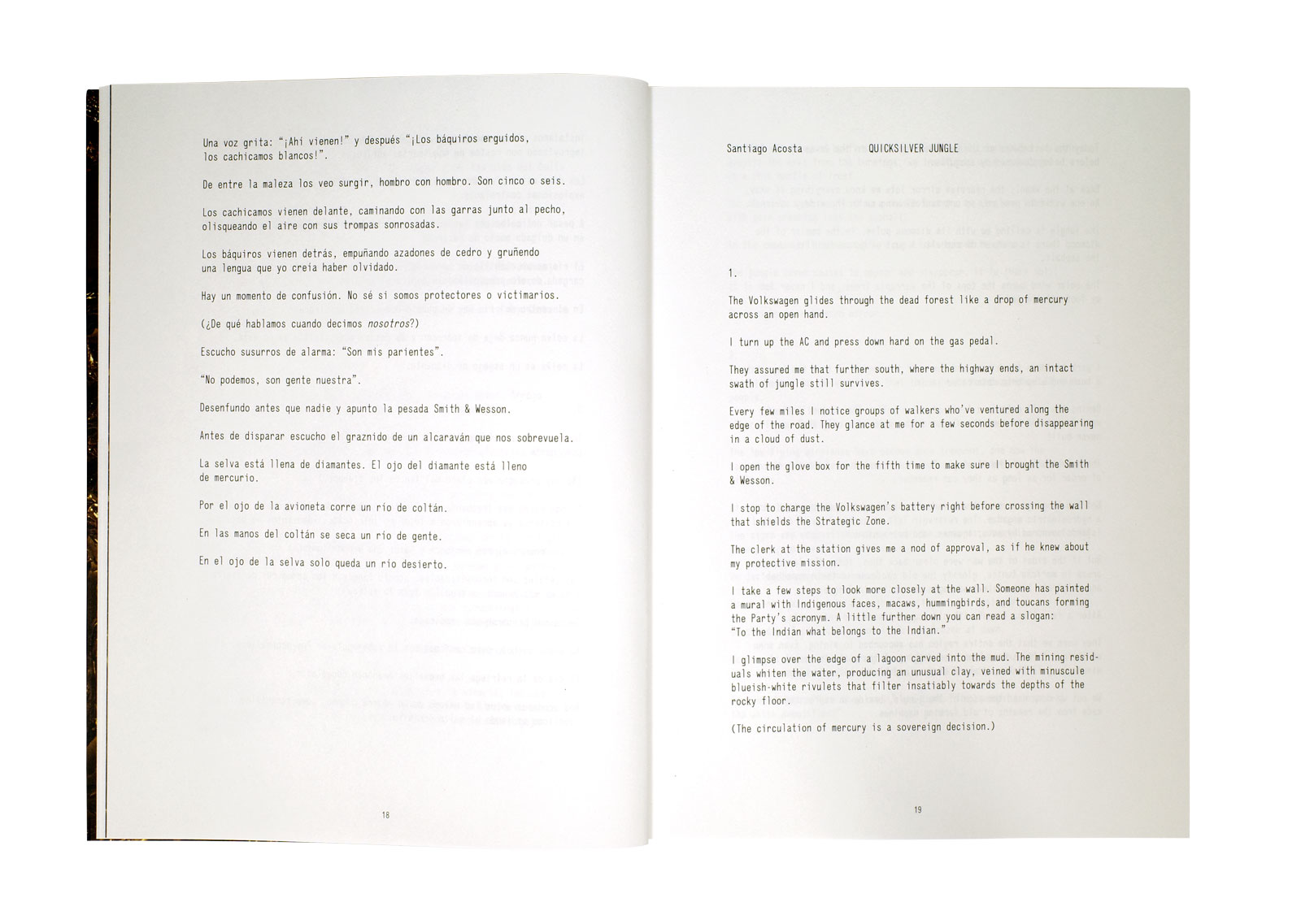 Tel un fleuve puissant qui coule et dévie de son cours, cette publication nous invite à un voyage pour déchiffrer la logique prédatrice à l'œuvre dans les mécanismes de l'exploitation minière de l'or et la dévastation socio-écologique qui en résulte dans les régions amazoniennes de Guayana et du Venezuela. Plus qu'un avertissement, What the Mine Gives, the Mine Takes présente une cartographie collective et sensible de ce conflit minier à travers une diversité de projets artistiques, de poèmes, d'essais, de diagrammes, de visions satellites et d'images documentaires.