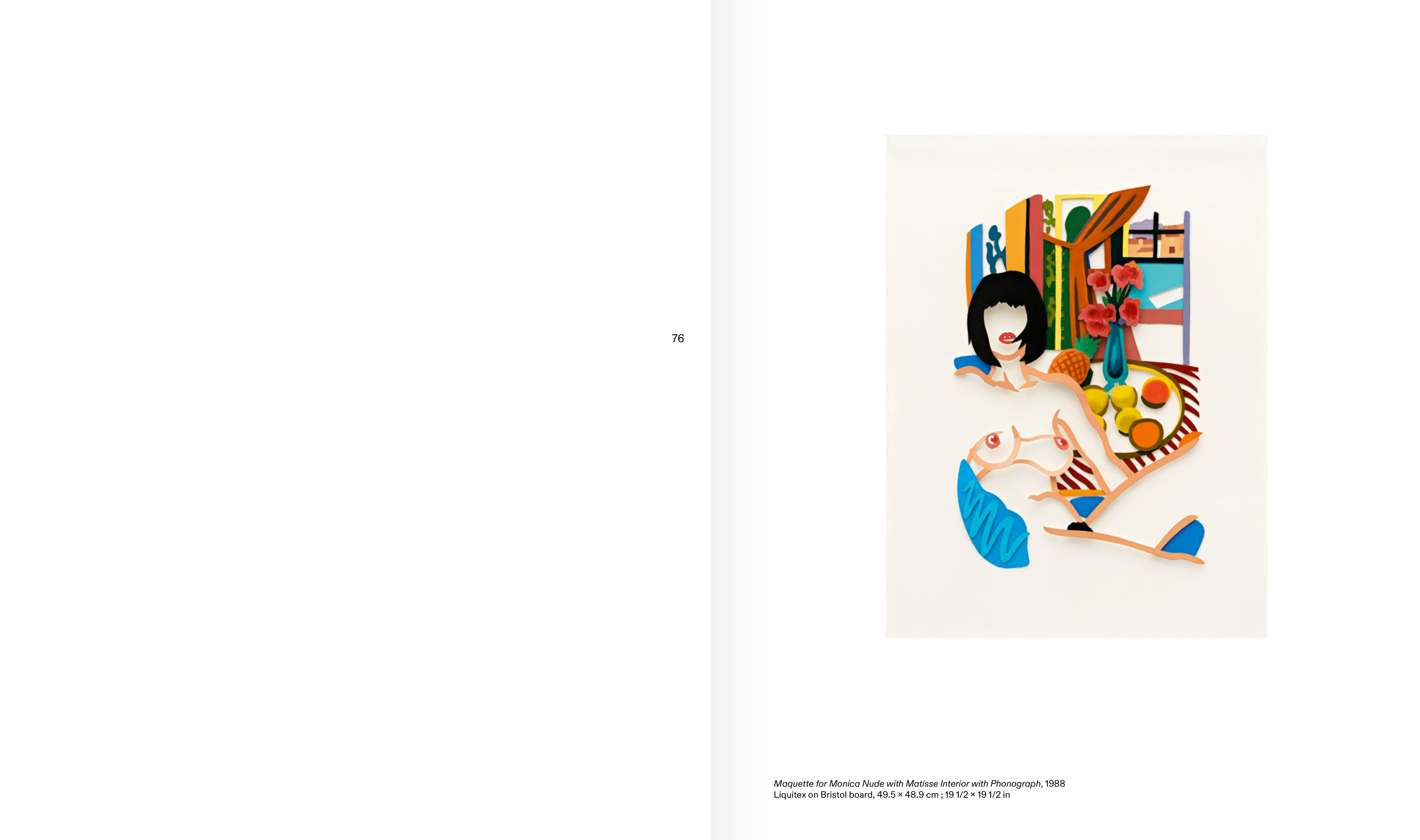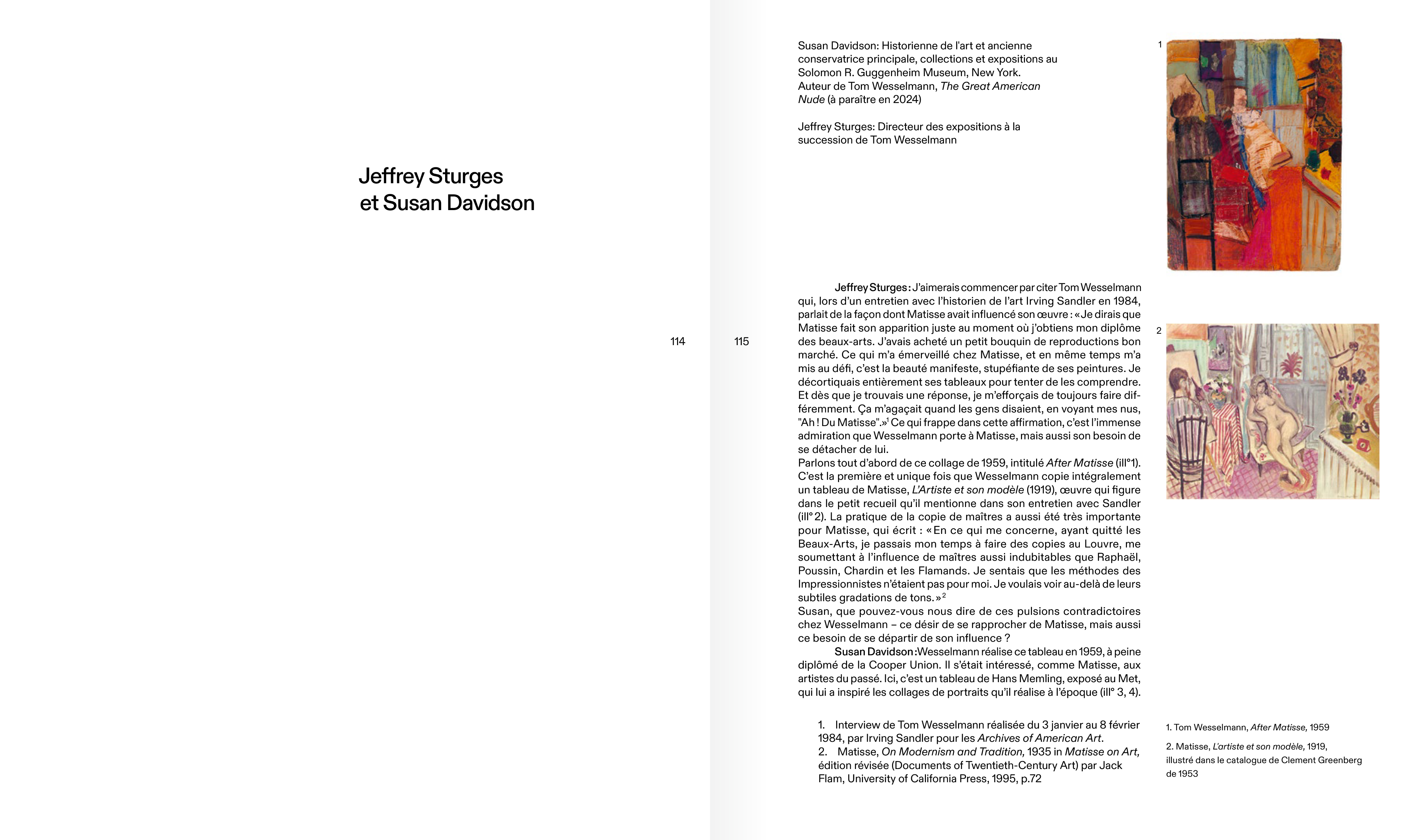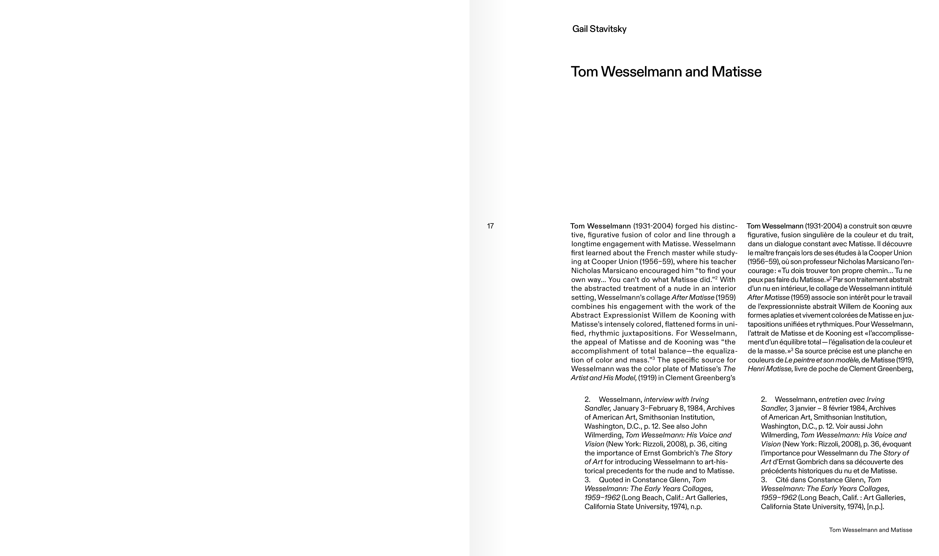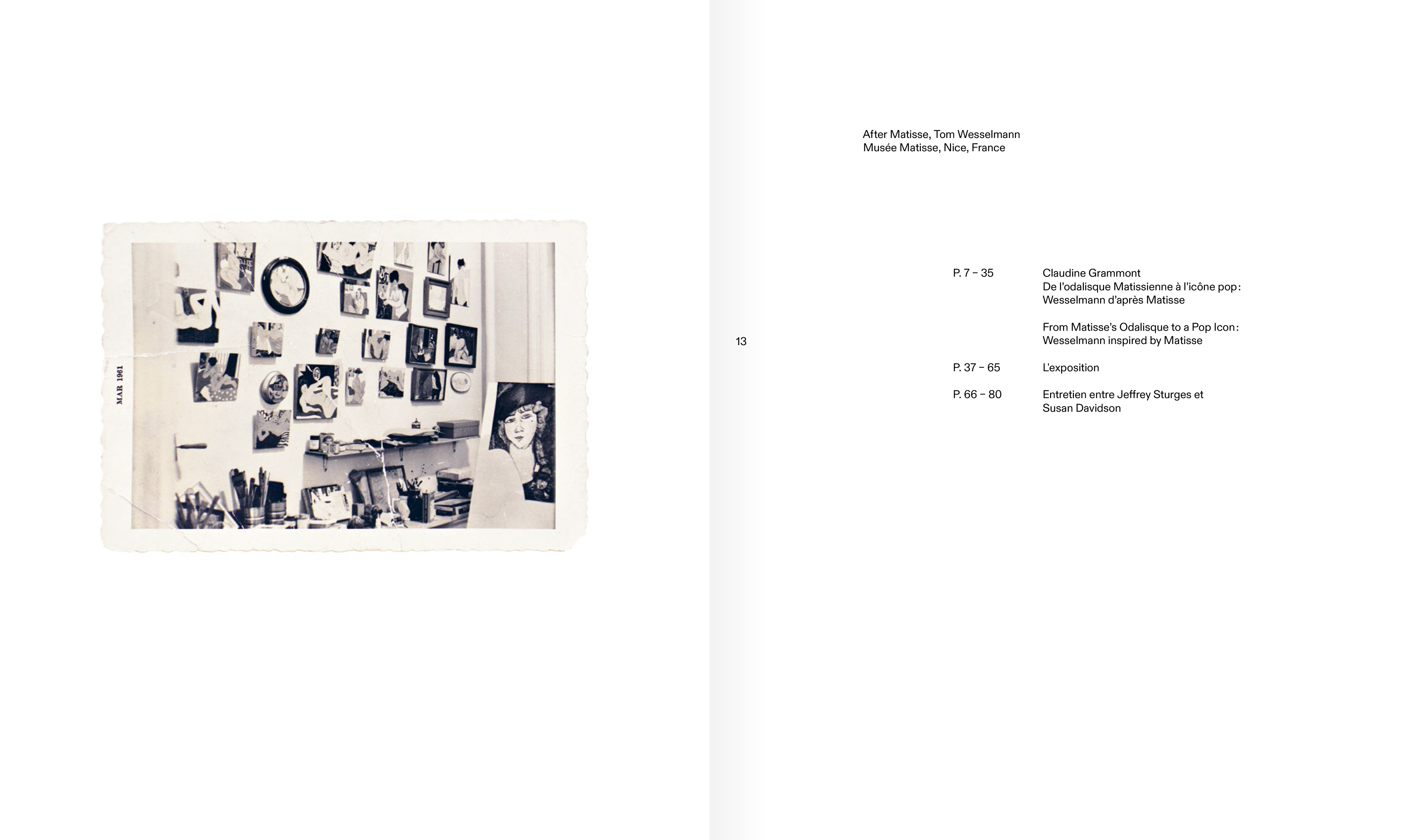 Ce catalogue, montrant Wesselmann à l'atelier, permet de comprendre sa technique élaborée du collage ou du dessin en volume qui attache toujours une grande importance à la question de l'échelle, des plus petits formats à de vastes réalisations. Quatre grands ensembles significatifs témoignent de ce dialogue entre ce grand artiste pop américain et Henri Matisse : les collages, les « Great American Nudes », les « Steel Drawings » et les « Sunset Nudes ». L'ouvage contient des essais de Gail Stavitsky et Claudine Grammont et un entretien avec Susan Davidson.