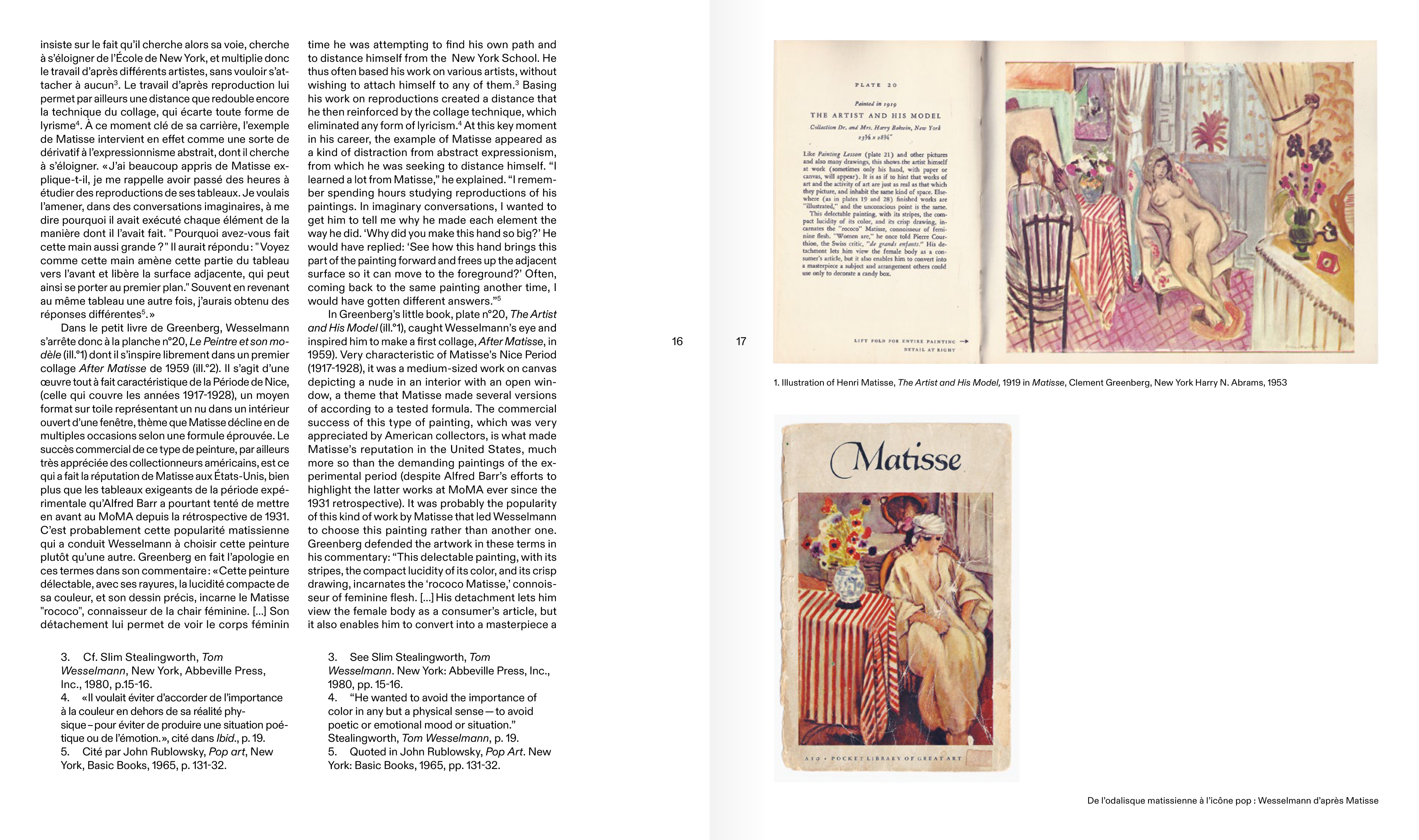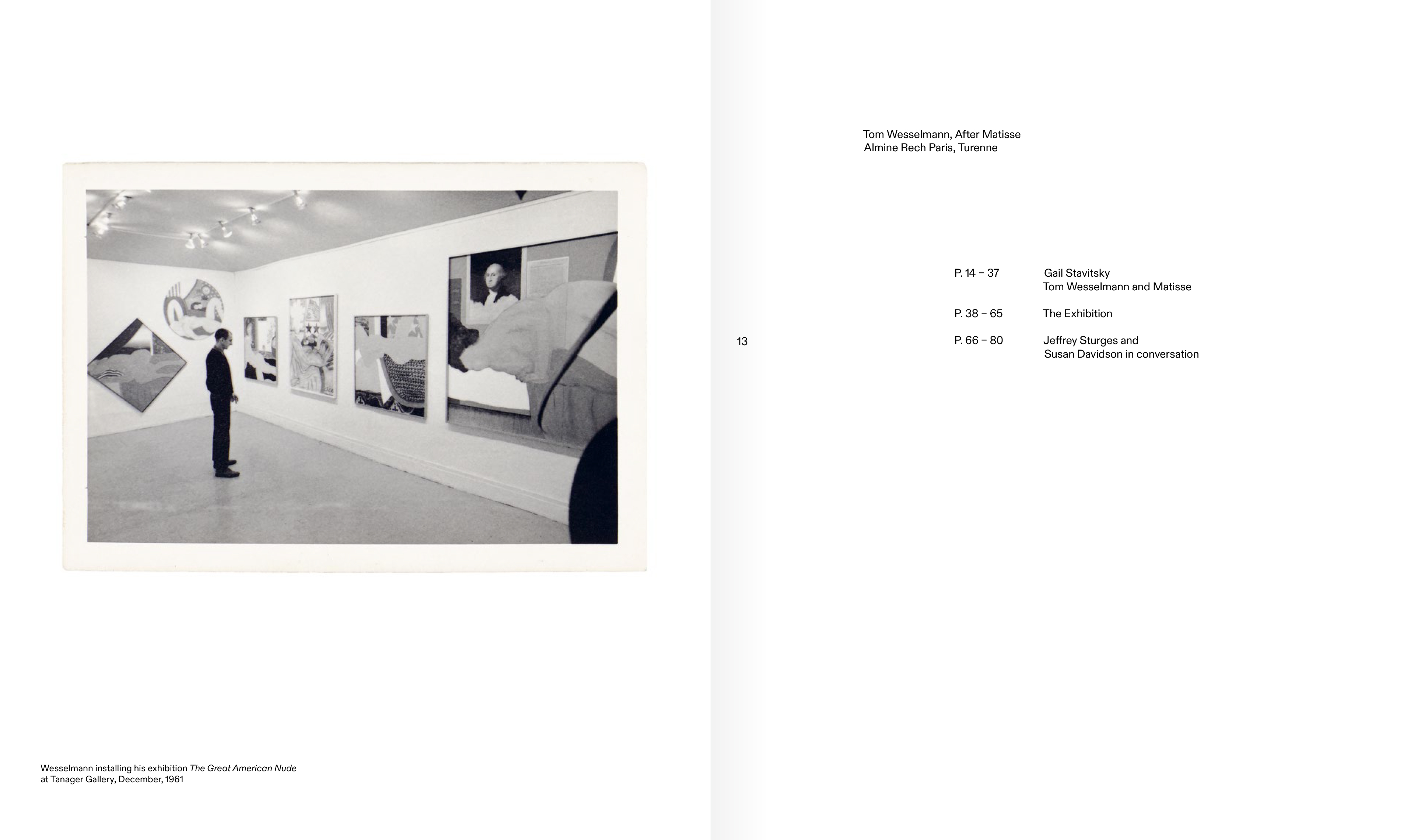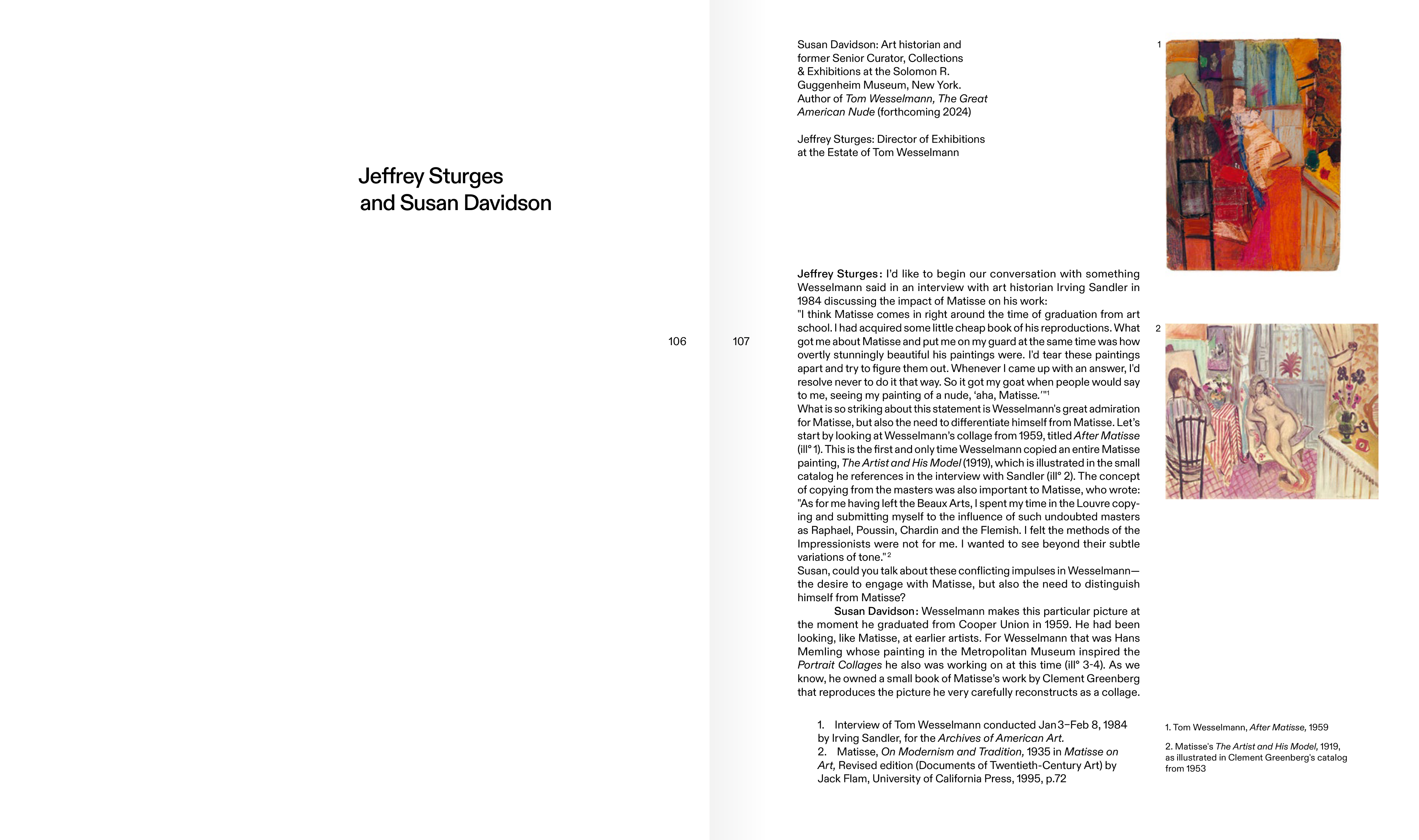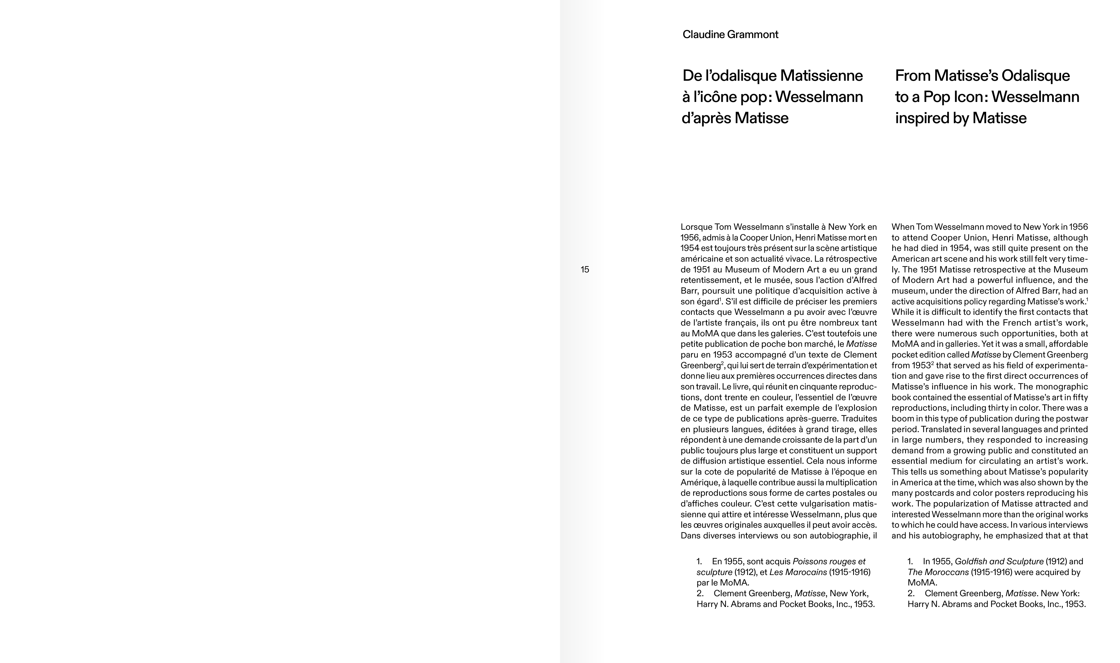 Ce catalogue, montrant Wesselmann à l'atelier, permet de comprendre sa technique élaborée du collage ou du dessin en volume qui attache toujours une grande importance à la question de l'échelle, des plus petits formats à de vastes réalisations. Quatre grands ensembles significatifs témoignent de ce dialogue entre ce grand artiste pop américain et Henri Matisse : les collages, les « Great American Nudes », les « Steel Drawings » et les « Sunset Nudes ». L'ouvage contient des essais de Gail Stavitsky et Claudine Grammont et un entretien avec Susan Davidson.