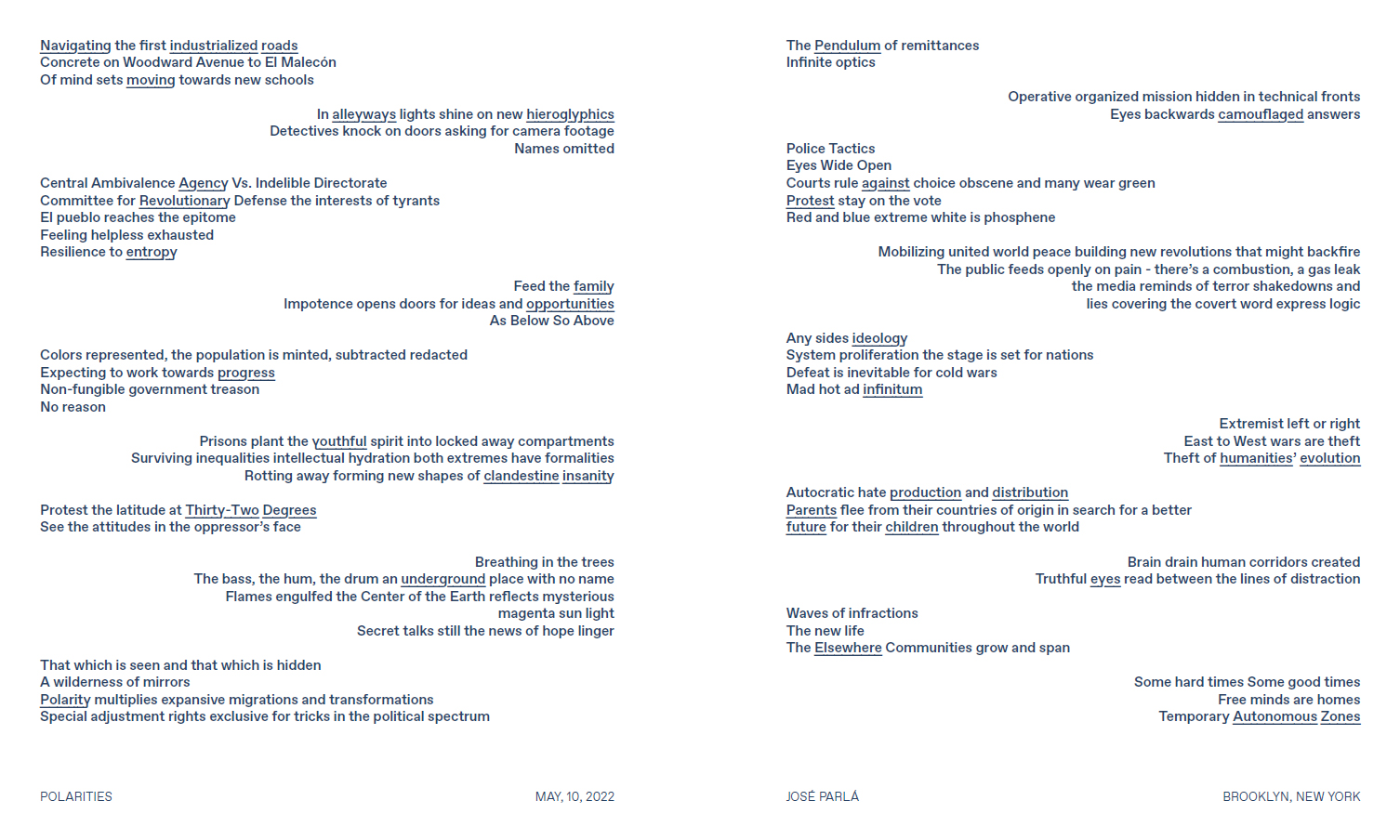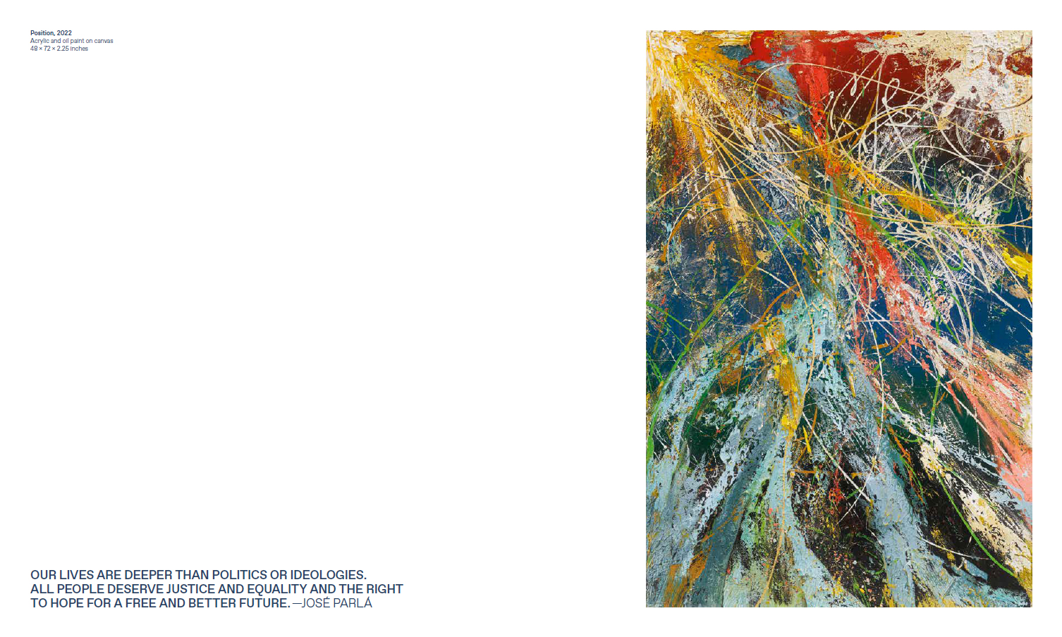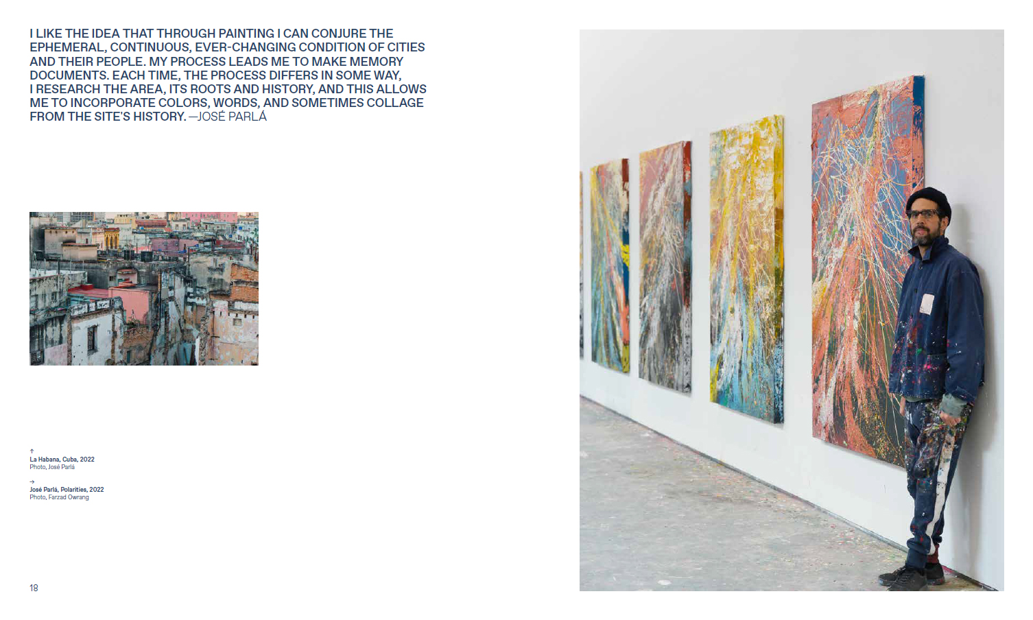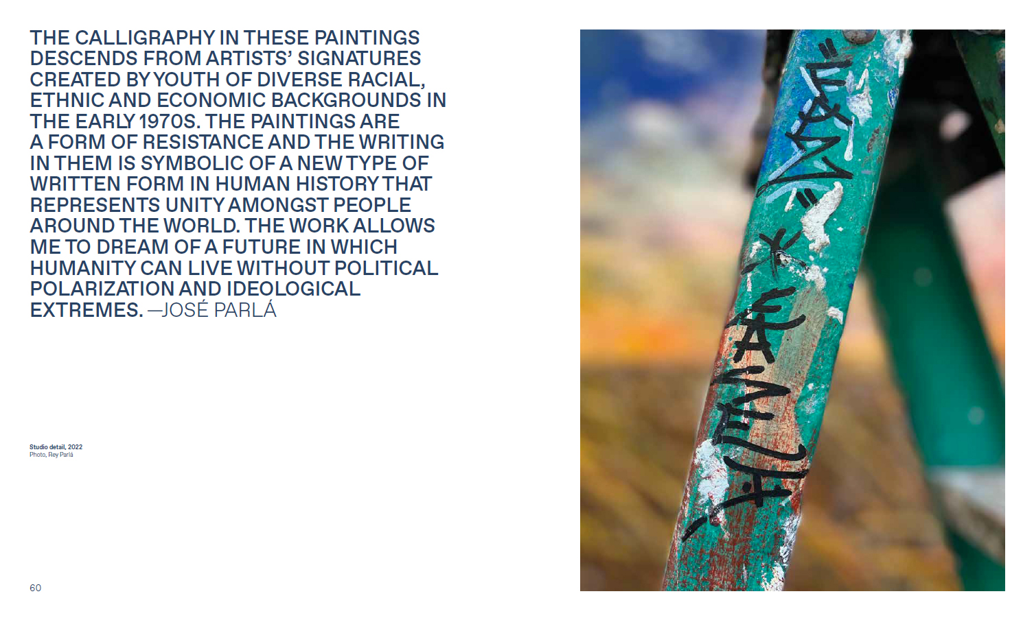 José Parlá (né en 1973 à Miami, vit et travaille à Brooklyn) est un artiste peintre cubano-américain multidisciplinaire, dont l'œuvre intègre la peinture, la peintures murale à grande échelle, la photographie, la vidéo et la sculpture. Il a commencé à peindre des murs sur la scène artistique underground de Miami au début des années 1980 et a étudié au Miami Dade Community College, à la New World School of the Arts et au Savannah College of Art & Design. Parlá est également connu pour son engagement communautaire en tant que cofondateur de Wide Awakes.
