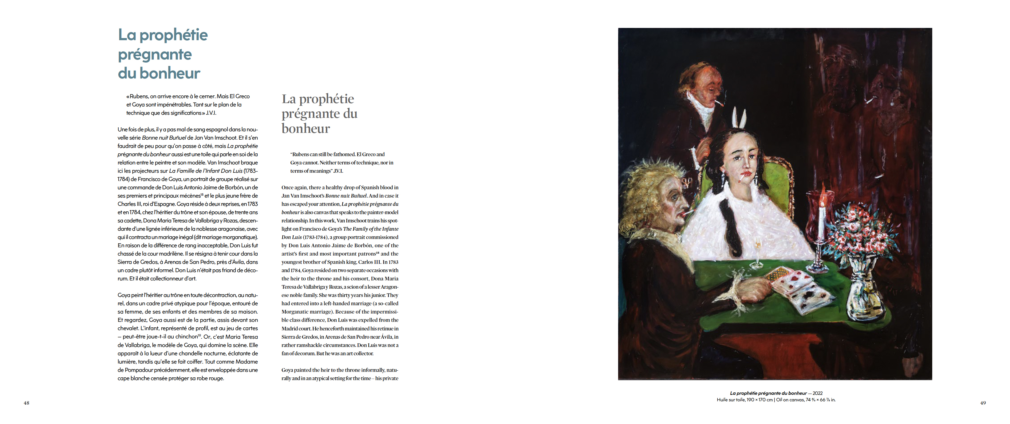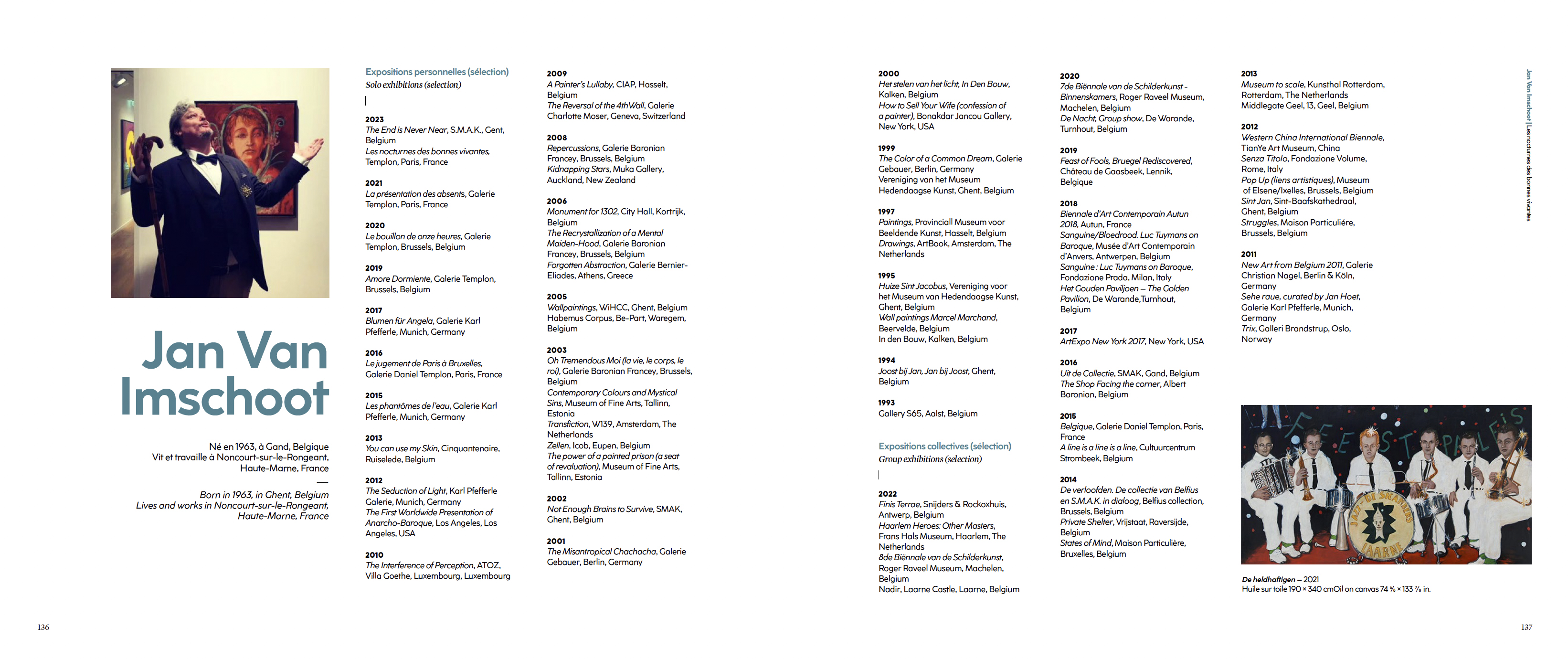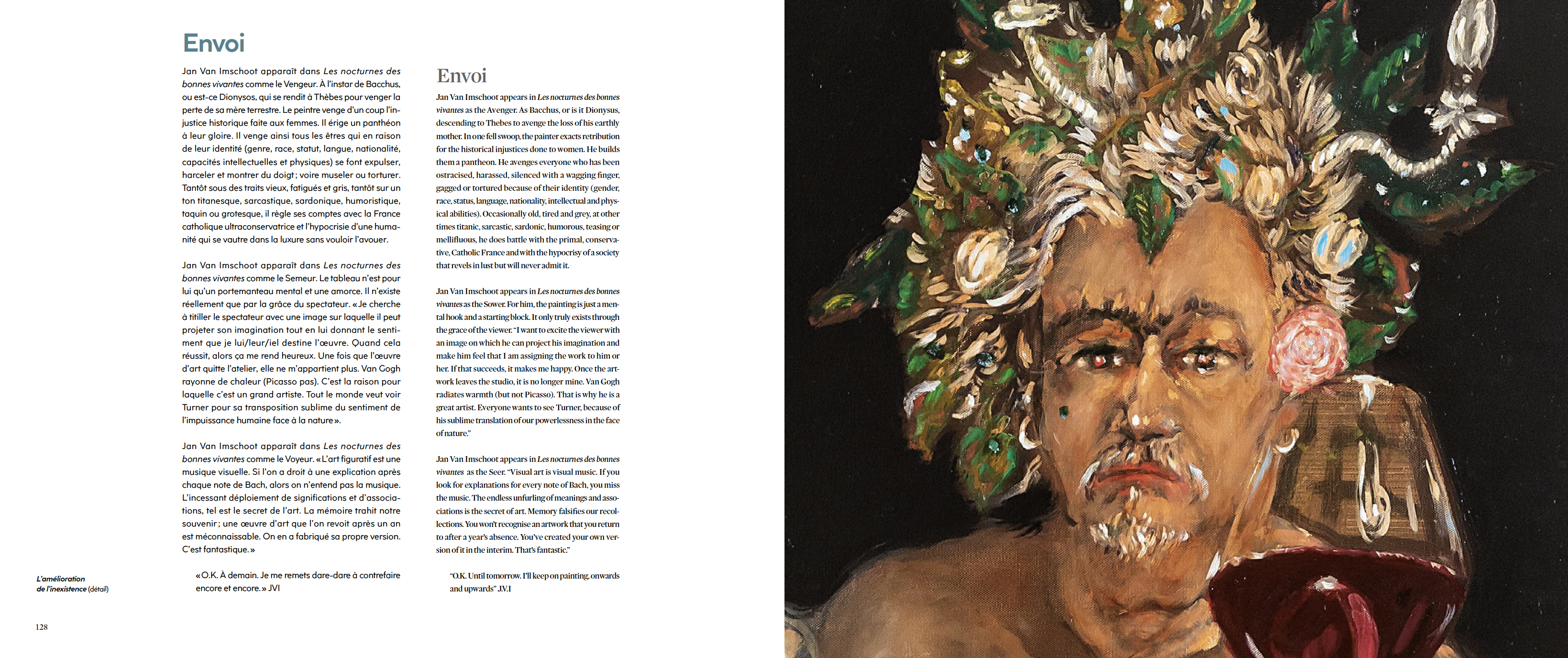 Jan Van Imschoot installe ses personnages, décors et narrations dans les marges de l'Histoire, à coup de perspectives recomposées, de tons forcés, de corps en mouvement et d'un coup de pinceau qu'il qualifie d' « anarcho-baroque ». Les nocturnes des bonnes vivantes, nouvelle série flamboyante et jubilatoire, est dédiée à son propre panthéon des grandes figures féminines marquantes de l'Histoire.