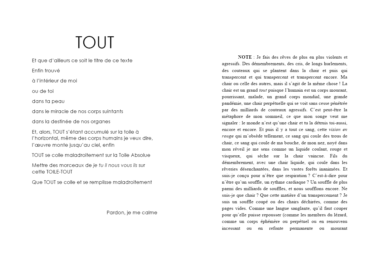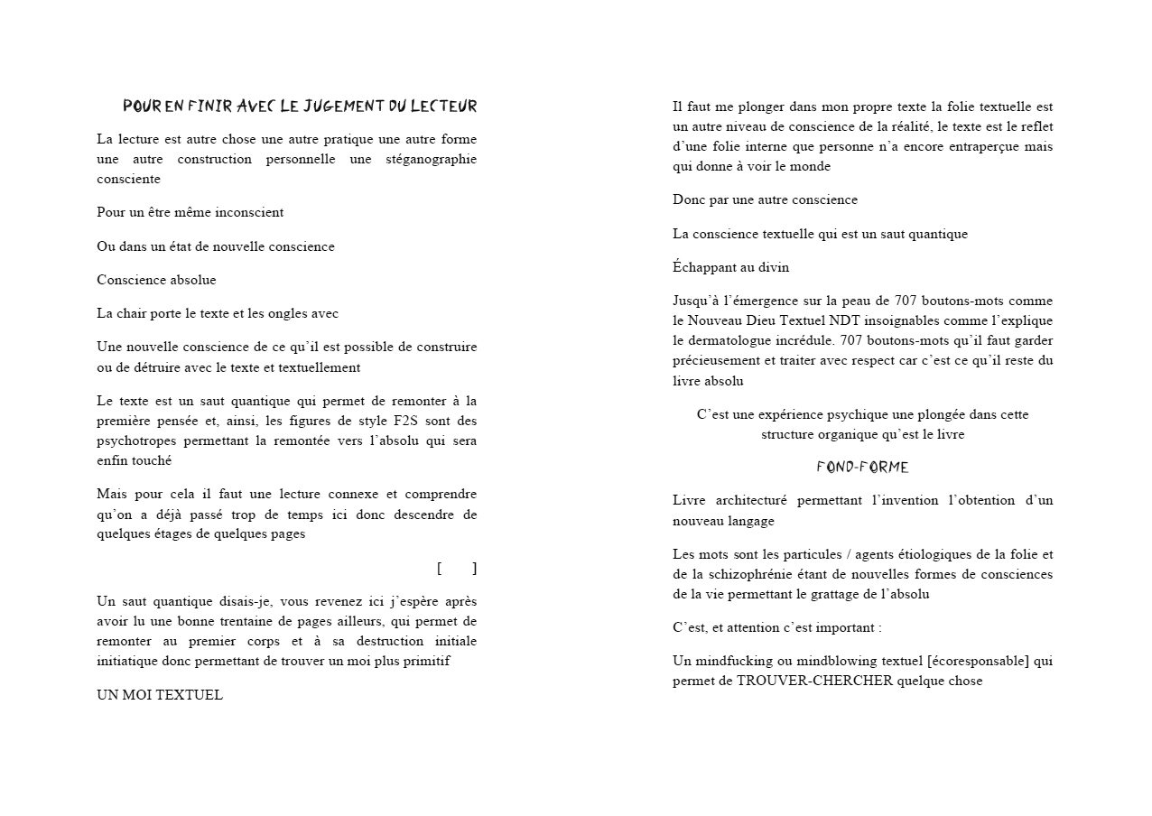 Un livre écrit entre 2014 et 2023, qui s'ouvre, se ferme ou se révulse à n'importe quelle page, composé de multiples fragments éparpillés, comme des boutons d'acné sur un visage. Des lambeaux poétiques, des idées, des réflexions, des pièces, des partitions, des poèmes visuels, des haillons textuels. Une interrogation viscérale sur ce qu'un livre peut ou ne peut être, sur ce qu'il ne doit pas faire, et sur ce qu'il construit-déconstruit dans le corps du lecteur. Un livre qui se construit dans sa déconstruction. Un livre qui se tire une balle dans le pied et en jouit. Un livre qui se coupe une paupière avec une lame de rasoir et y colle un pansement sémantisé. Un livre qui s'inachève, se désagrège et se décompose maladroitement. Un livre qui s'exaspère. Un livre dont je ne suis pas le héros. Un livre où le lecteur est/hait l'œuvre.