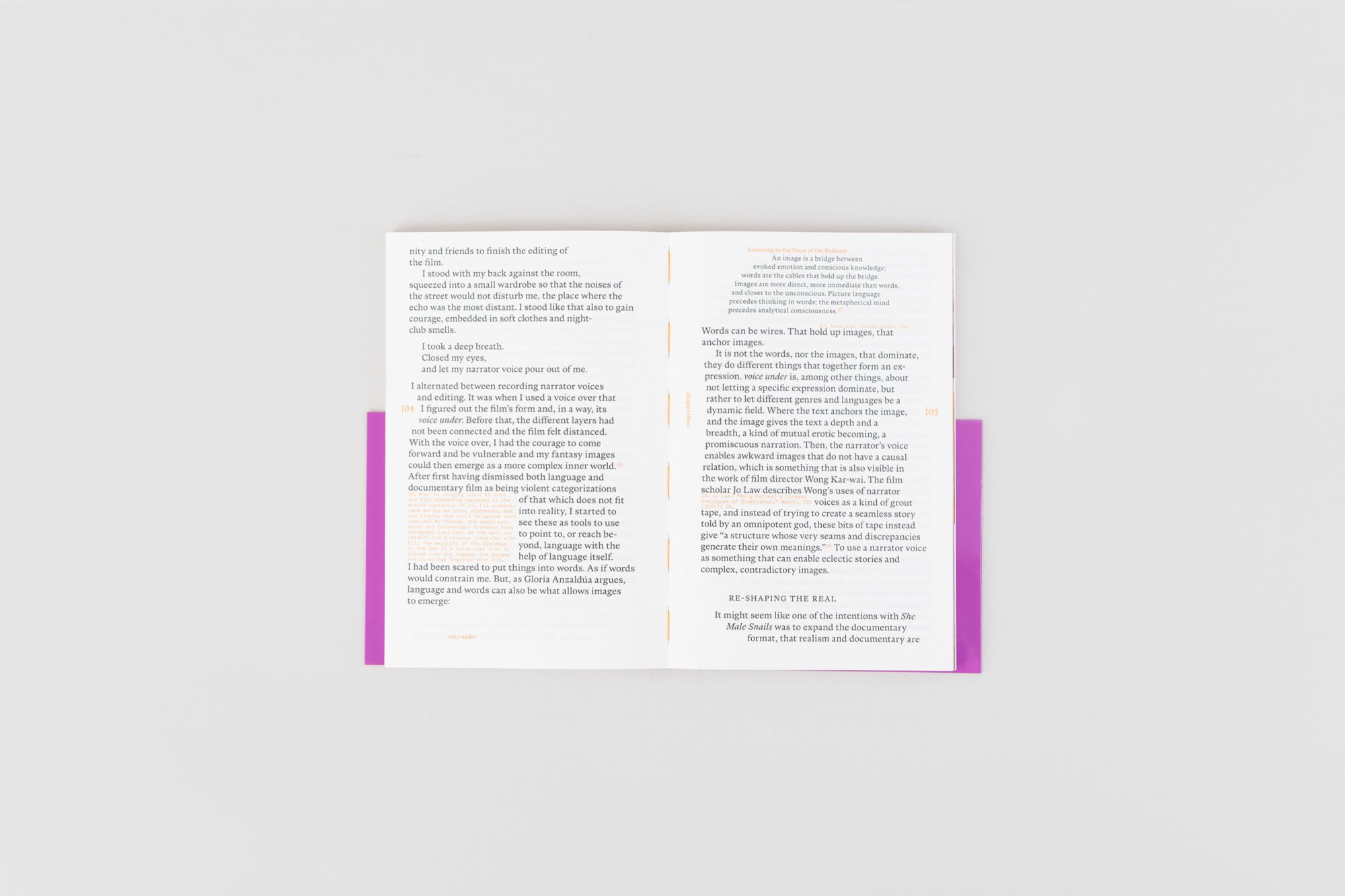 voice under à travers des rencontres, avec des exemples tirés de la production cinématographique d'Ester M. Bergsmark mais aussi d'autres cinéastes et artistes (Wu Tsang, Janis Rafa, Chantal Akerman, Wong Kar-Wai, Trinh T. Minh-ha, May Zetterling, Vika Kirchenbauer, Andrei Tarkovsky, Apichatpong Weerasethakul, Carolee Schneemann, Derek Jarman, etc.), ainsi que des interprétations plus théoriques des corps, du genre, des expériences trans, du désir, de la violence et du traumatisme. L'intention est d'ouvrir un registre sensoriel plus large à la fois dans la création et l'expérience du film en examinant de près, en interrogeant et en jouant avec différentes conventions cinématographiques autour de la vérité, de l'authenticité, de la narration, du visuel et du visible.