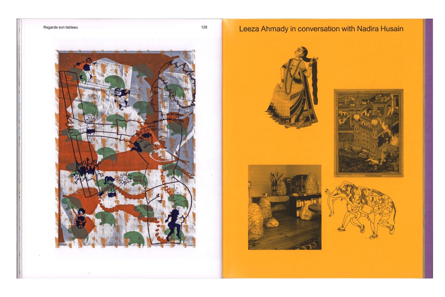 est une artiste française d'origine indienne installée à Berlin. Inspirée par les associations flottantes et inattendues que favorisent l'enfance et la rêverie, Nadira Husain mixe dans sa pratique picturale des motifs et des techniques issus des cultures traditionnelles indiennes et populaires occidentales avec lesquelles elle a grandi. Elle crée des peintures polyphoniques et hybrides où s'exprime dans l'entremêlement des lignes une diversité de références traitées sans hiérarchie et sans centre. Les dimensions domestiques, ornementales et spatiales se conjuguent à une approche féministe des sujets et des stratégies de représentation.